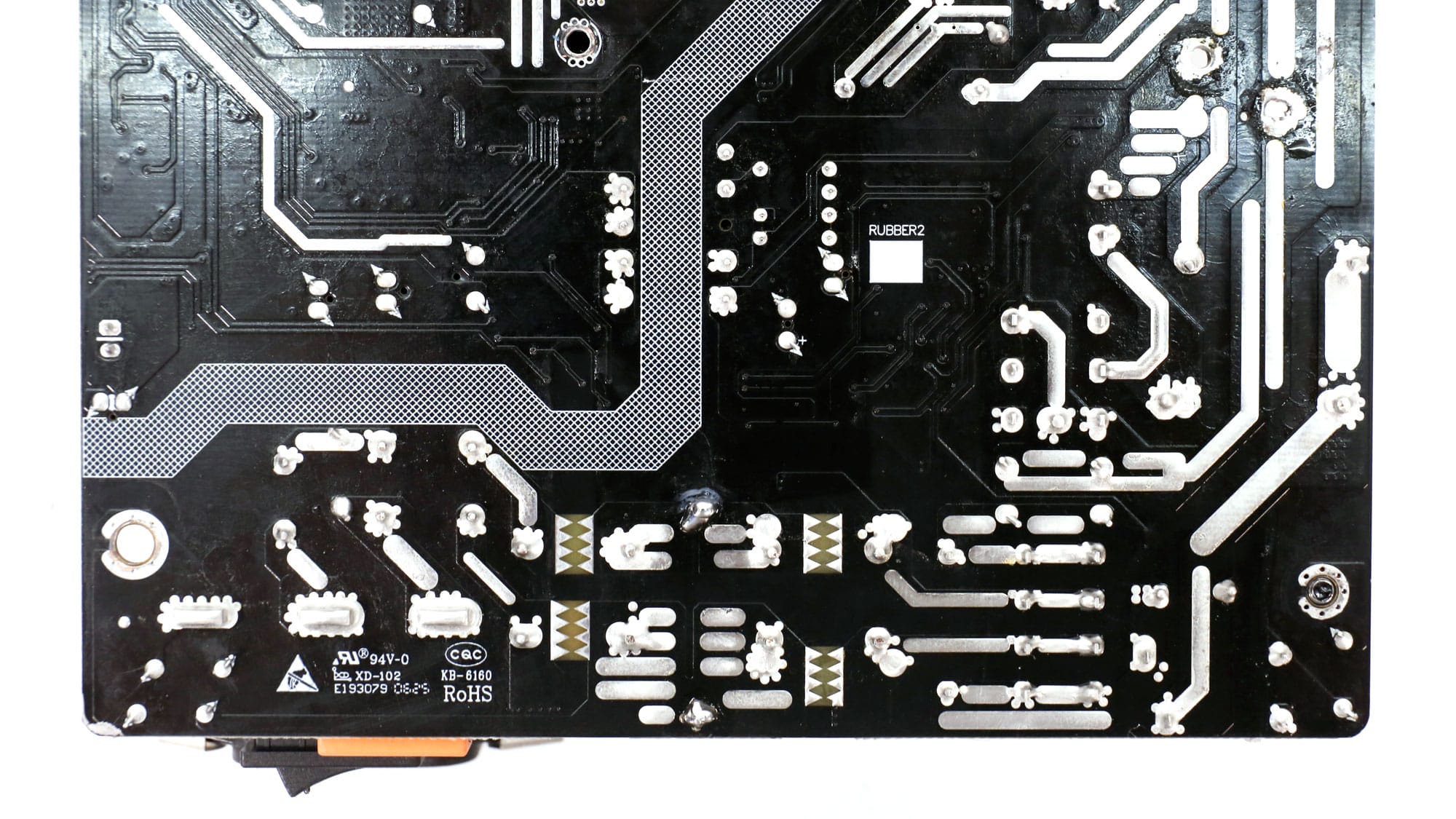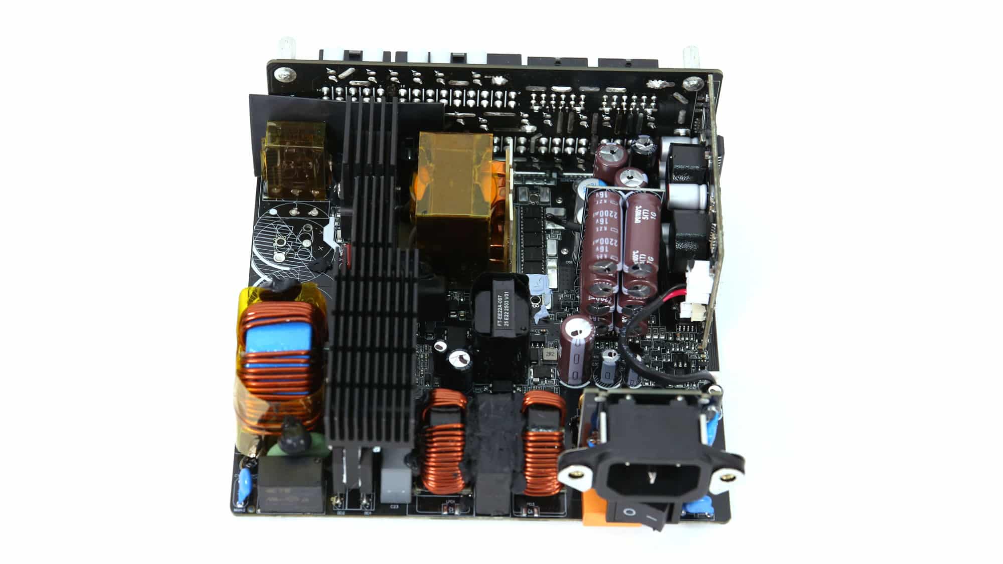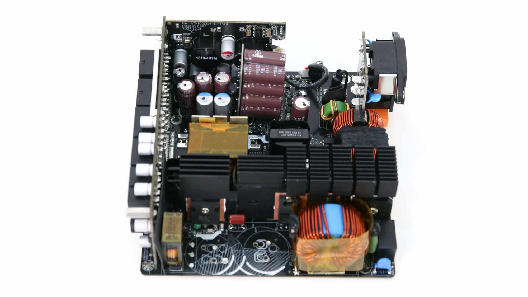 The OEM is Great Wall and the platform uses a contemporary design. I like the fact that the electrolytic capacitors on the secondary side are on the open, so airflow to them is unobstructed. The 12V FETs are soldered to the main PCB and positioned close to the main transformer to minimize energy losses. In contrast, the VRMs handling the minor rails are located on a daughter board situated on one of the PSU’s sides. The heatsinks on the primary side are large enough to allow for lower fan speeds; however, this is not the case for the secondary side. It would be ideal if the MCU digitally controlled the fan through PWM, but GW dropped that option since it would increase production costs.