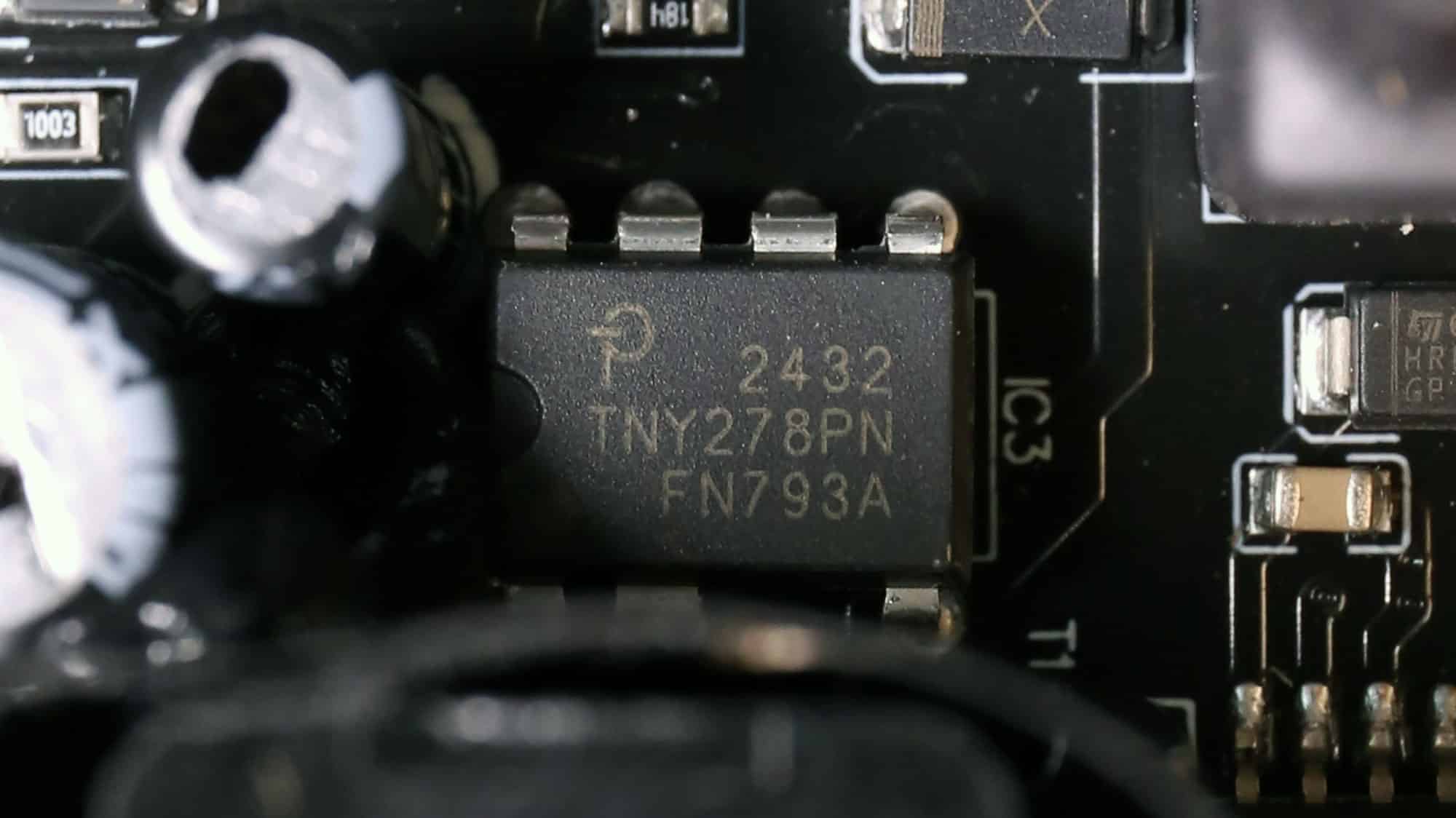 The standby PWM controller is a Power Integrations TNY278PN, and the secondary side rectifier is a STMicroelectronics STPS1045B.