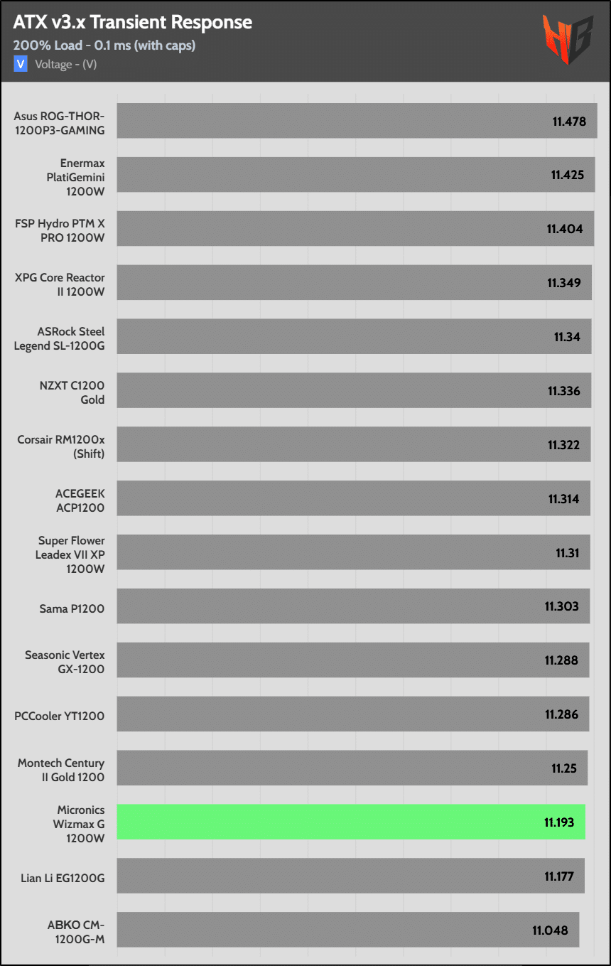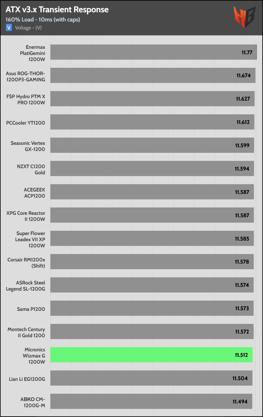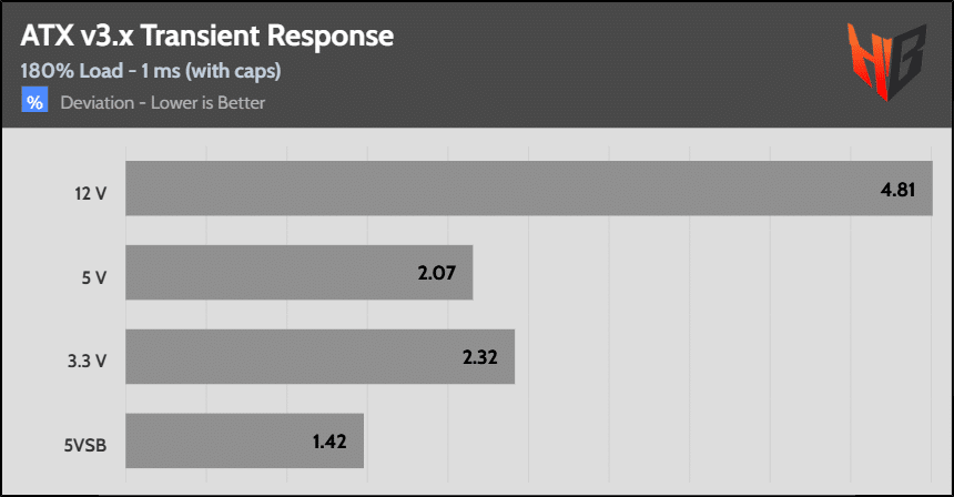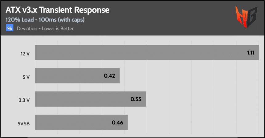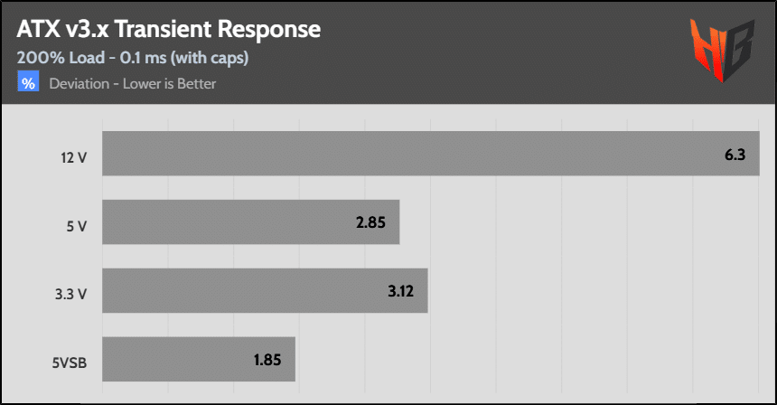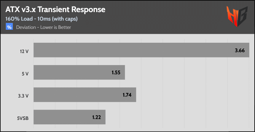 [Note] For PSUs without a 12+4 pin connector, the maximum applied load for the transient response tests is 150%, rather than 200%.The PSU passes all ATX v3.1 transient response tests, but the 3.3V rail drops below 3.2V in the 180% and 200% load tests.