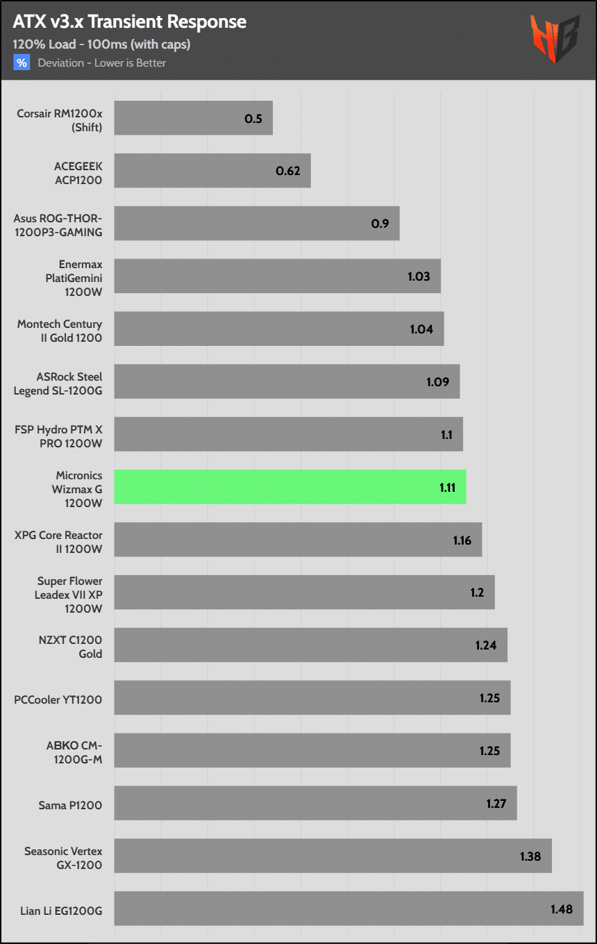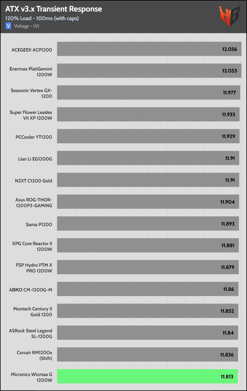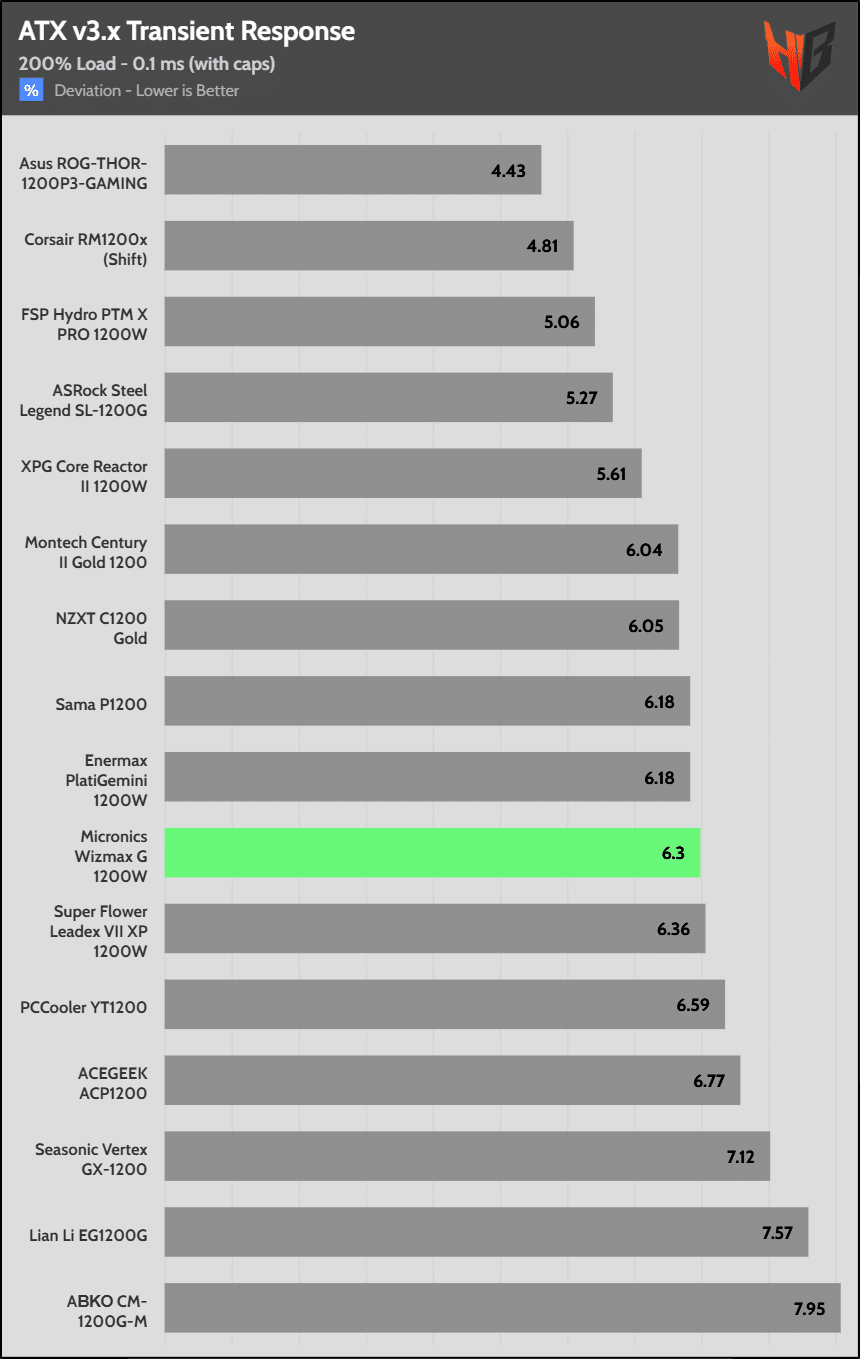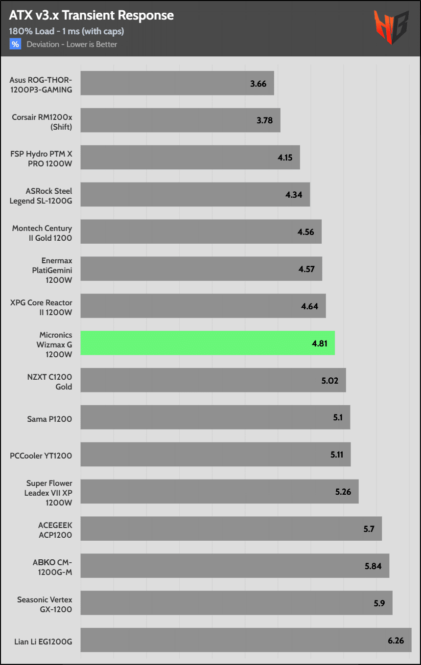 [Note] For PSUs without a 12+4 pin connector, the maximum applied load for the transient response tests is 150%, rather than 200%.The PSU passes all ATX v3.1 transient response tests, but the 3.3V rail drops below 3.2V in the 180% and 200% load tests.