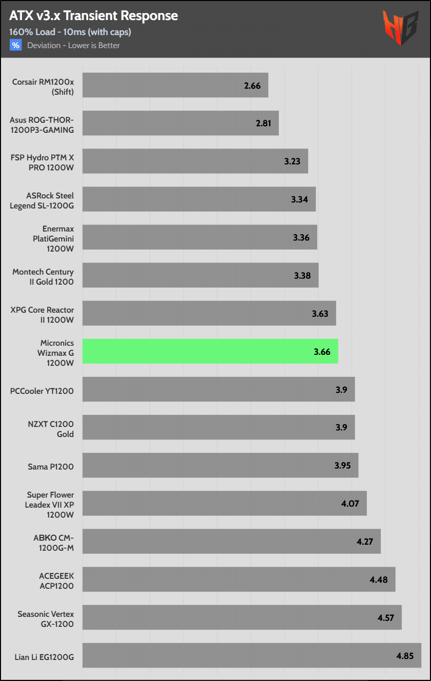 The transient response is mediocre at 12V, primarily due to the significant deviation during the first test, where the PSU’s resonant controller prioritizes efficiency over transient response. The 5V rail exhibits an average deviation, and the same is true for the 3.3V rail, which drops below 3.2V when a transient load is applied.