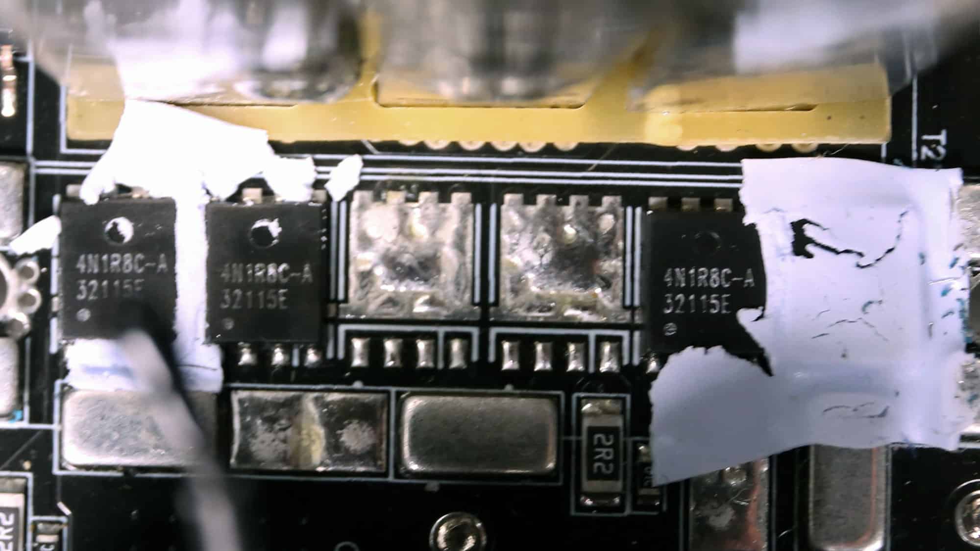 Four XSEMI XP4NA1R4CMT-A FETs regulate the 12V rail. They are installed on the business (top) side of the main PCB.
