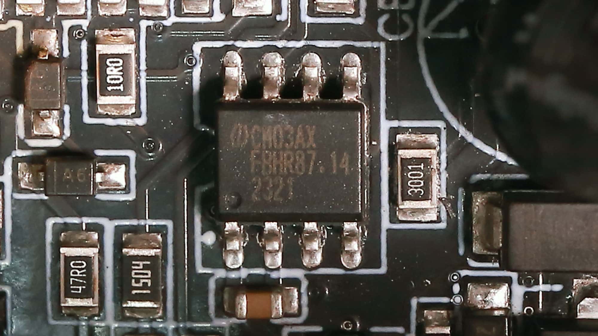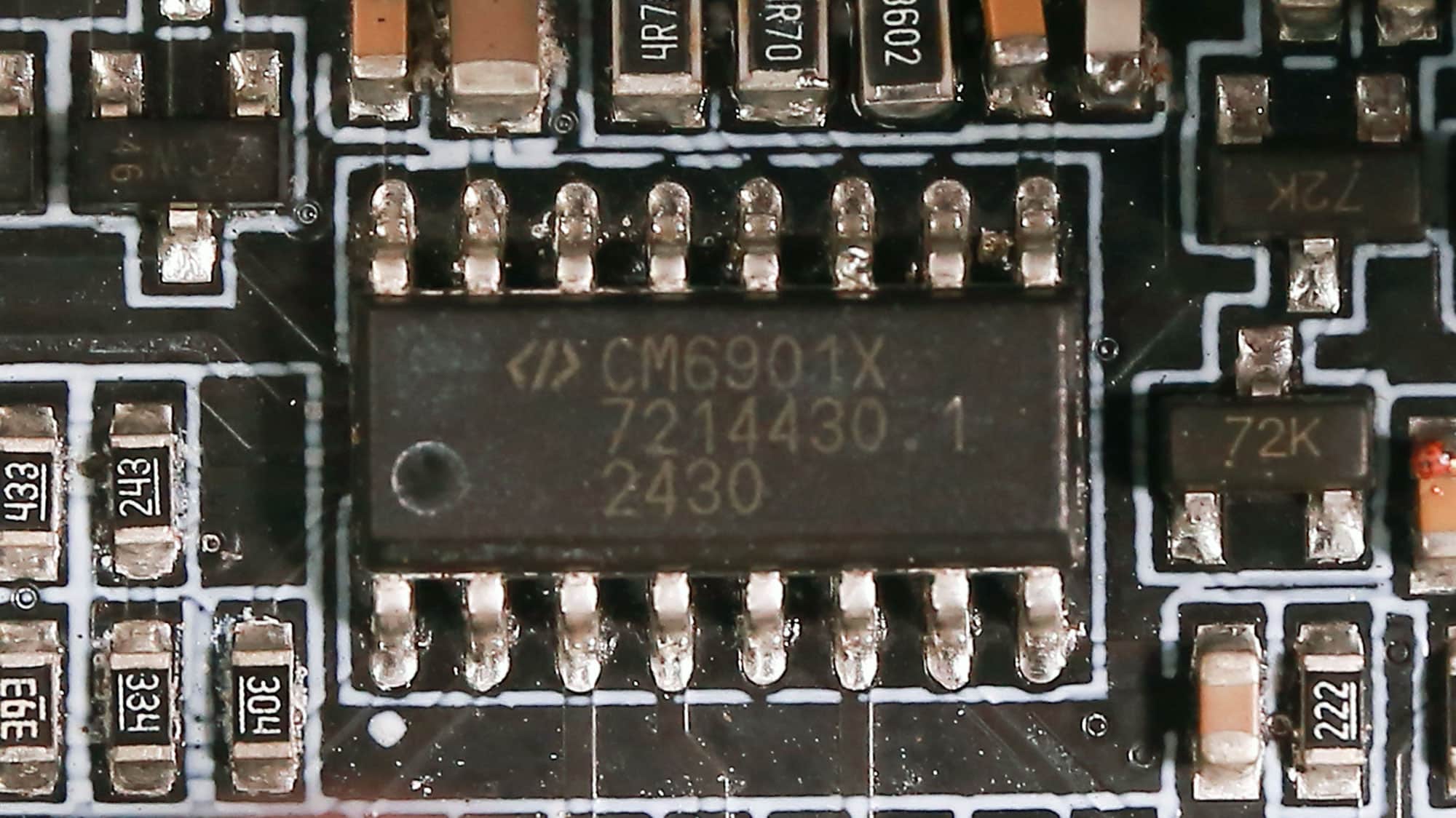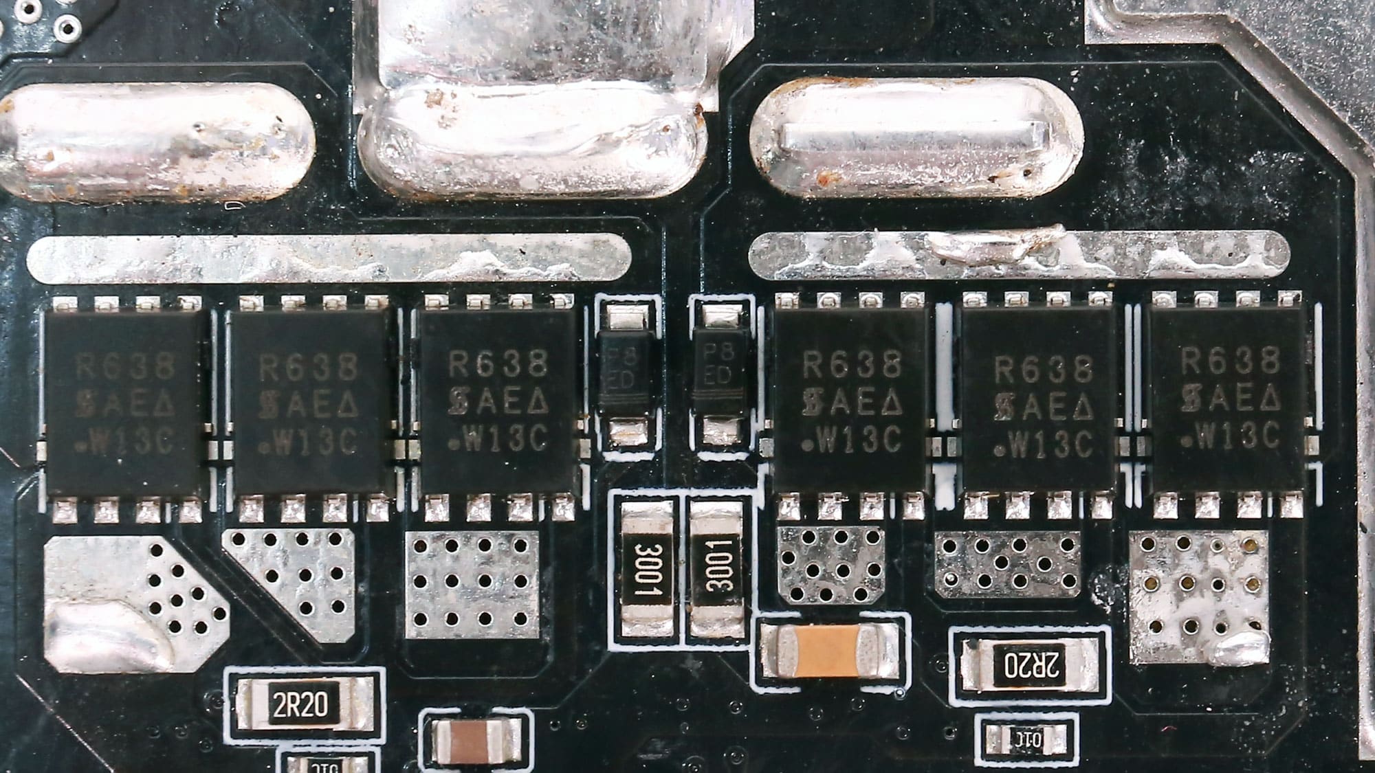 Six Vishay SiR638DP FETs regulate the 12V rail. They are installed on the solder side of the main PCB, and a vertical PCB on the other side transfers power to them, and also assists in their cooling.