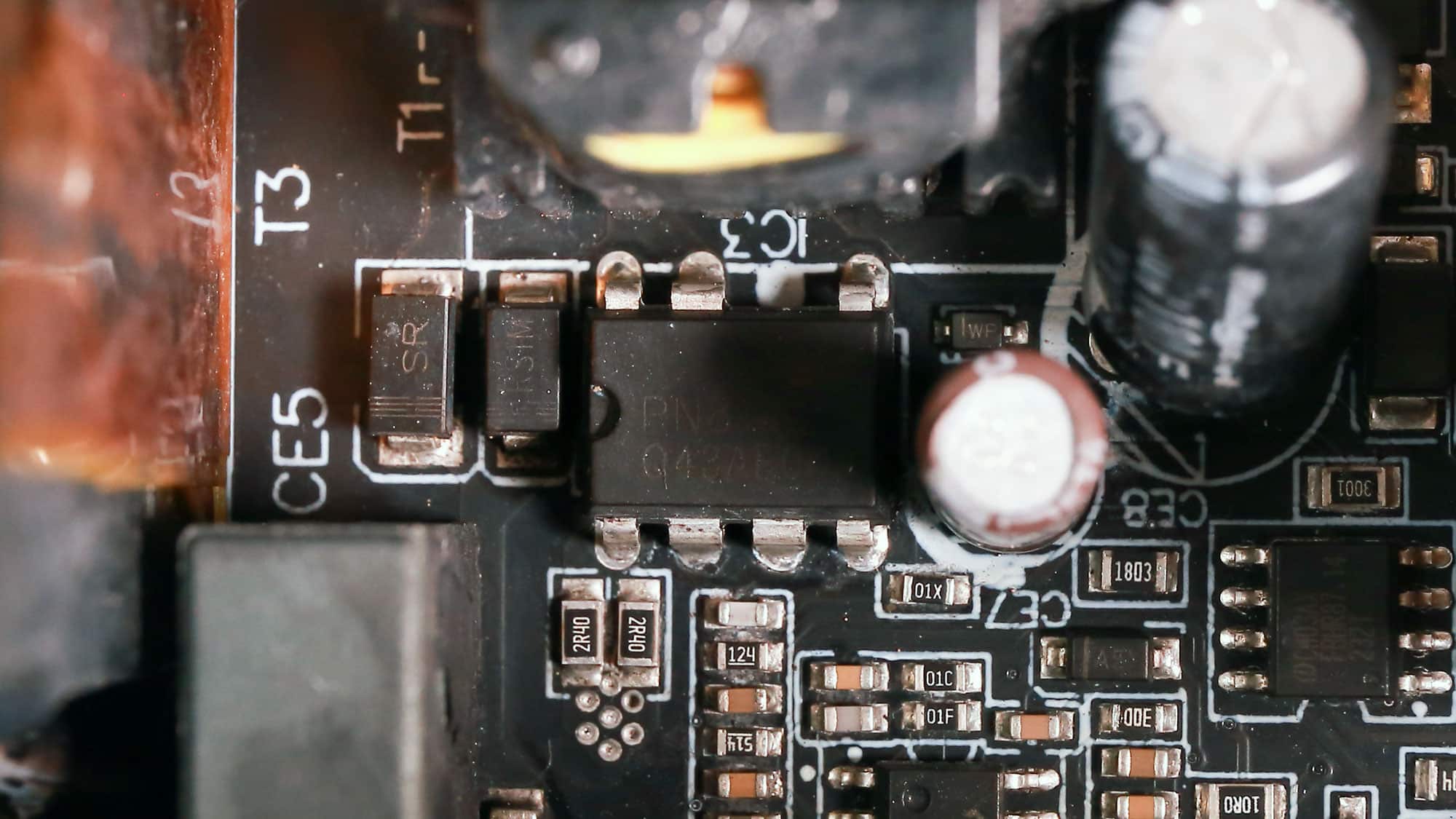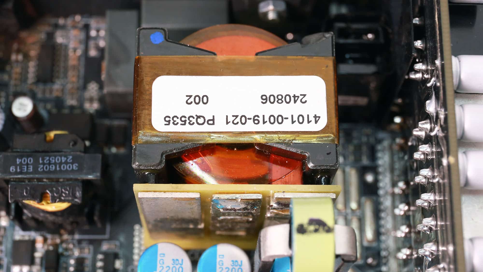 The OEM is Shenzhen Xinweiye Technology, and the platform features a clean design with ample room for adequate cooling, despite its small PCB. The main transformer is compact, occupying minimal space. Right next to it, the vertical PCB hosts the heatsinks and the power transfer traces to the 12V FETs, to drastically reduce the distance and, consequently, power losses. The capacitors on the secondary side are clear, allowing for unobstructed airflow, which boosts their lifetime due to the lower operating temperatures. The DC-DC converters handling the minor rails are also installed on a daughter board, at the side of the main PCB.