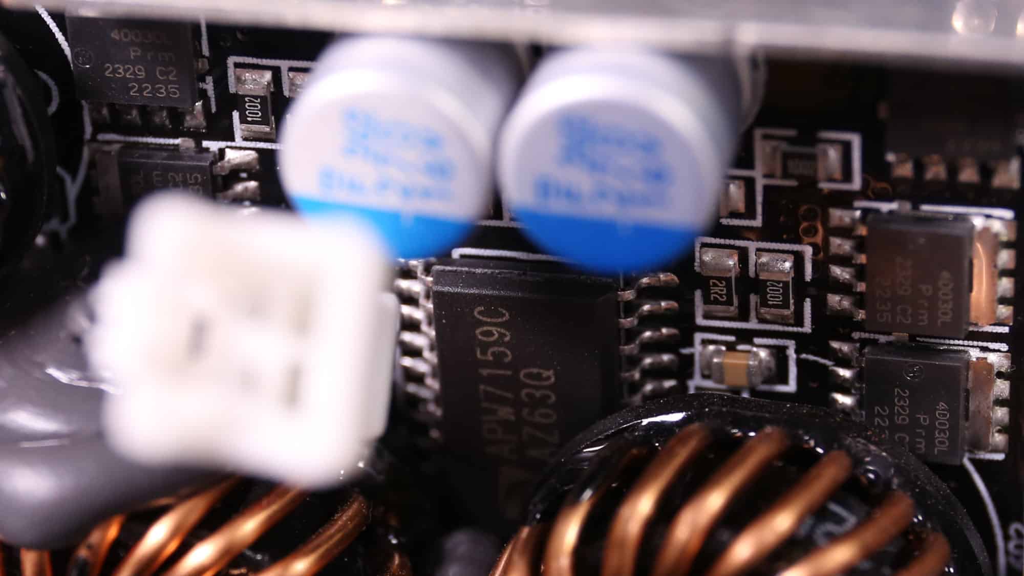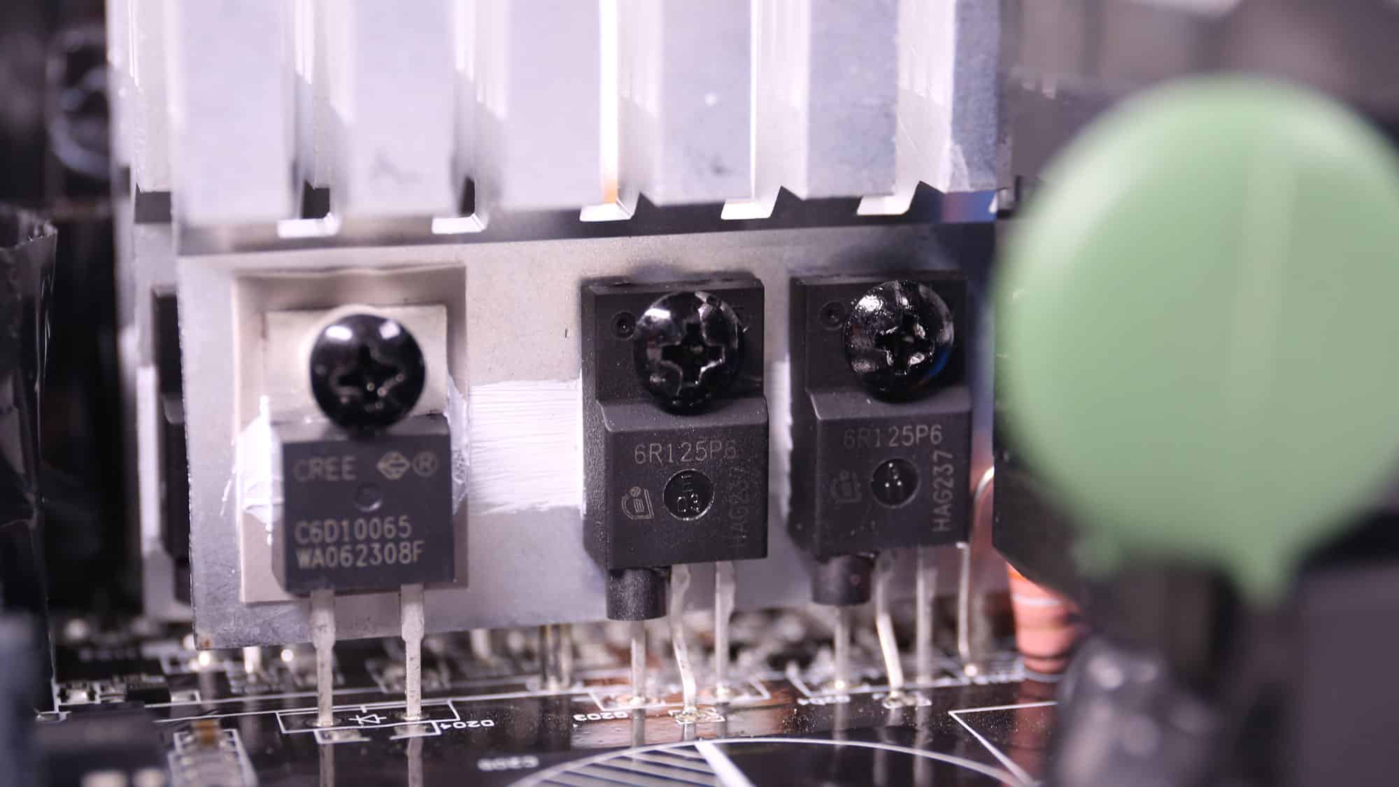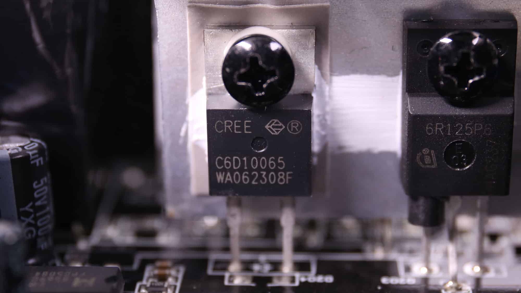 The APFC converter uses two Infineon FETs and a CREE boost diode. The bulk caps are by Chemi-con and offer a combined capacity of 890uF. They are rated for 2,000 h at 105 °C.