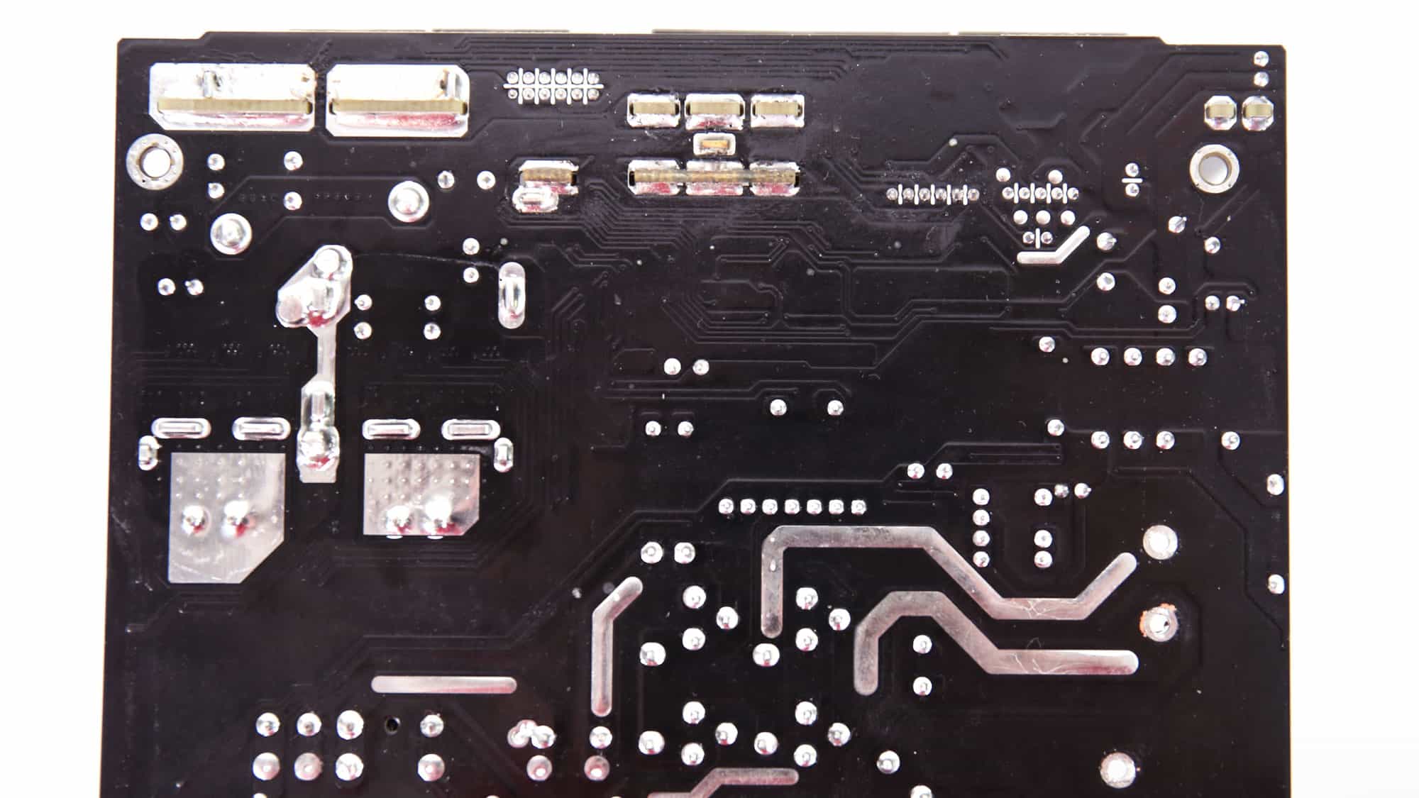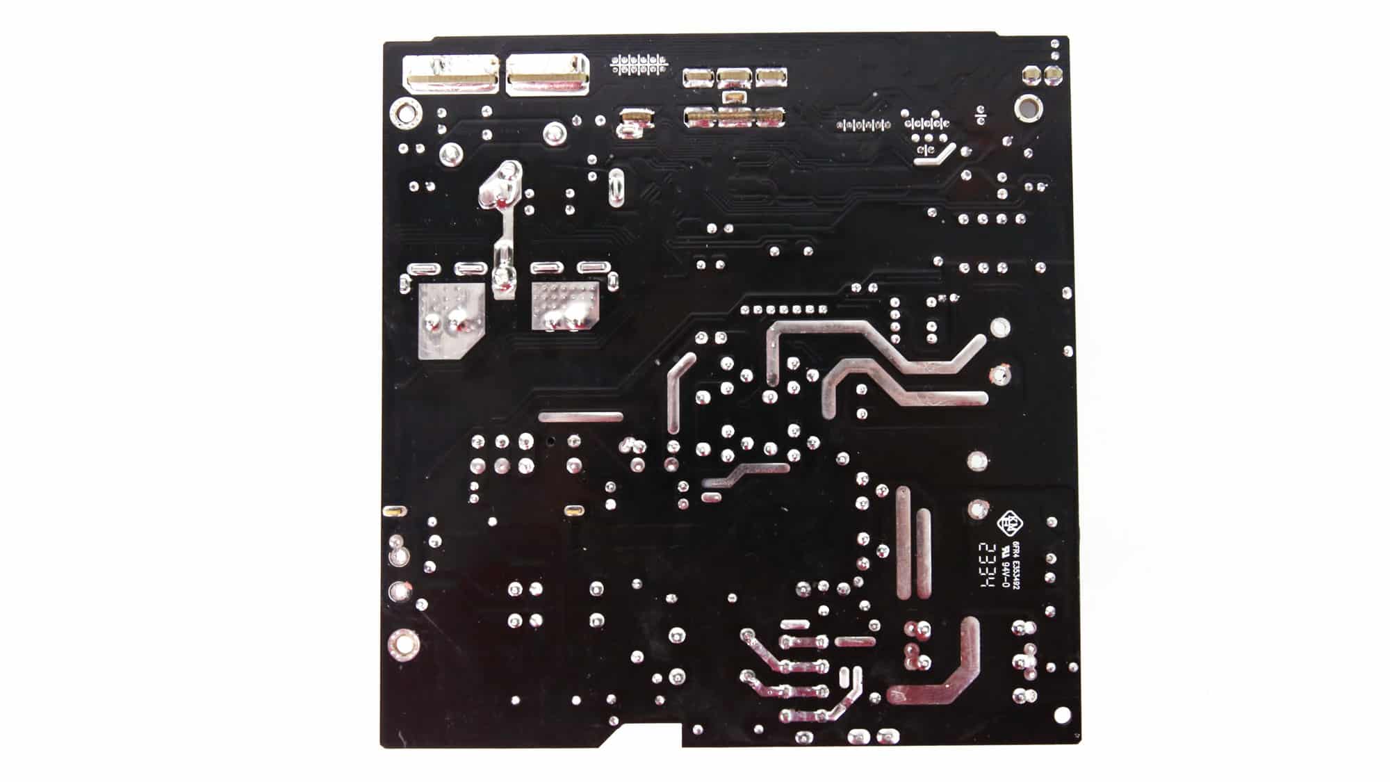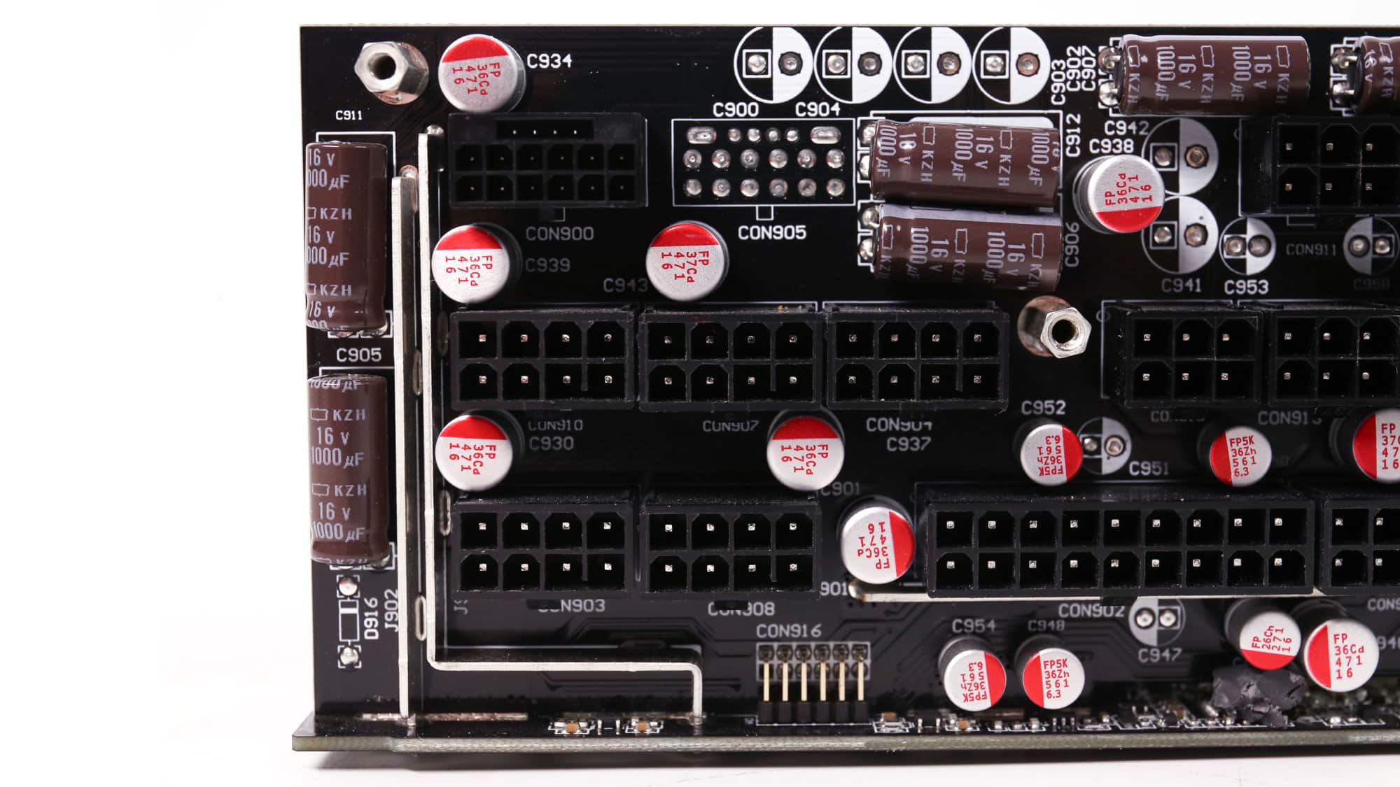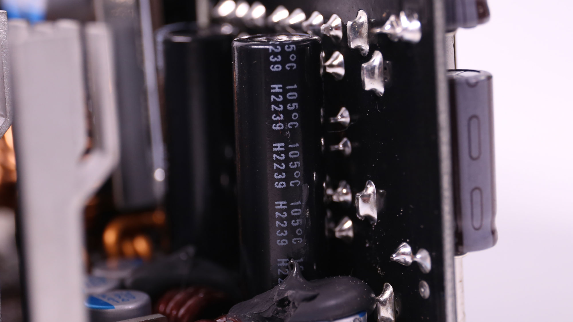 The APFC converter uses two Infineon FETs and a CREE boost diode. The bulk caps are by Chemi-con and offer a combined capacity of 890uF. They are rated for 2,000 h at 105 °C.