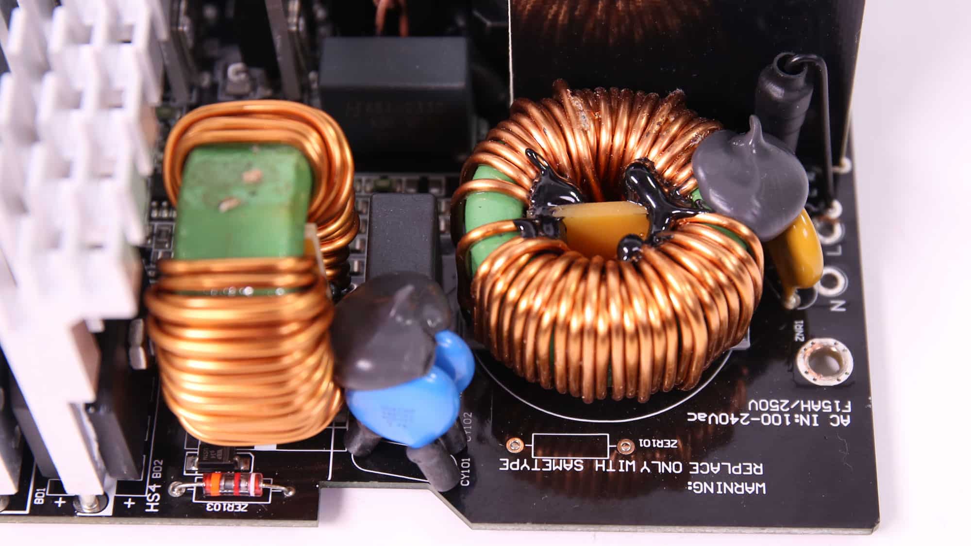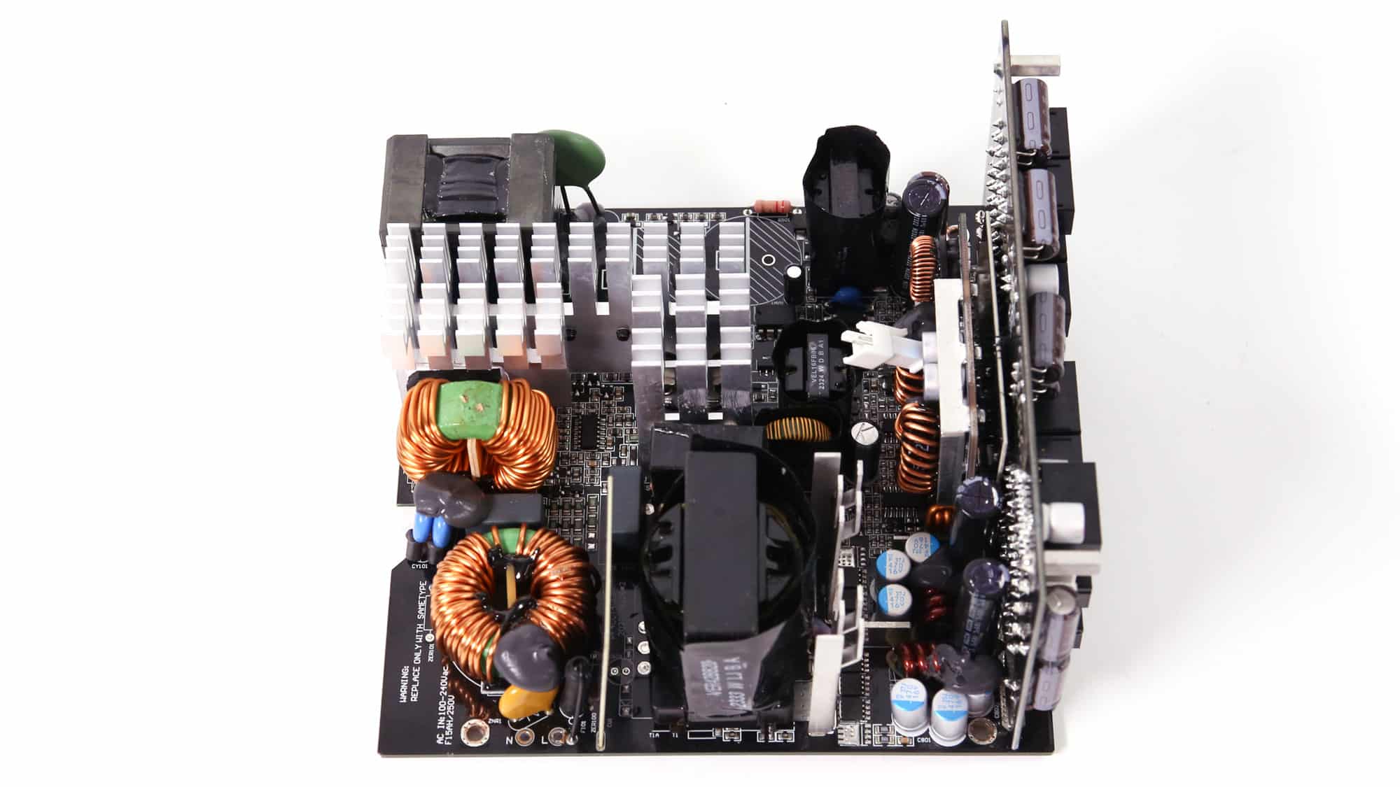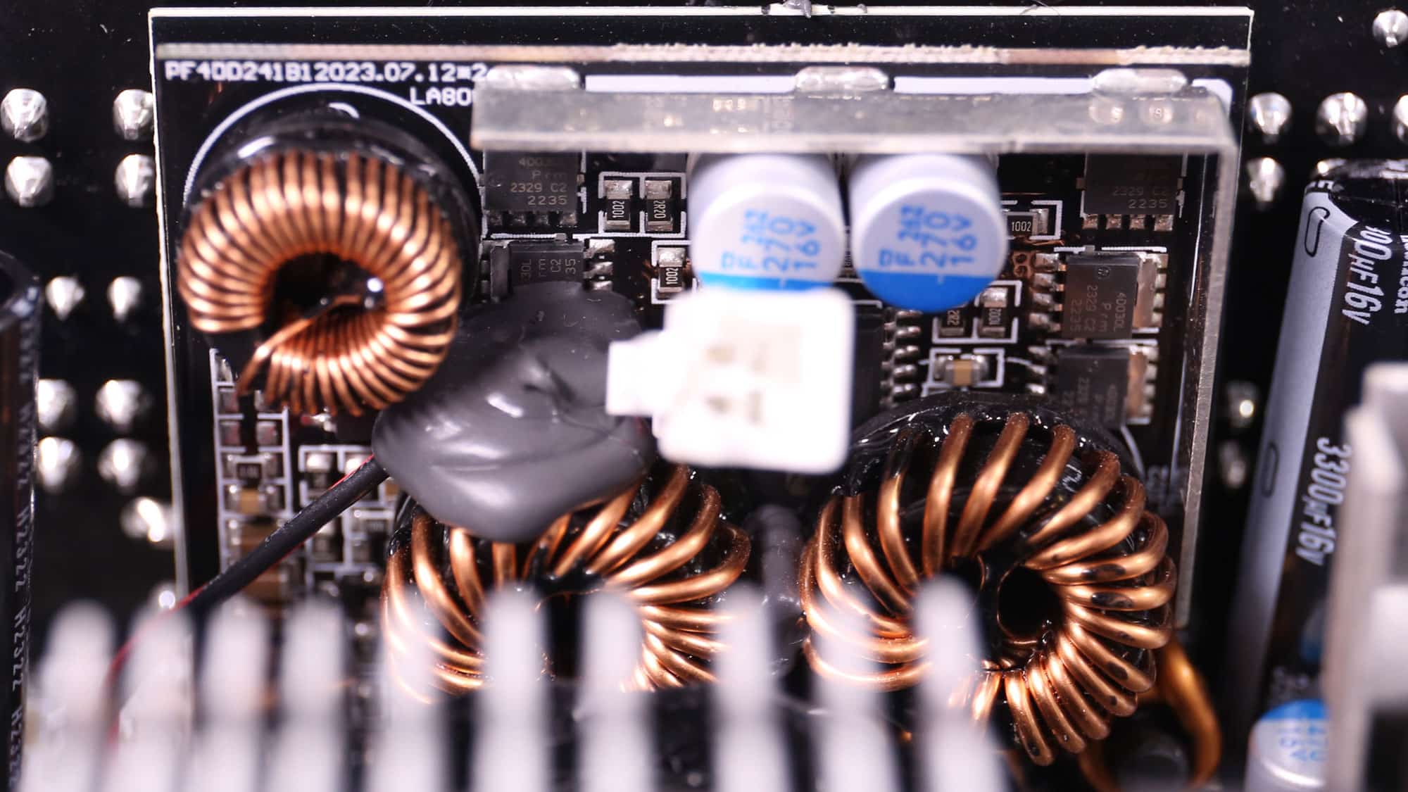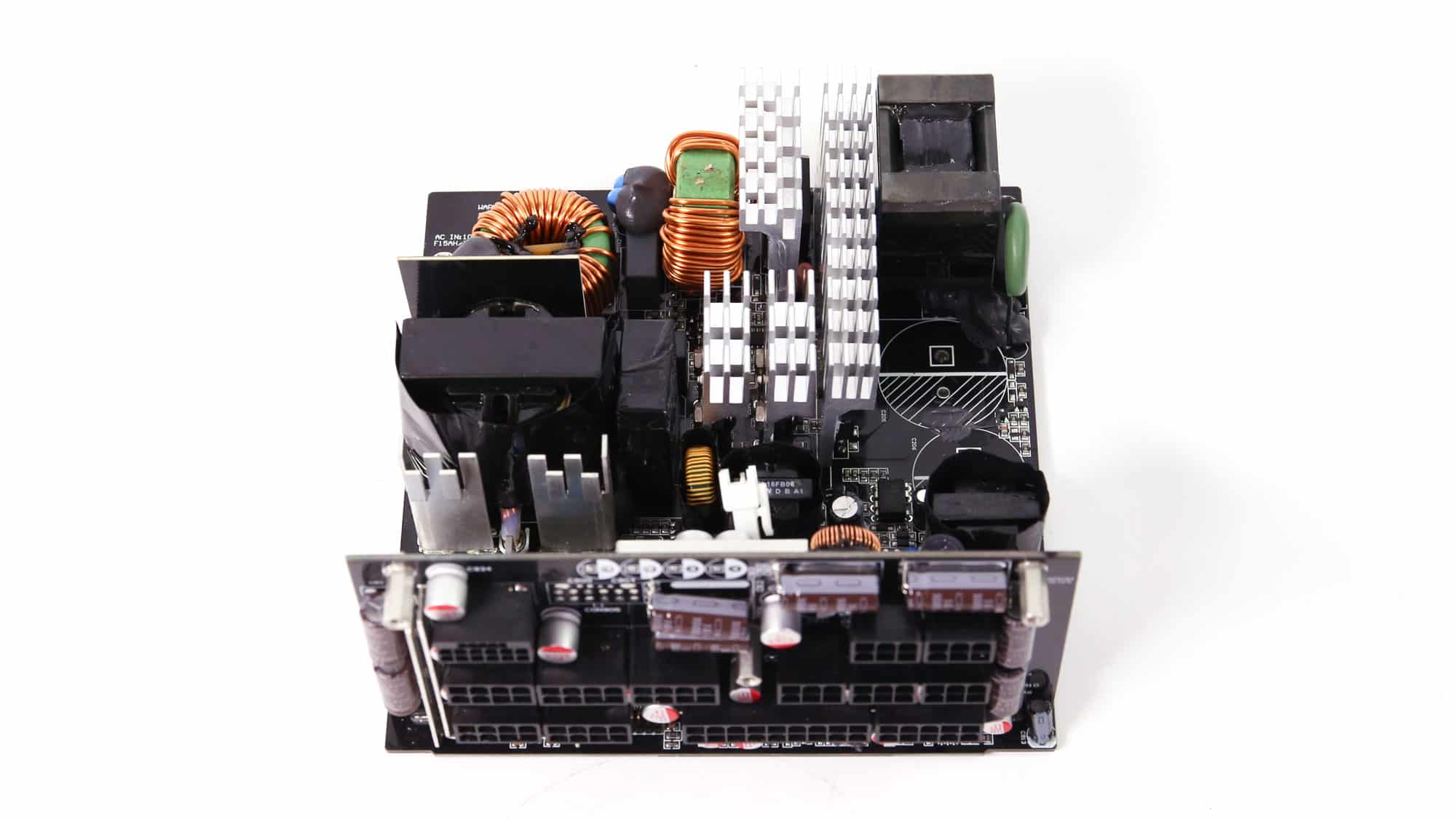 Seasonic provides this platform with a contemporary design. Its primary side has an APFC, a full bridge, and an LLC resonant converter. On the secondary side, a synchronous rectification scheme is used for 12V, and a pair of DC-DC converters generate the minor rails. The PCB is compact but not densely populated because of the lack of large heatsinks on the secondary side. This means that airflow is not restricted; hence, the fan doesn’t have to spin at high speeds to cool down the components. Please note that I have removed the bulk caps in the photos above to provide a better view of the internals.