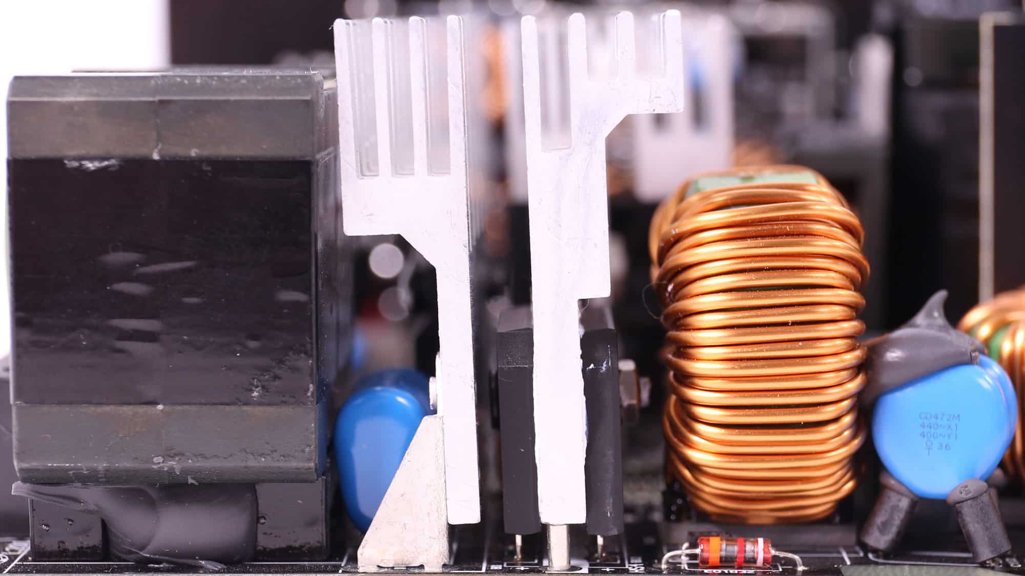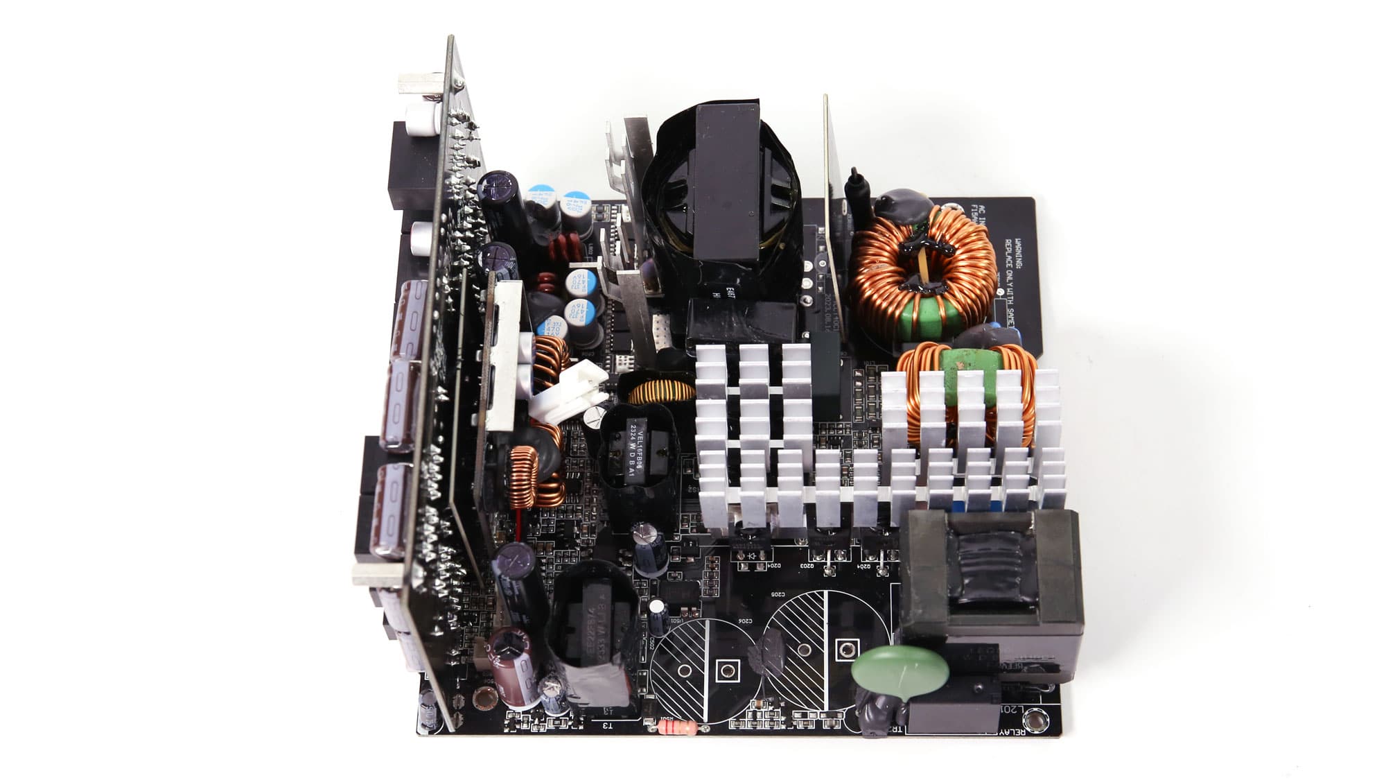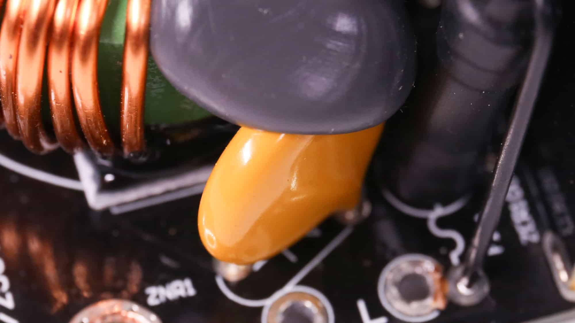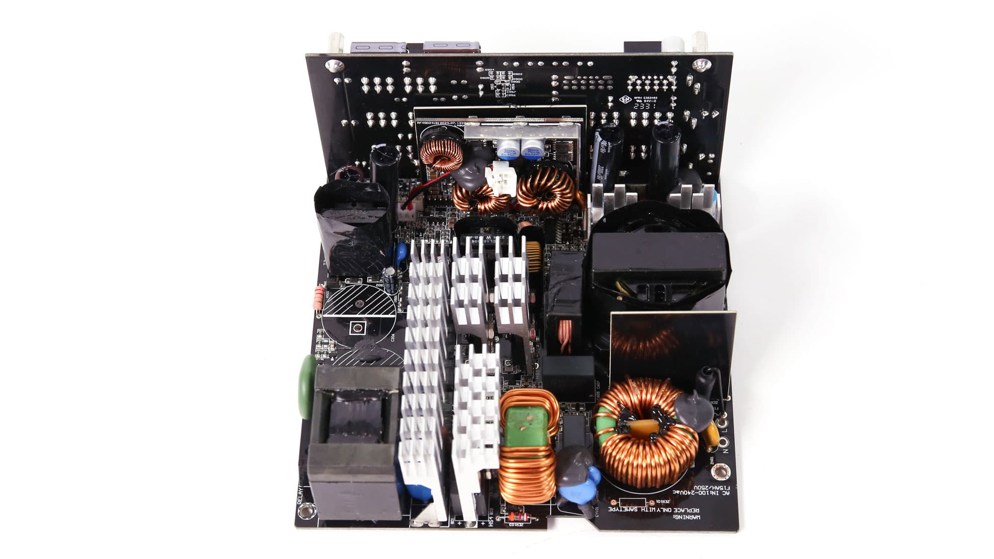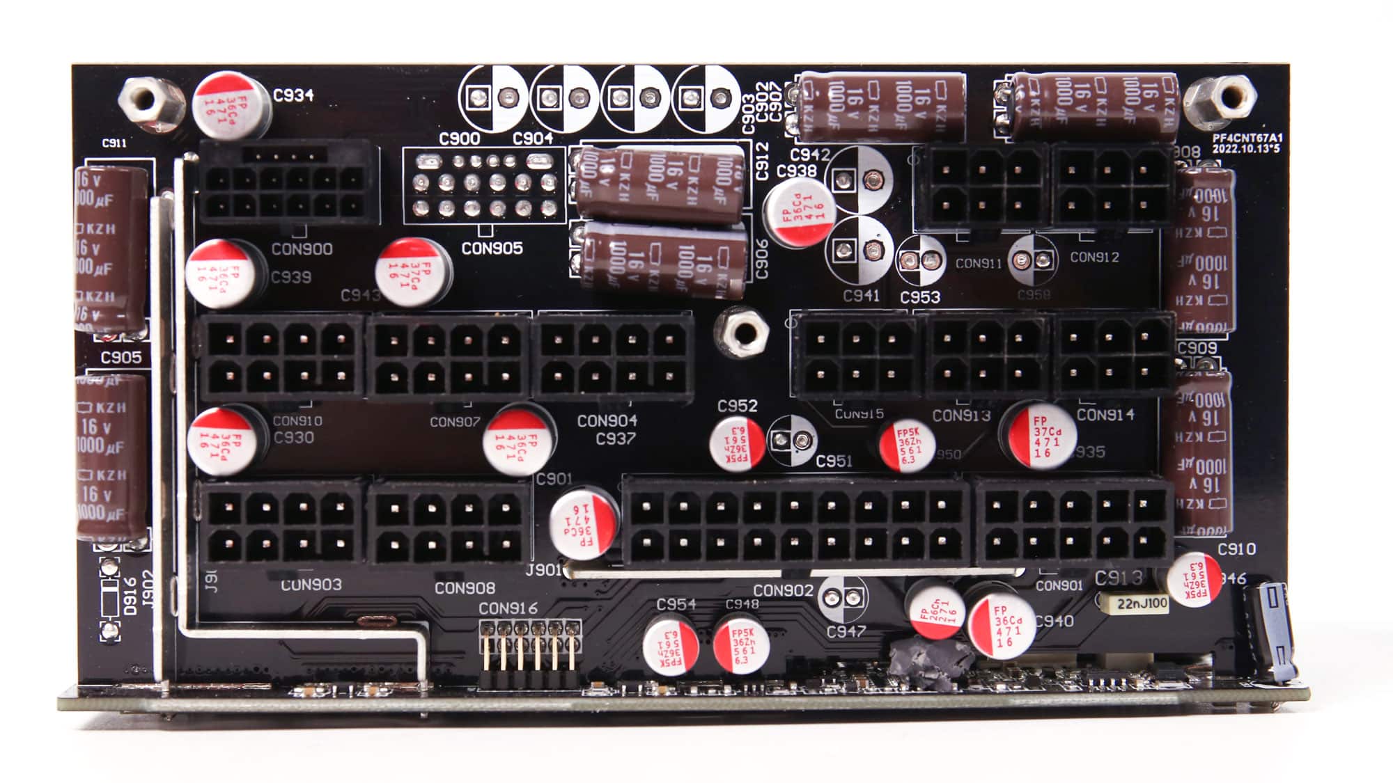 Seasonic provides this platform with a contemporary design. Its primary side has an APFC, a full bridge, and an LLC resonant converter. On the secondary side, a synchronous rectification scheme is used for 12V, and a pair of DC-DC converters generate the minor rails. The PCB is compact but not densely populated because of the lack of large heatsinks on the secondary side. This means that airflow is not restricted; hence, the fan doesn’t have to spin at high speeds to cool down the components. Please note that I have removed the bulk caps in the photos above to provide a better view of the internals.