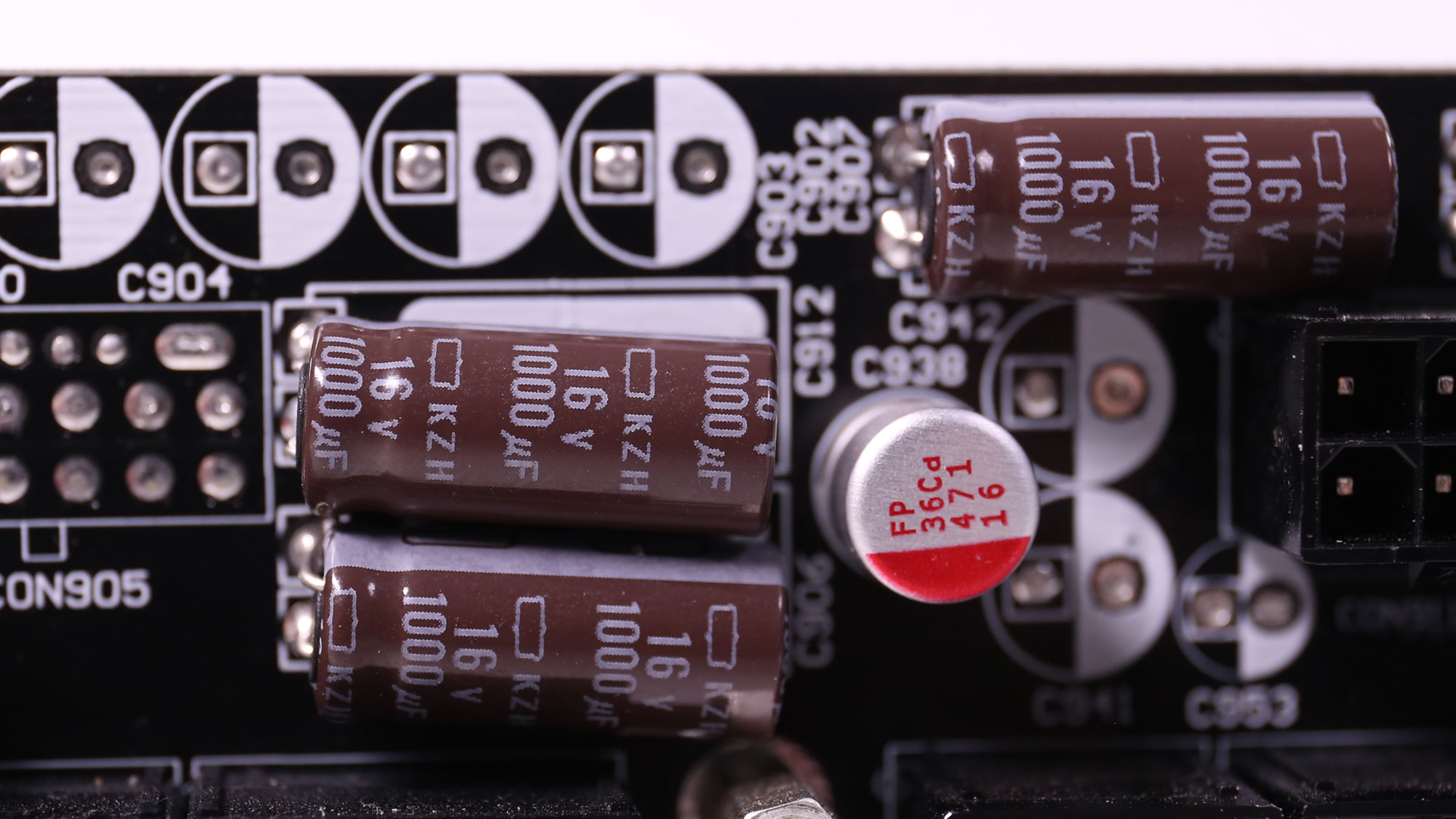 Filtering Capacitors | Electrolytic: 3x Nichicon (2-5,000h @ 105°C, HD), 9x Nippon Chemi-Con (5-6,000h @ 105°C, KZH), 5x Rubycon (3-6,000h @ 105°C, YXG), Polymer: 25x FPCAP |