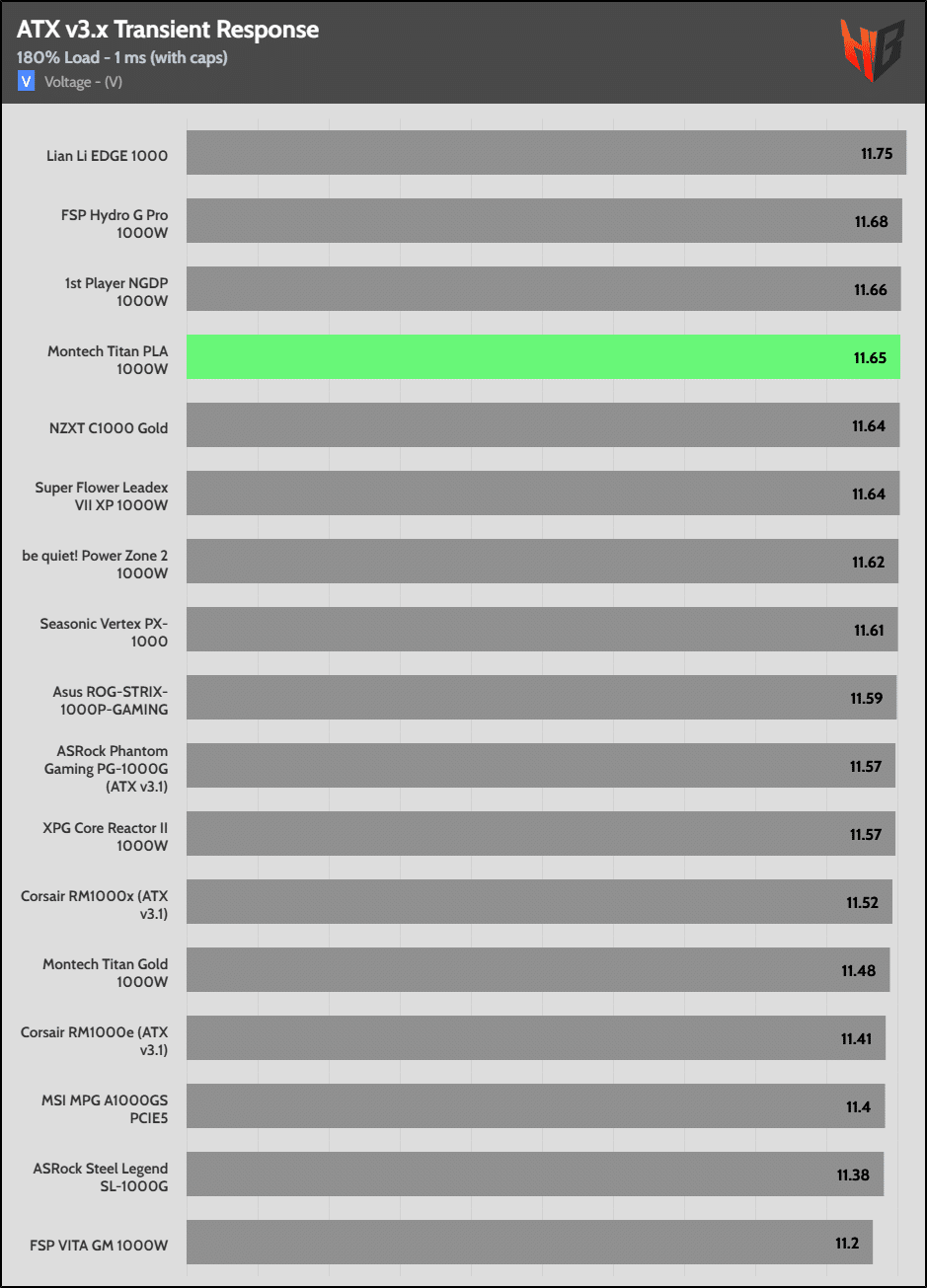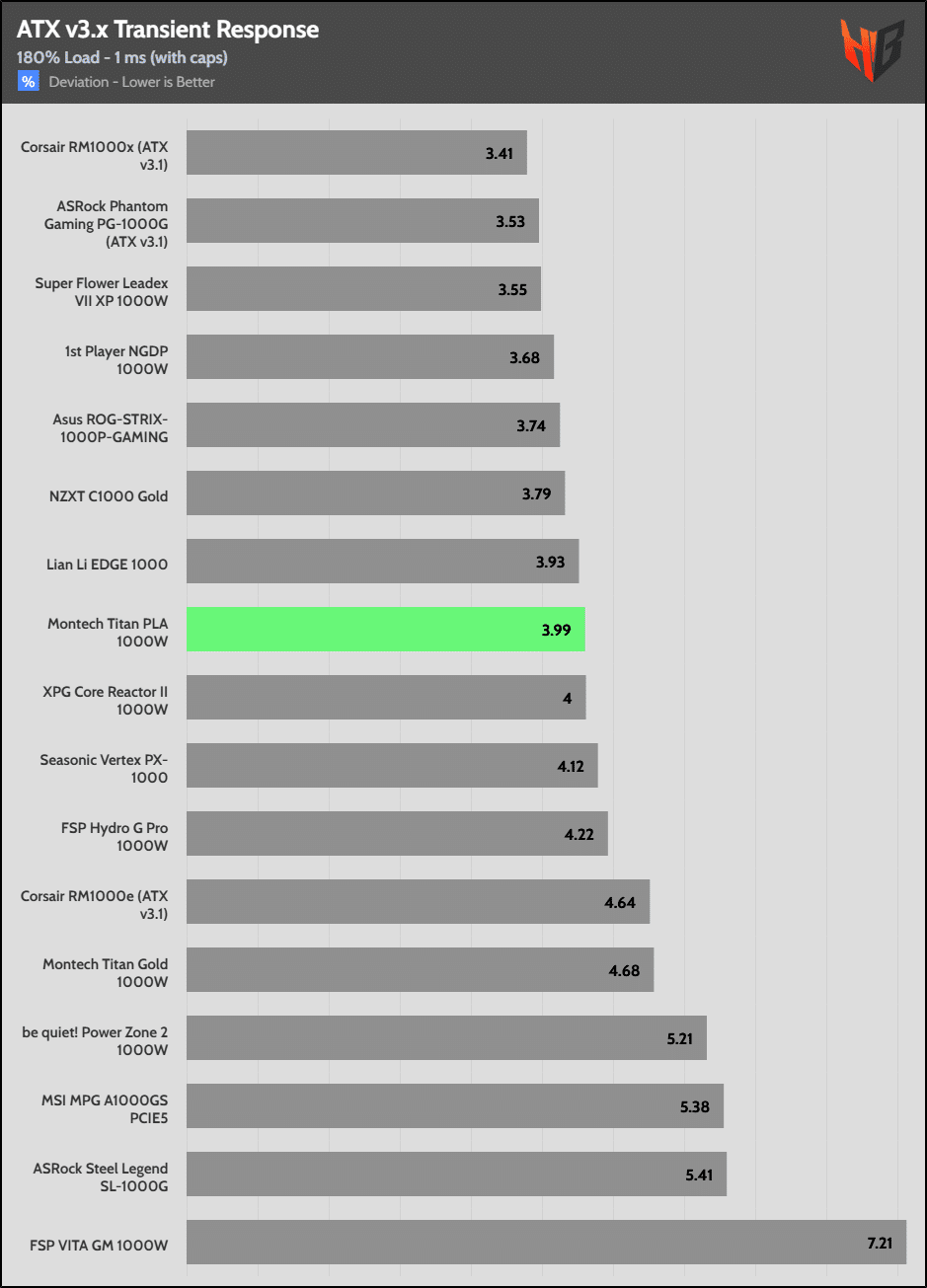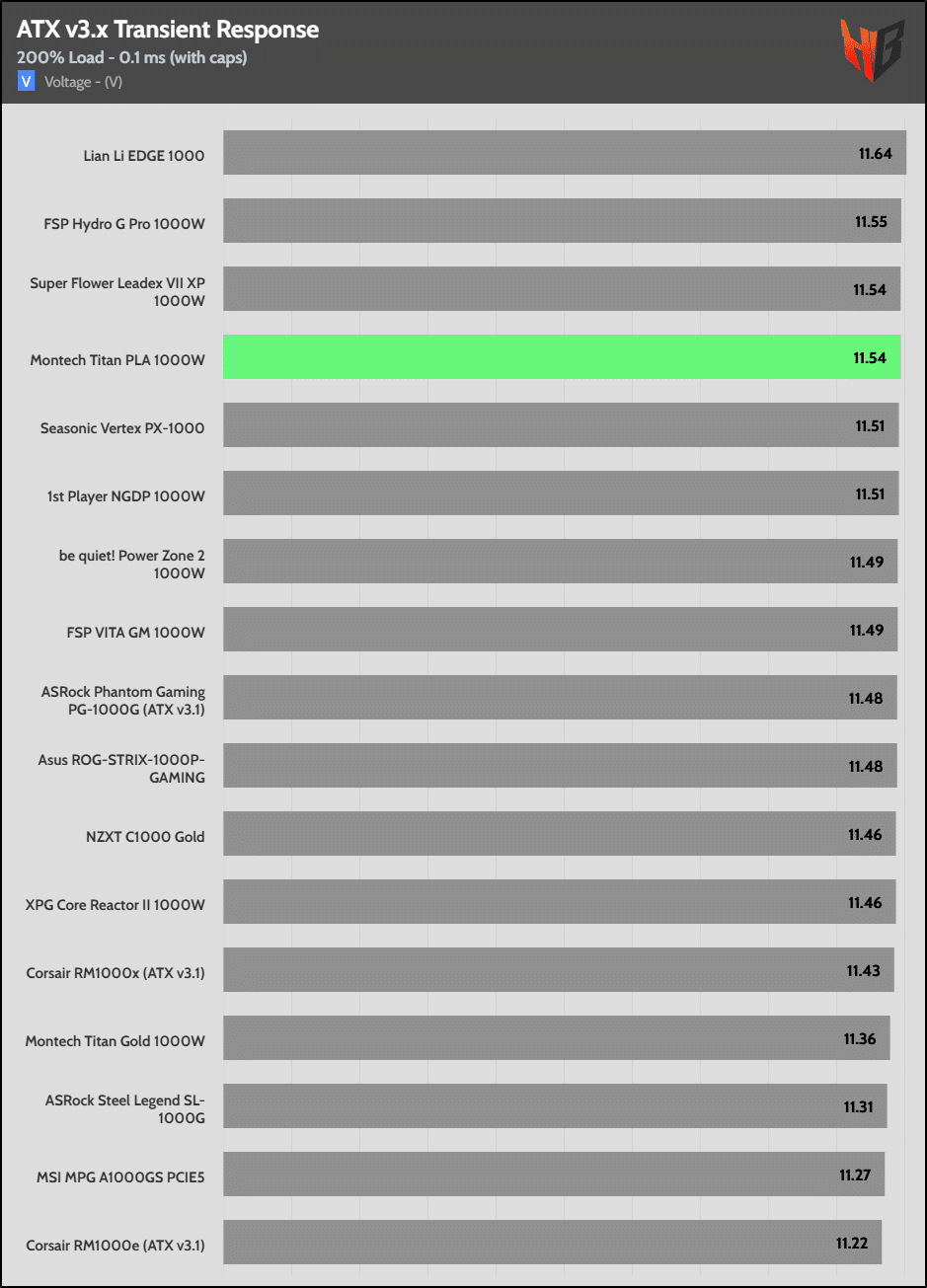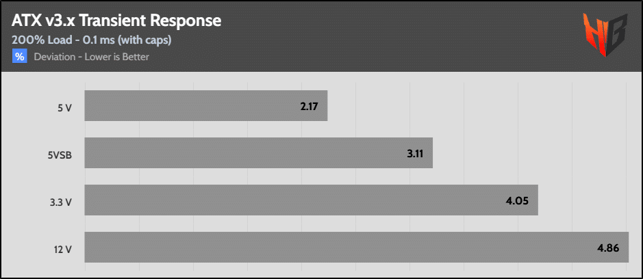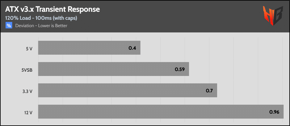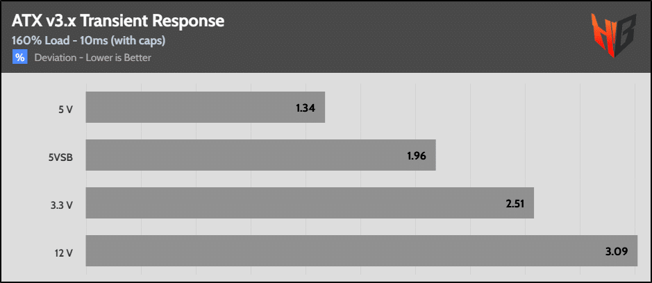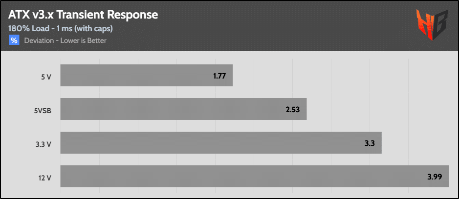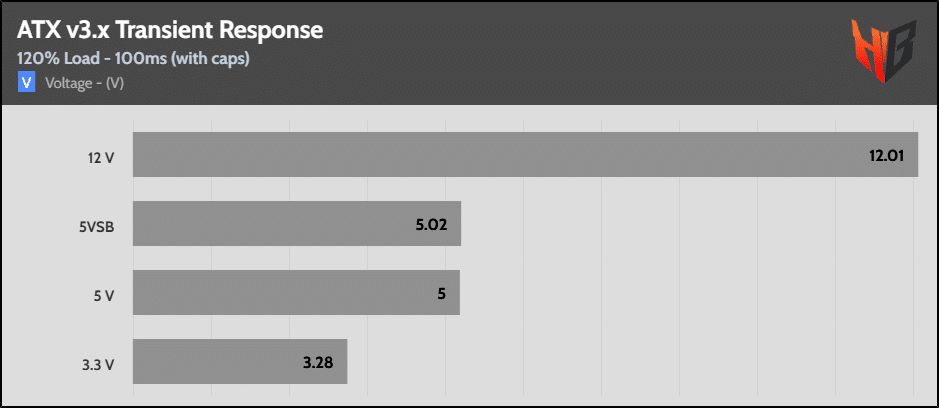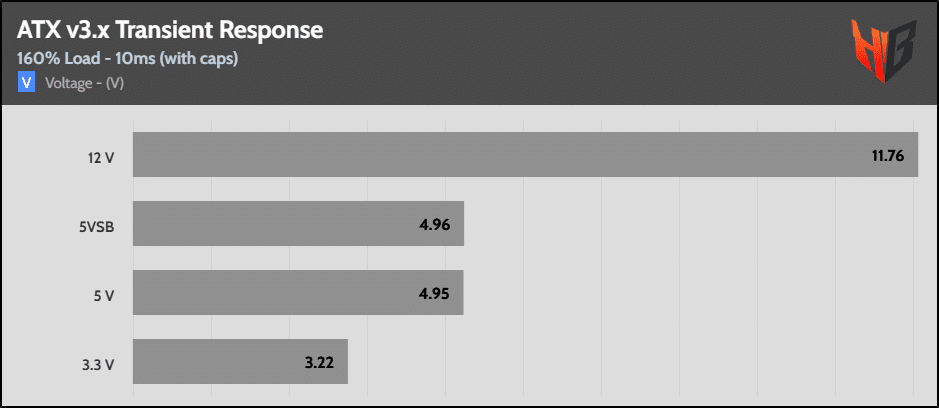 The PSU passes all ATX v3.1 transient response tests, but the 3.3V rails drop low, below 3.2V.