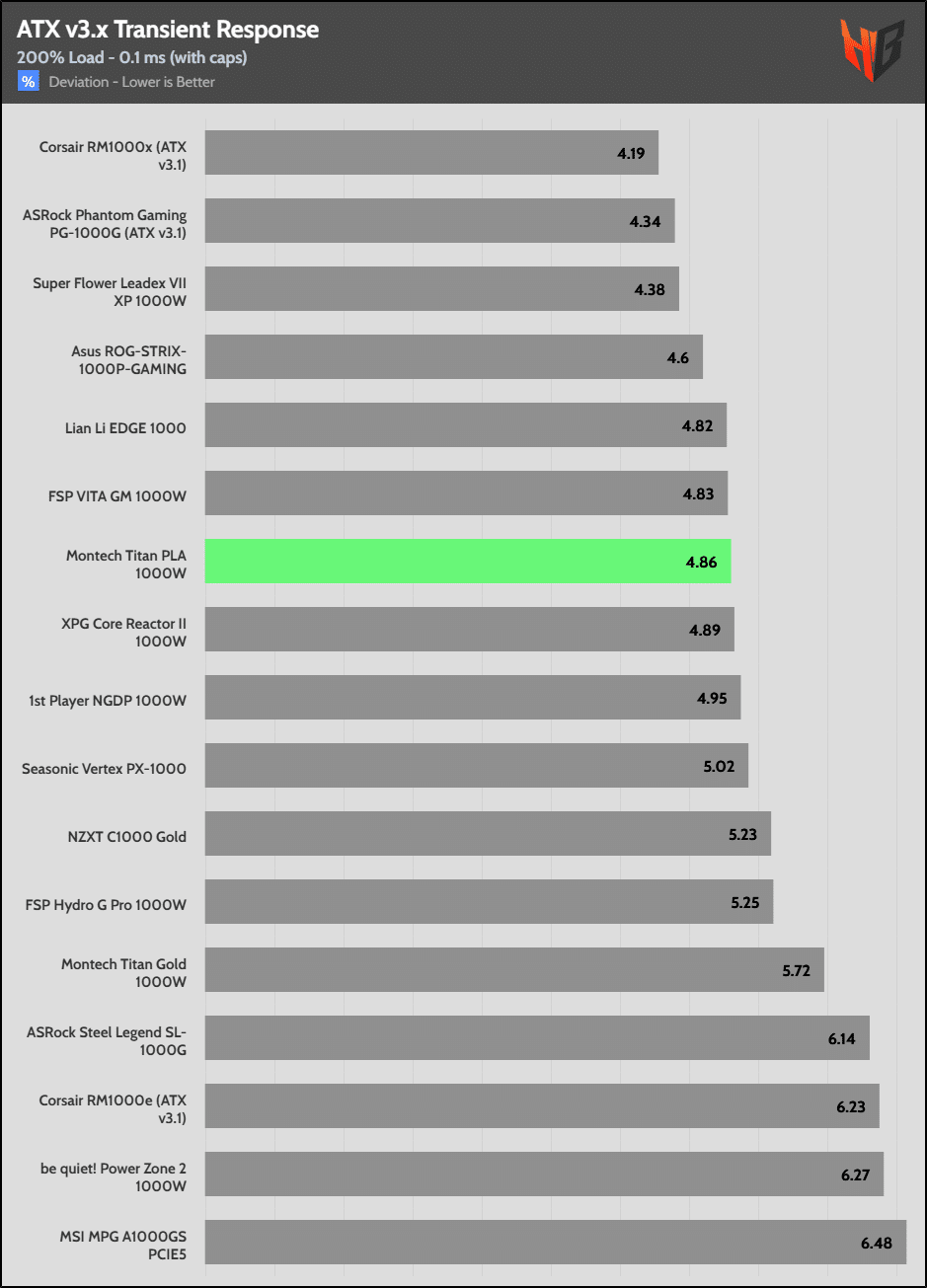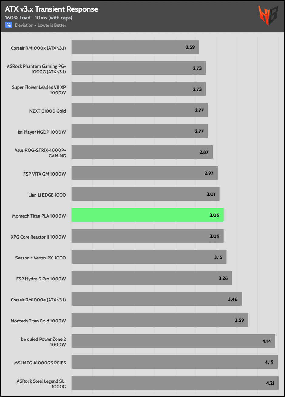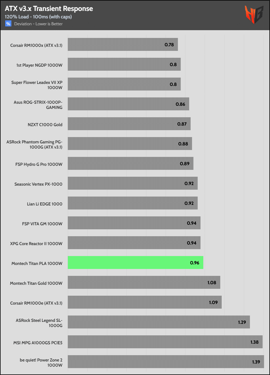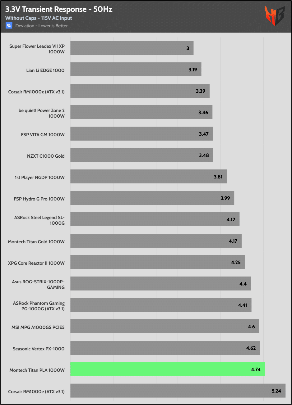 The PSU passes all ATX v3.1 transient response tests, but the 3.3V rails drop low, below 3.2V.