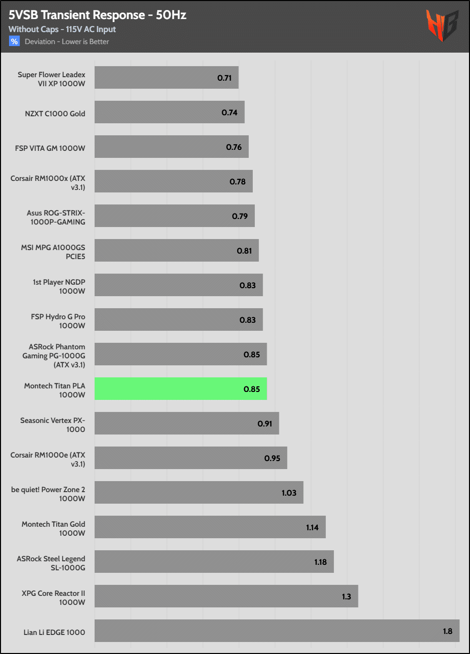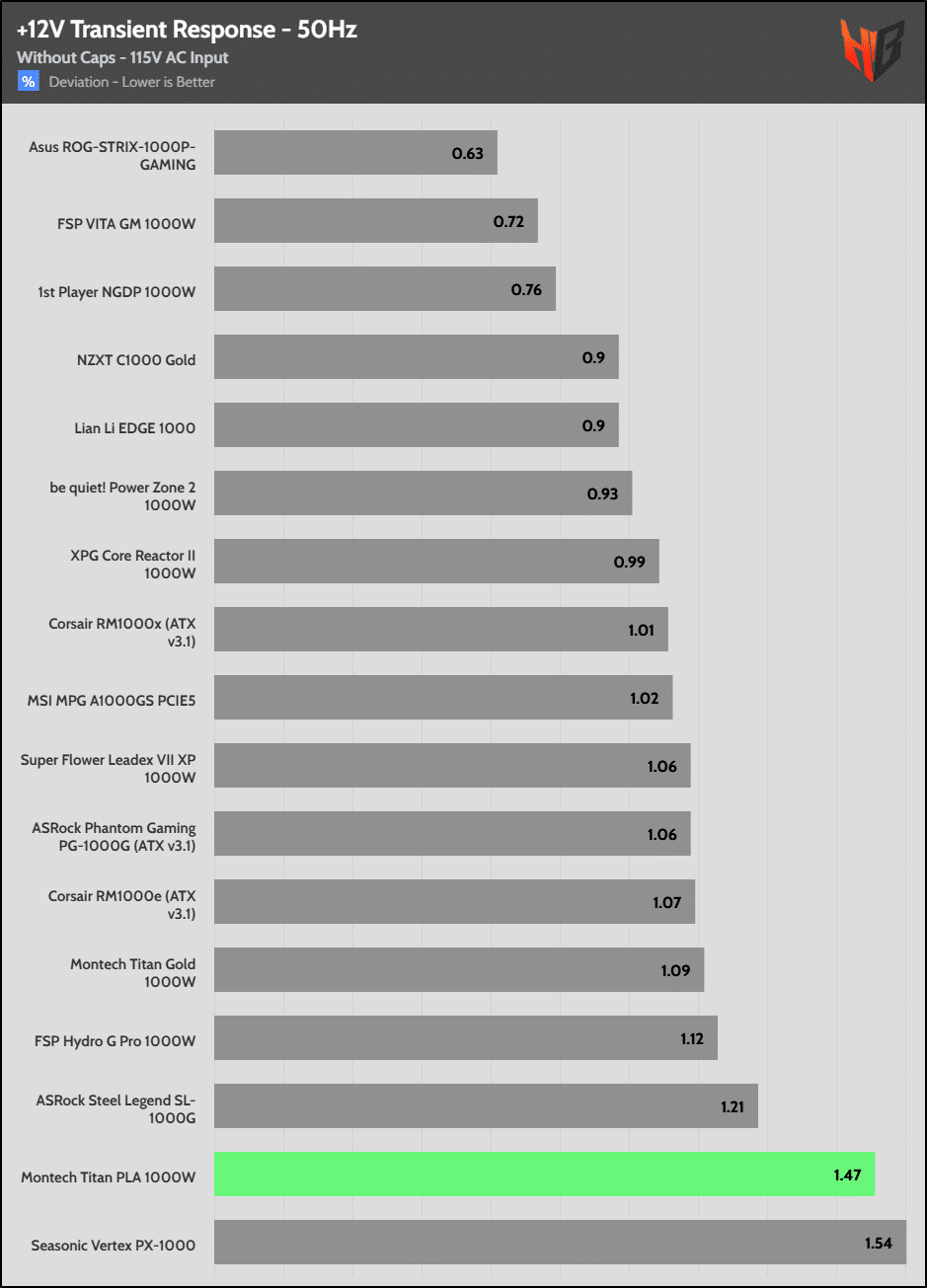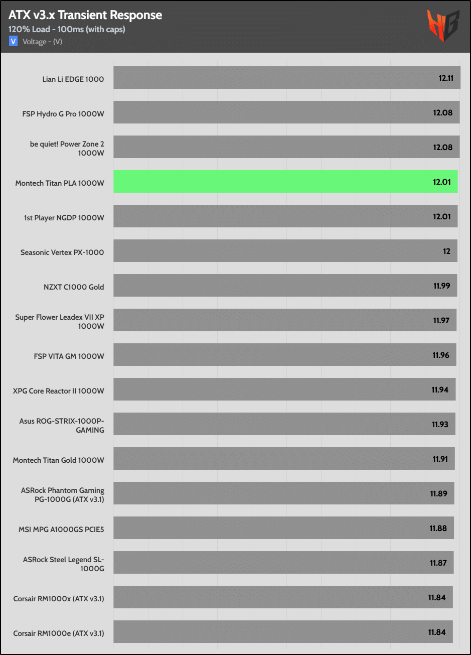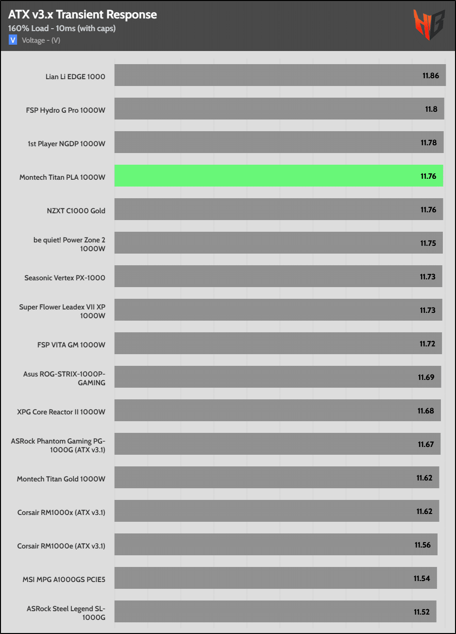 The 12V rail performs well in these tests since the transient load is applied while the PSU is already in a high-load operation.