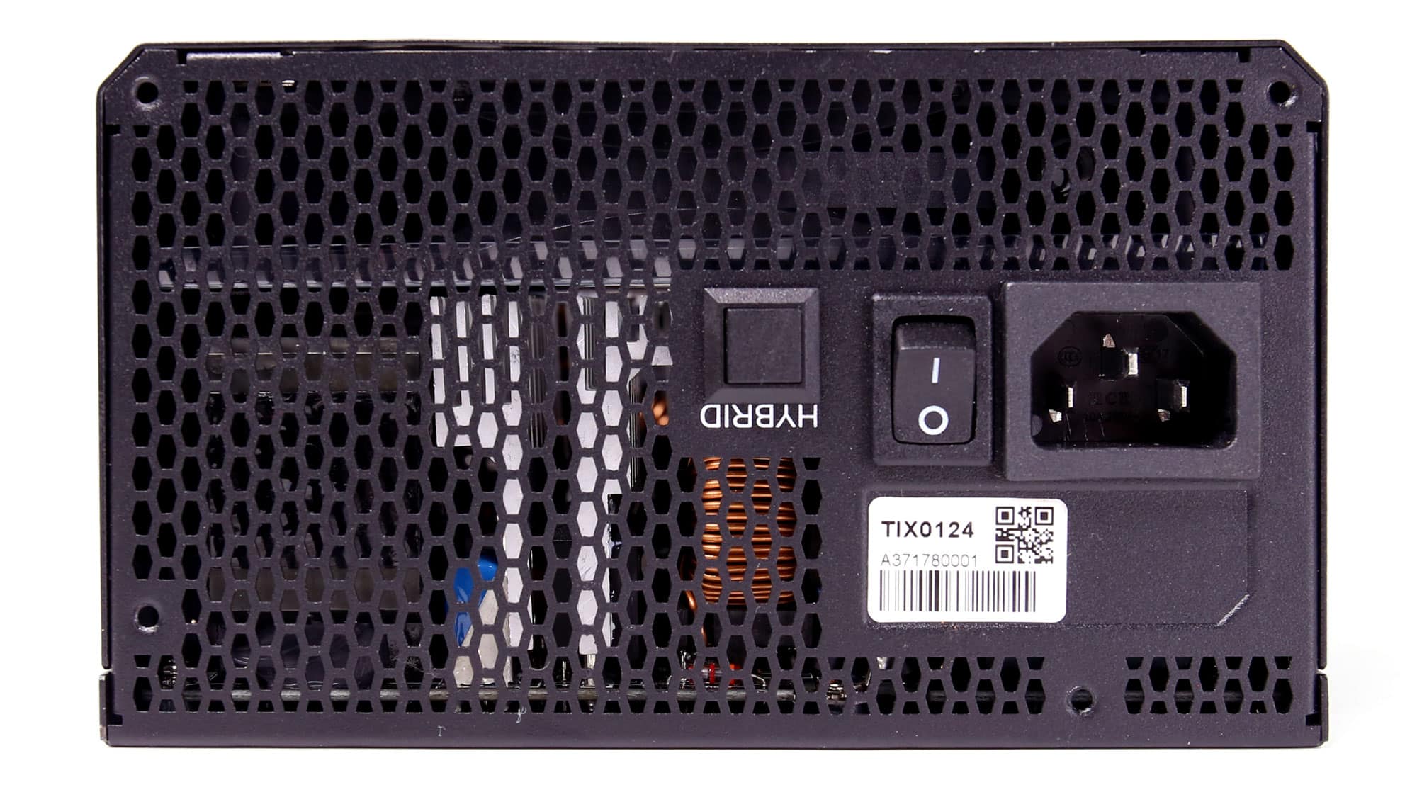 The PSU also comes in white, making it the ideal choice for users with a similar-colored chassis. The fan grille is not restrictive at all. It barely protects the fan, so you should be careful not to have loose cables near it, which can stop the fan’s operation. Besides the typical AC receptacle and the power switch, we find a push button on the front side for toggling on/off the PSU’s semi-passive operation.