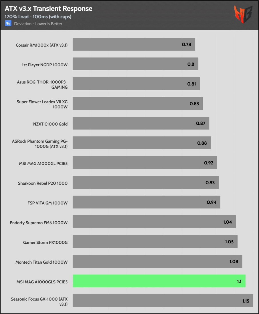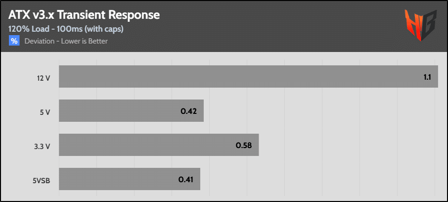 The 12V rail’s performance is generally mediocre at high transient loads.