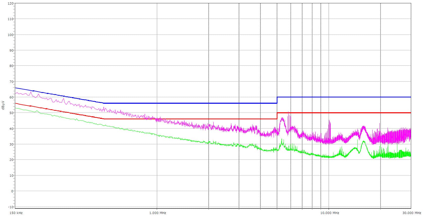The PSU’s conducted emissions are below the respective limits at both the average and peak EMI detectors.