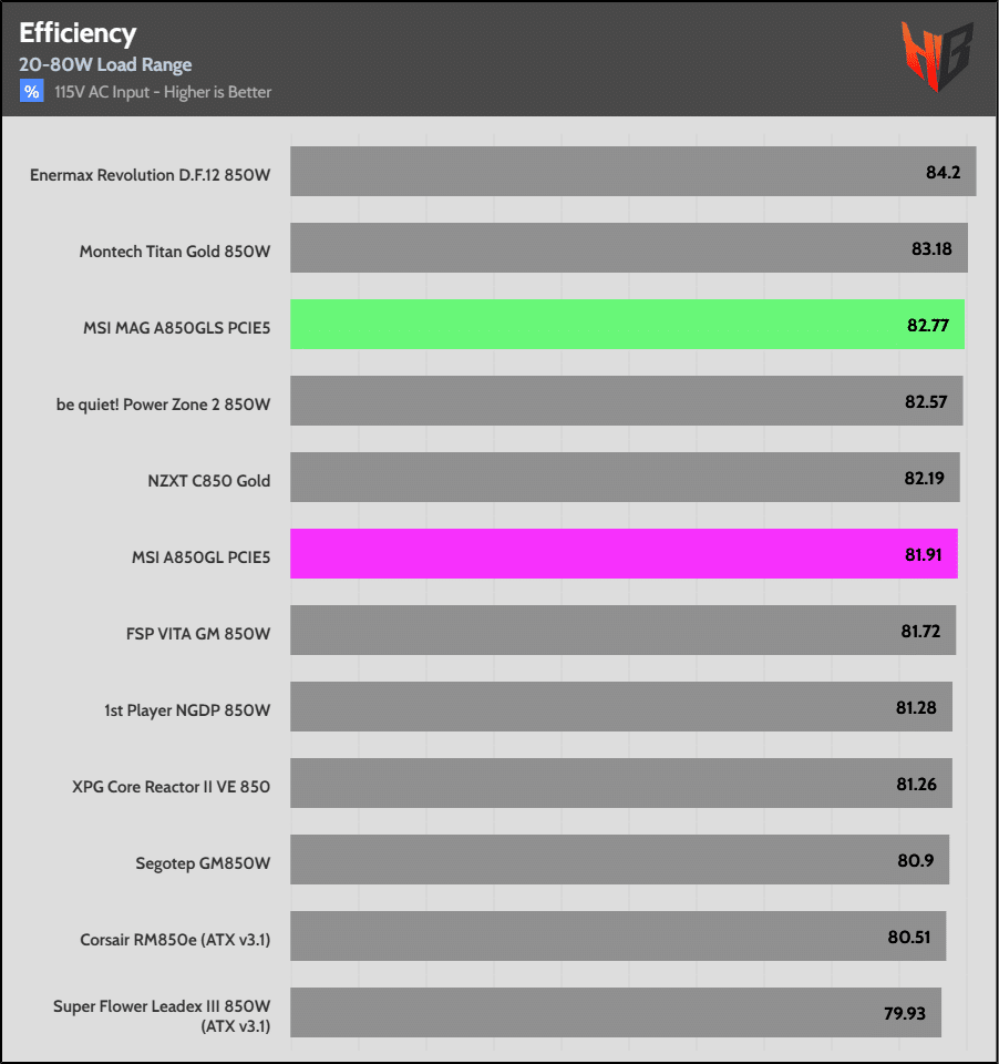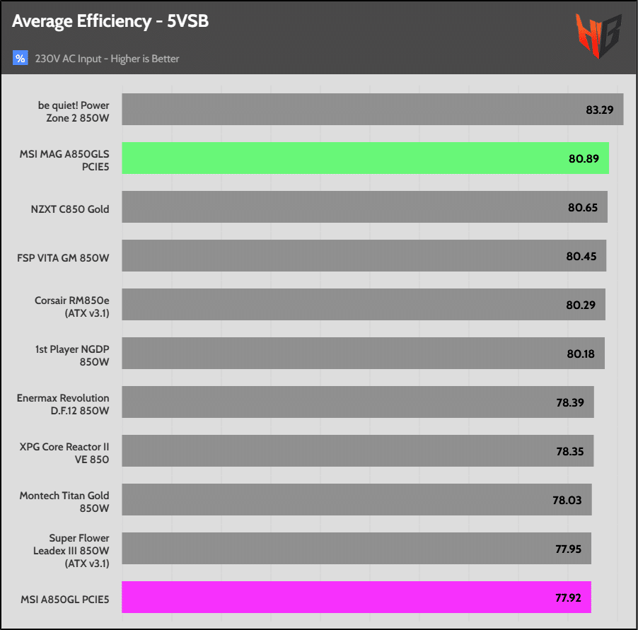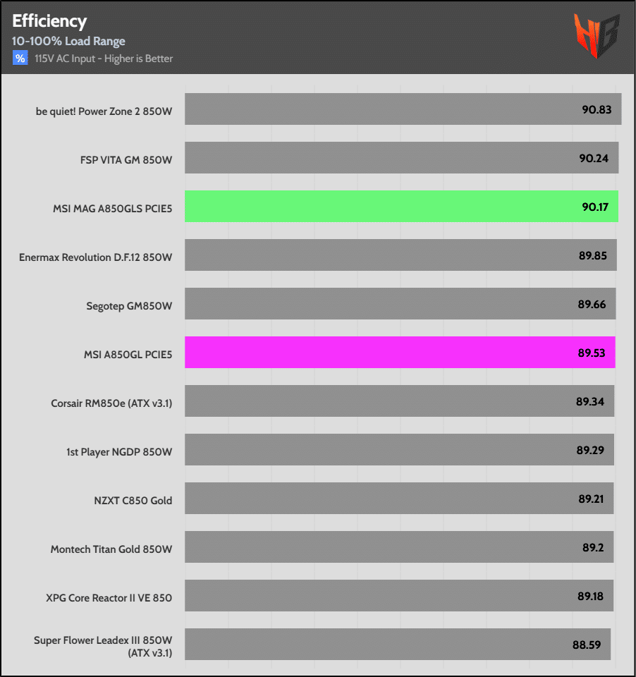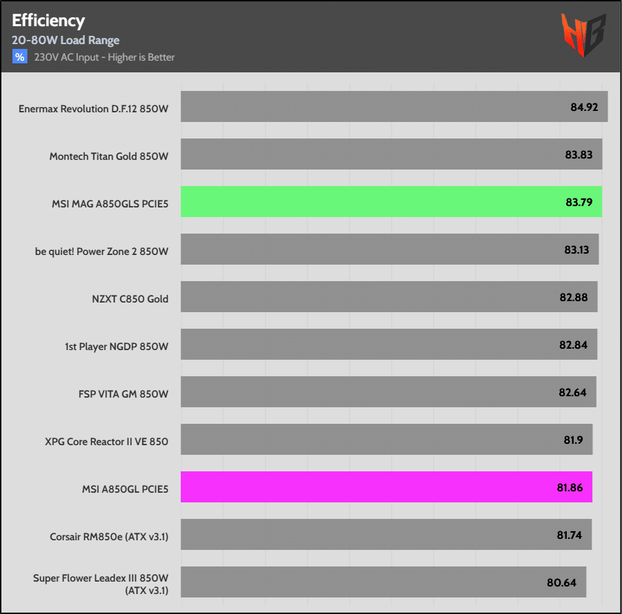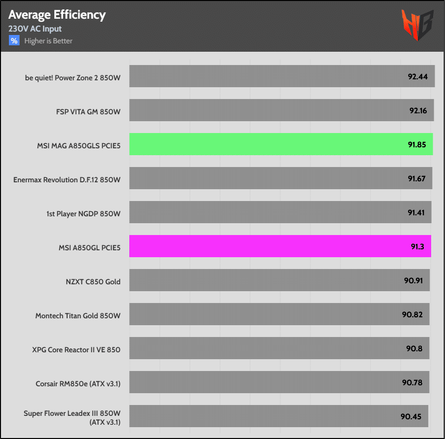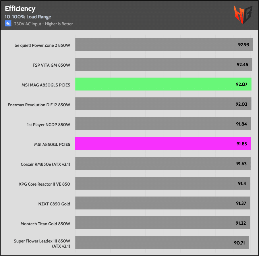 The average efficiency meets the Cybenetics Platinum criteria. Nonetheless, MSI decided to “downgrade” this badge to Gold.