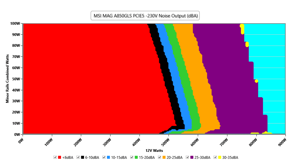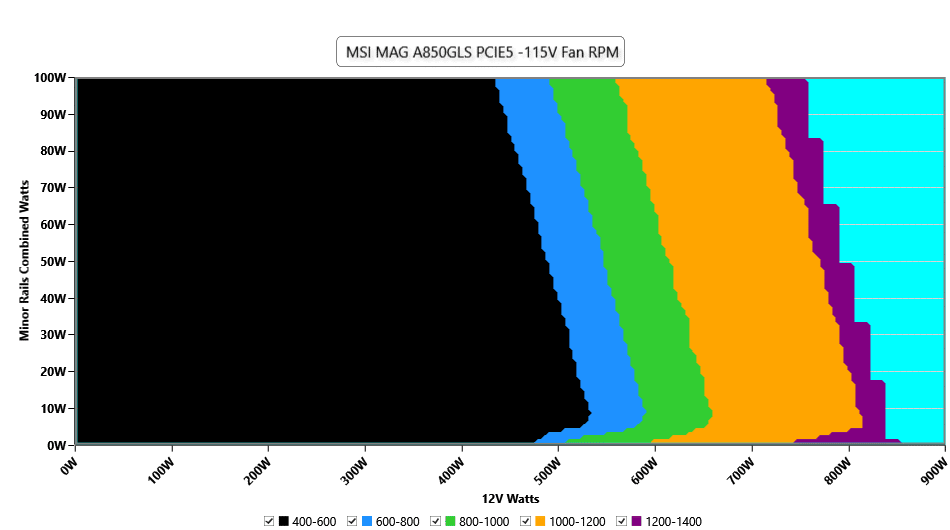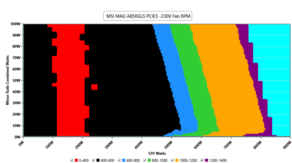 There is no semi-passive mode, but this isn’t a problem; the PSU’s fan operates at low speeds, even at loads of up to 450W, keeping its noise output extremely low. The fan exceeds 25 dBA of noise with more than 615W at 12V, and only for some minimal periods, its noise goes over 30 dBA. All in all, the fan speed profile is highly relaxed.
