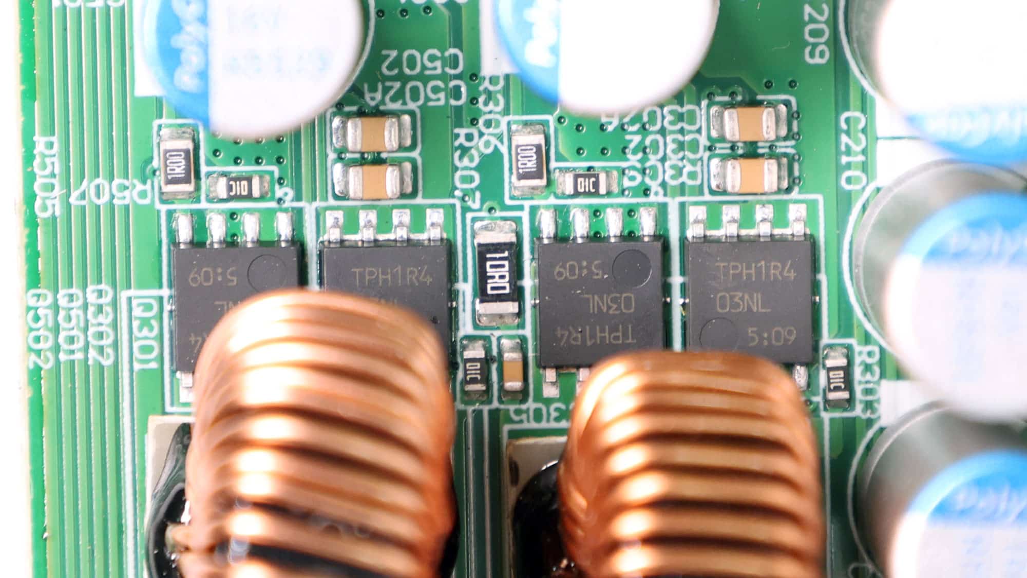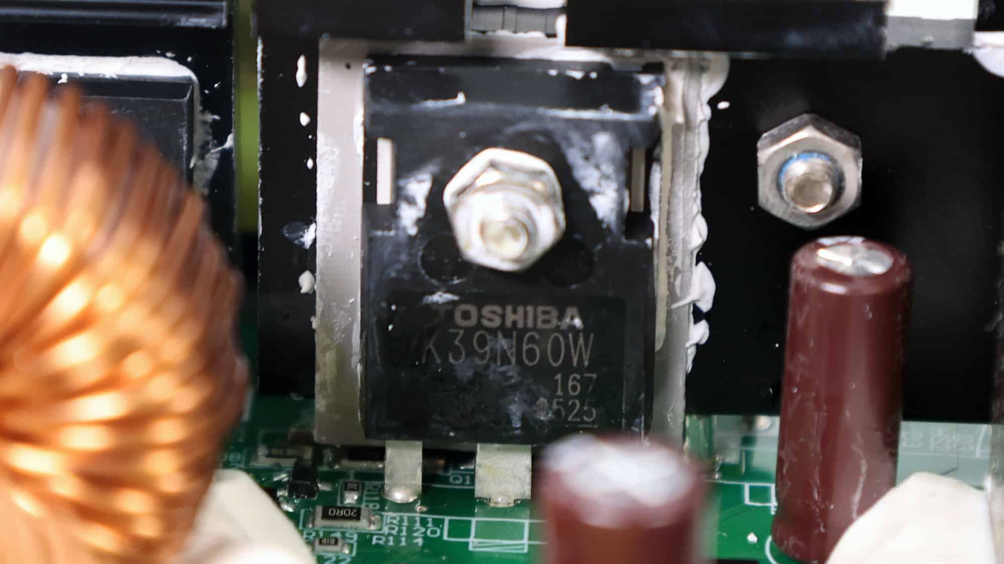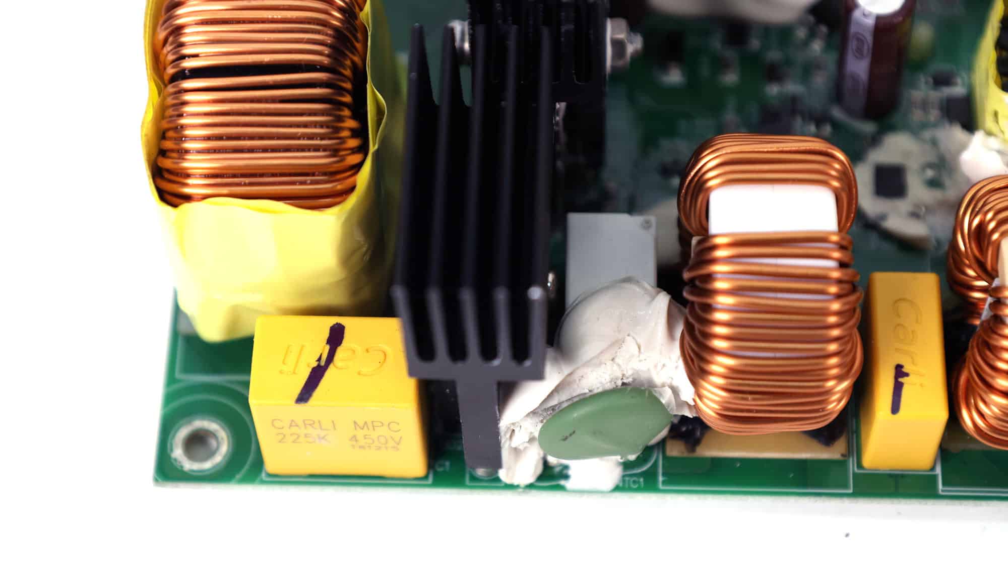 The APFC converter uses two Toshiba TK39N60W FETs and a single WeEn Semiconductor WNSC6D06650 boost diode. SamXon manufactures the bulk capacitor. Its capacity is 680 μF, and it is rated for 2,000 hours at 105°C. The voltage rating is 450V, which is notably higher than the APFC’s DC bus voltage (approximately 380-400V DC).