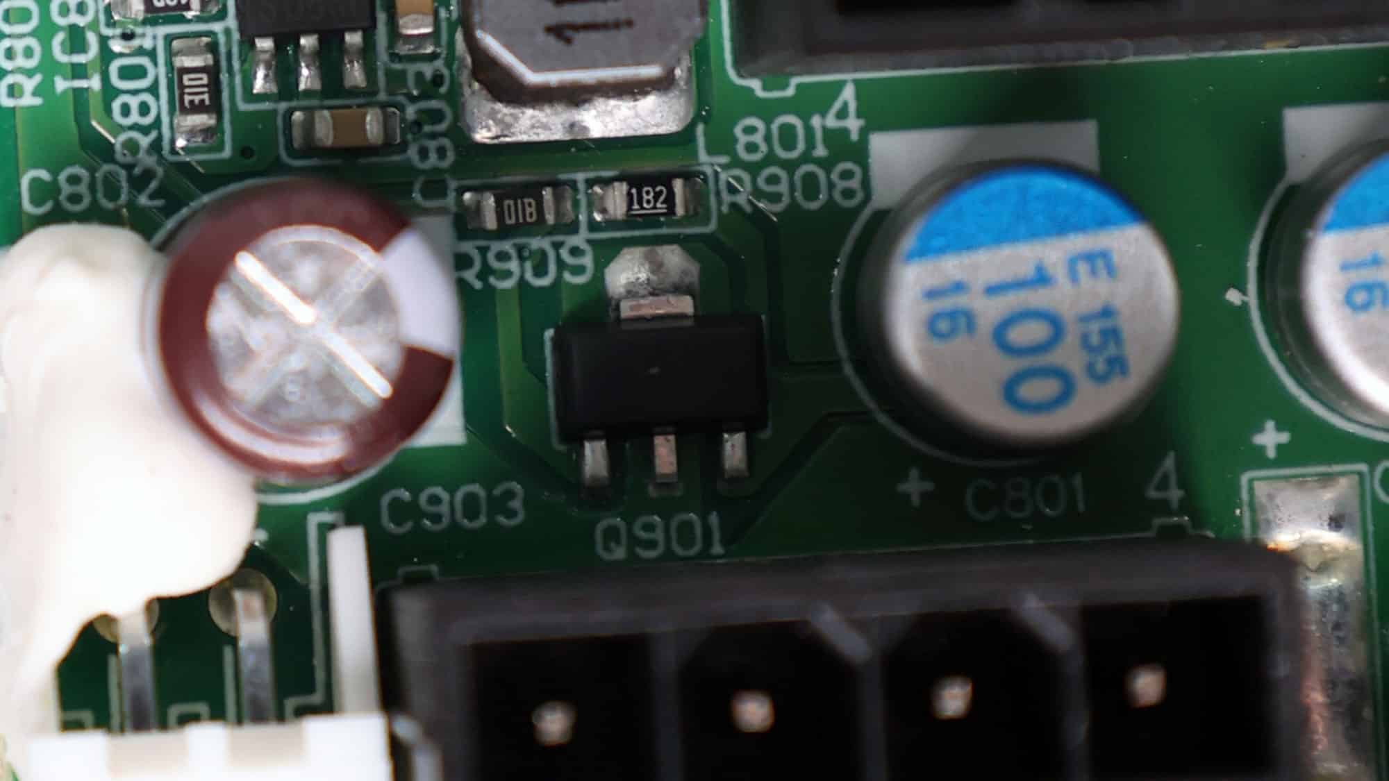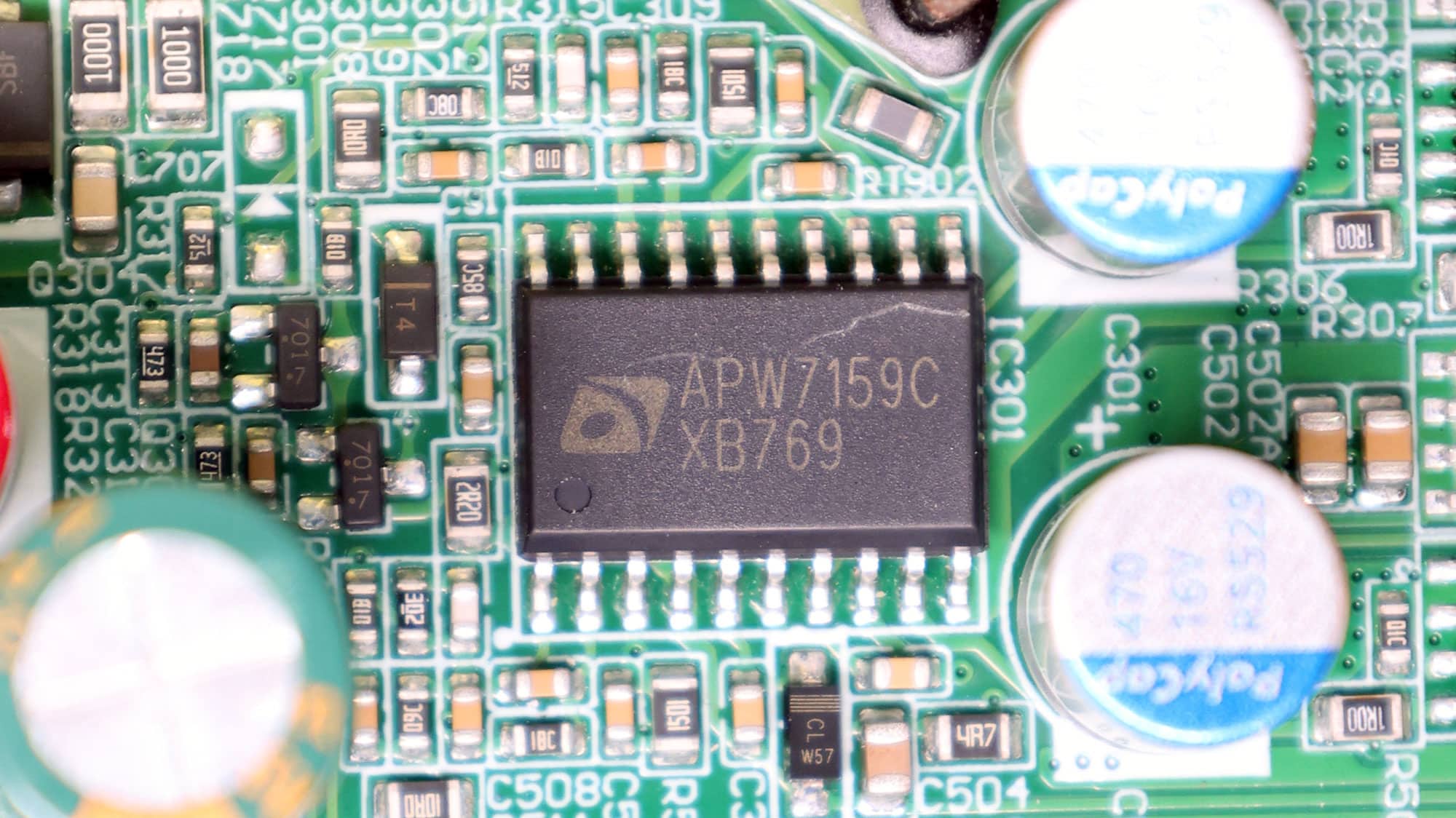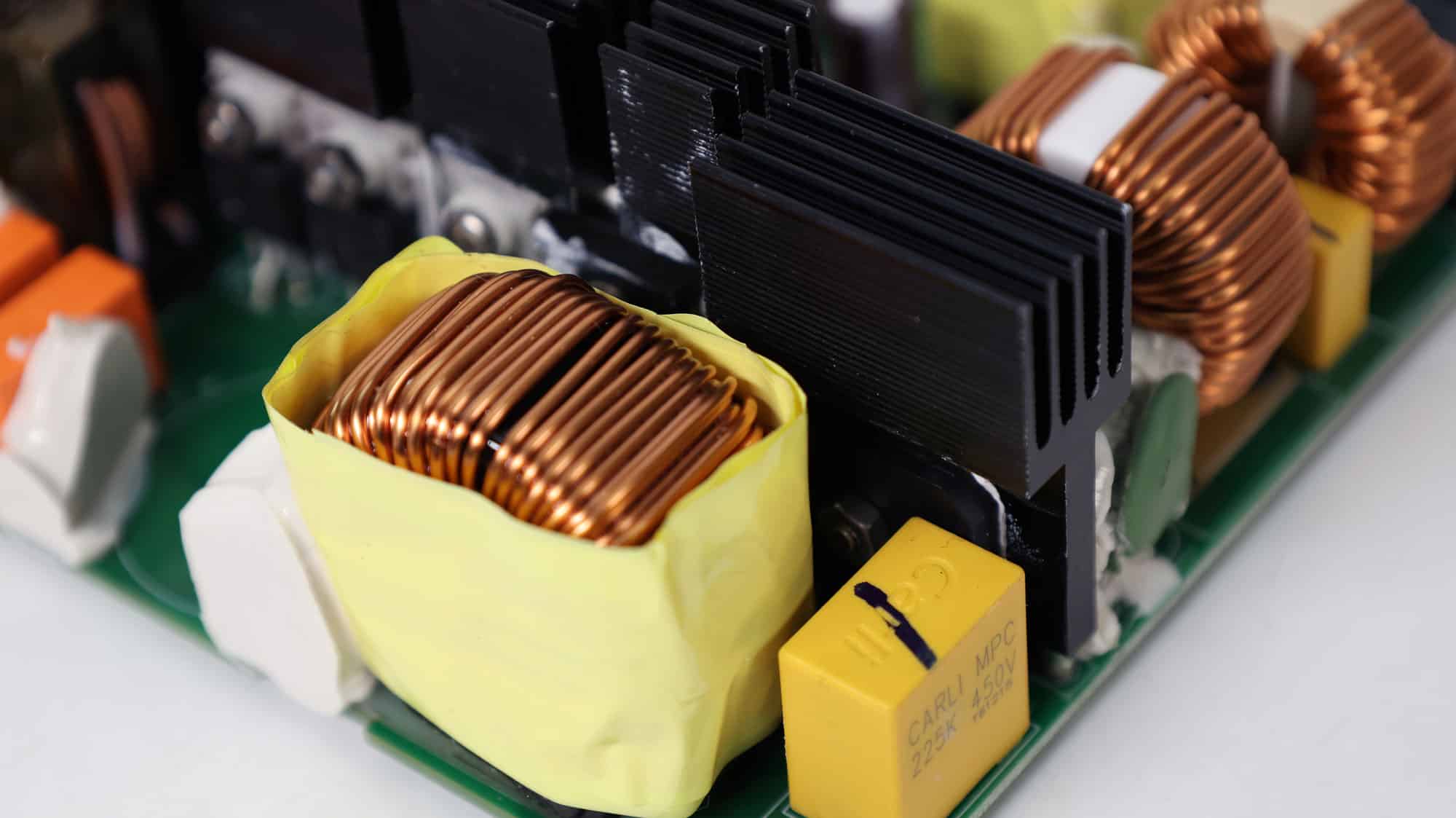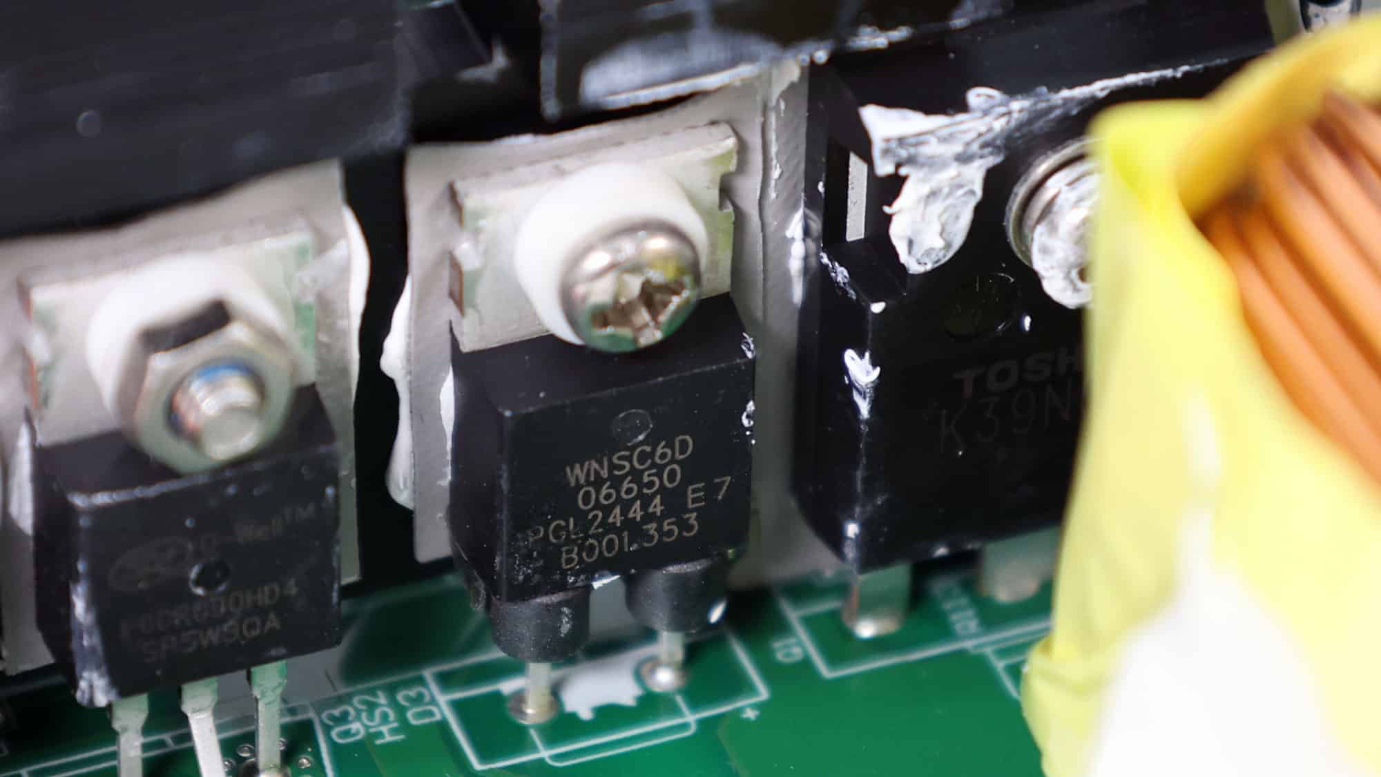 The APFC converter uses two Toshiba TK39N60W FETs and a single WeEn Semiconductor WNSC6D06650 boost diode. SamXon manufactures the bulk capacitor. Its capacity is 680 μF, and it is rated for 2,000 hours at 105°C. The voltage rating is 450V, which is notably higher than the APFC’s DC bus voltage (approximately 380-400V DC).