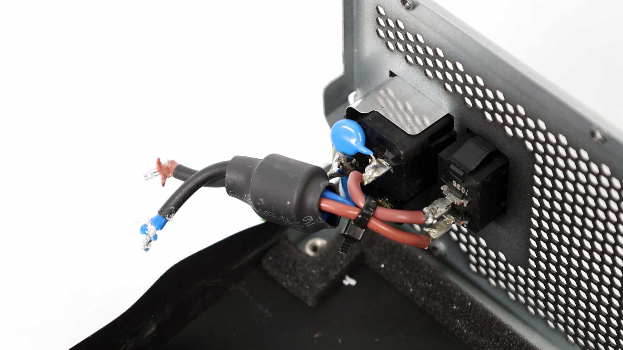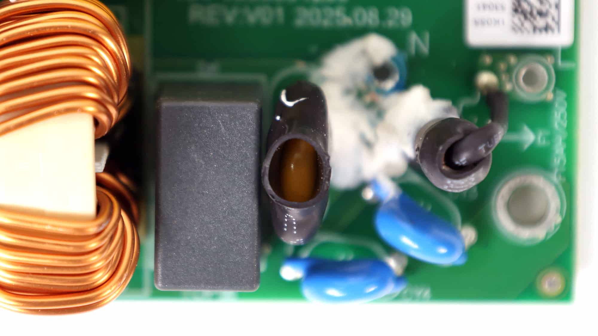 There is an MOV to protect from voltage surges and an NTC thermistor with a resistance of 5 ohms. Moreover, a bypass relay supports the NTC thermistor.