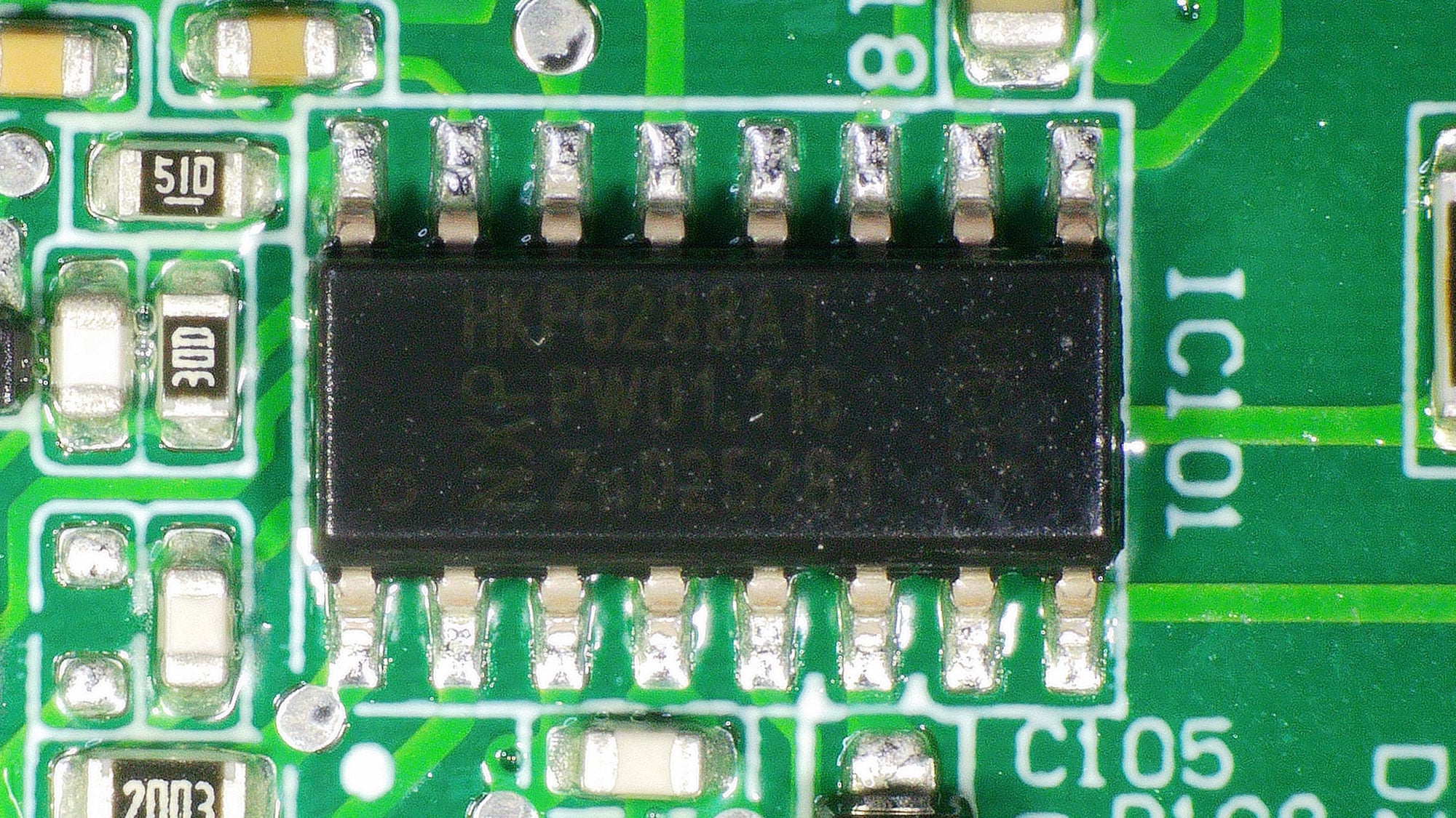 On the primary side, we find an APFC converter, a half-bridge topology, and an LLC resonant converter. The secondary side employs synchronous rectification for the 12V rail and DC-DC converters for the minor rails. The soldering quality is good. To lower the cost, Huntkey avoids using Japanese-branded capacitors. That said, Elite and CapXon are ok. My only objection is to the fan, which is of low quality.