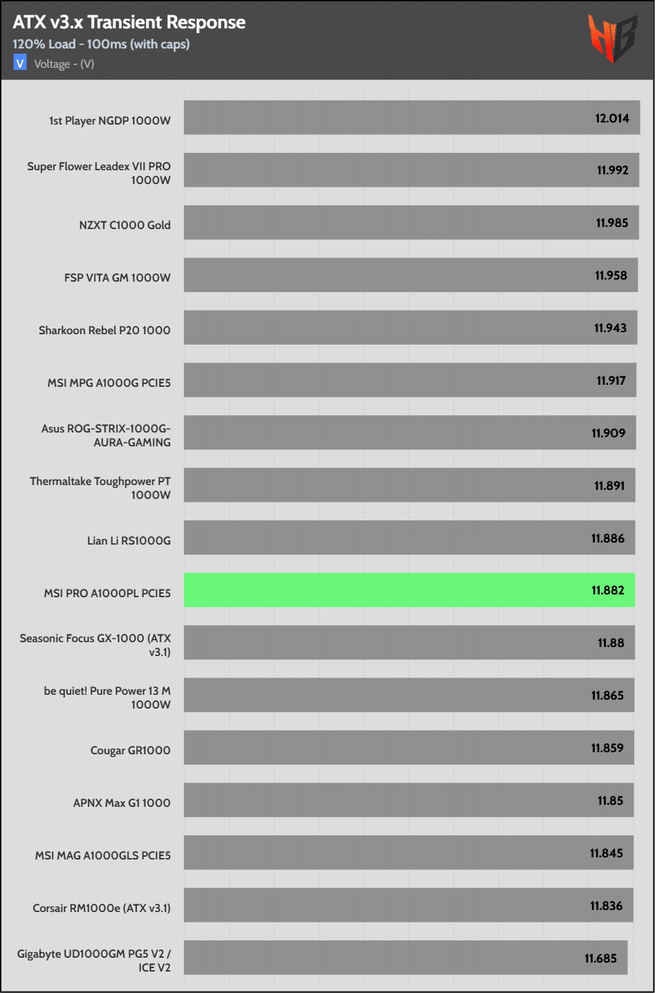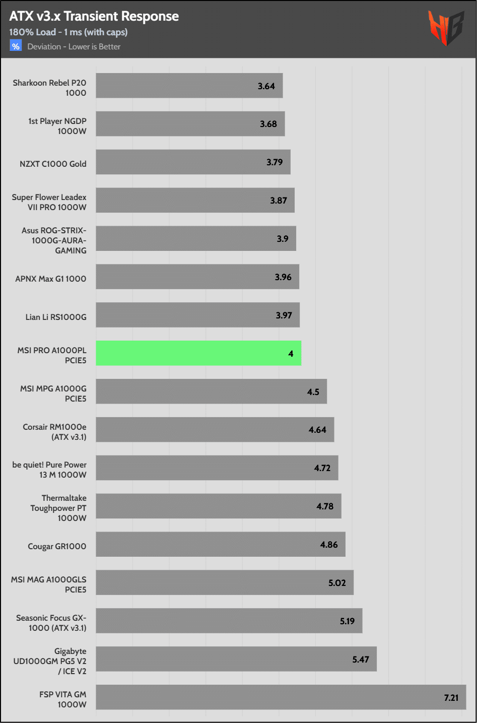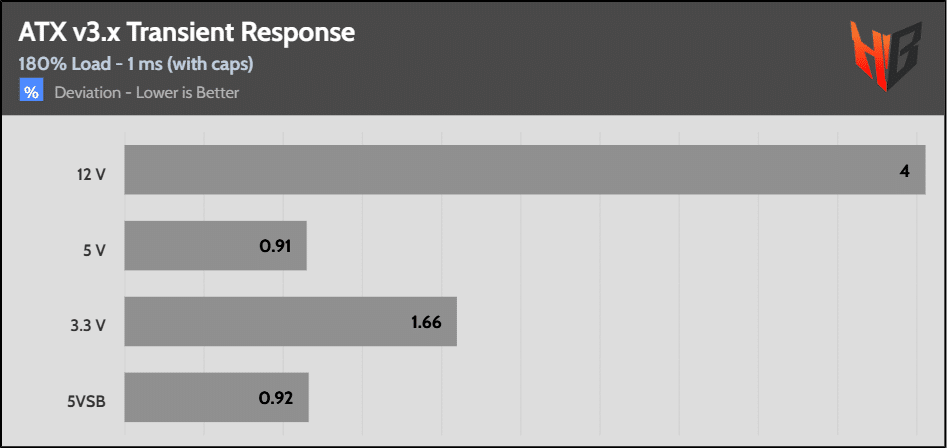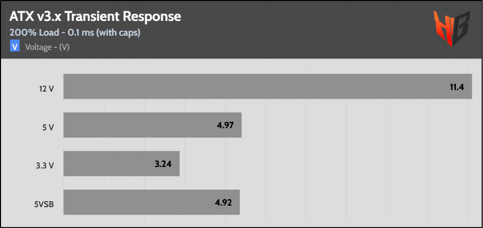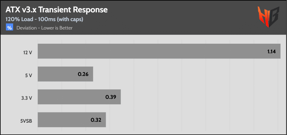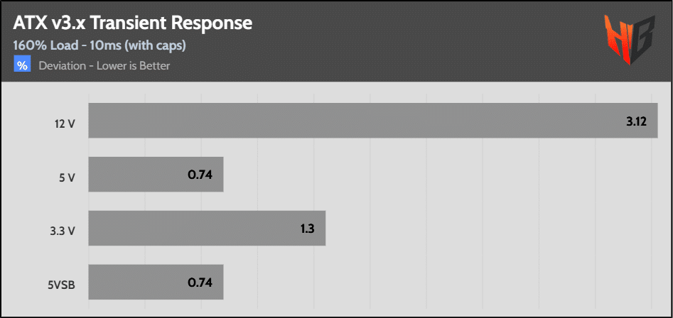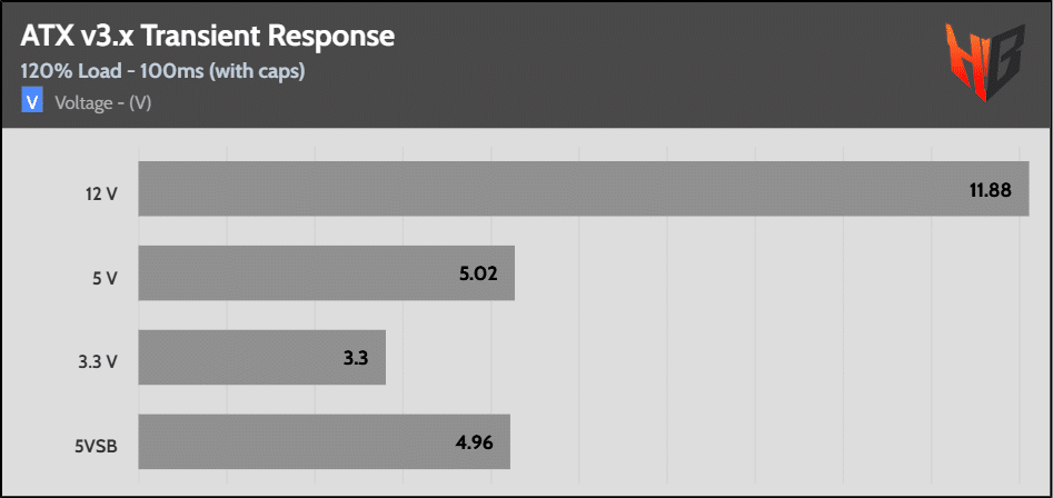 [Note] For PSUs without a 12+4 pin connector, the maximum applied load for the transient response tests is 150%, rather than 200%.The PSU passes all ATX v3.1 transient response tests.