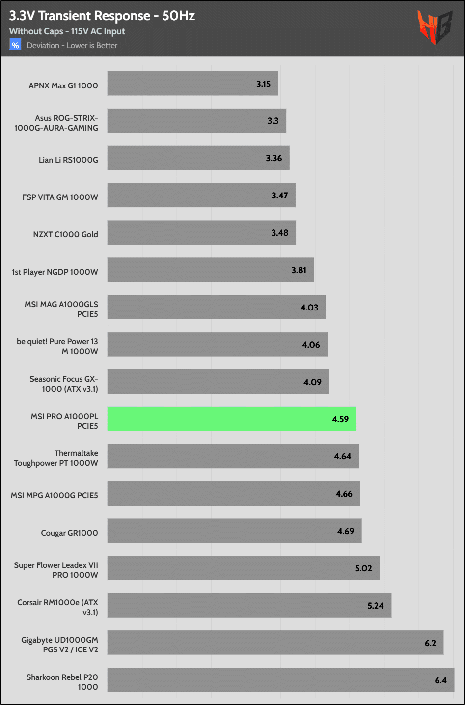 The transient response is decent at 12V and 5V, and mediocre at 3.3V.