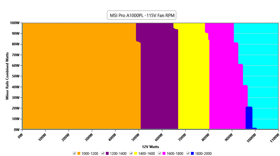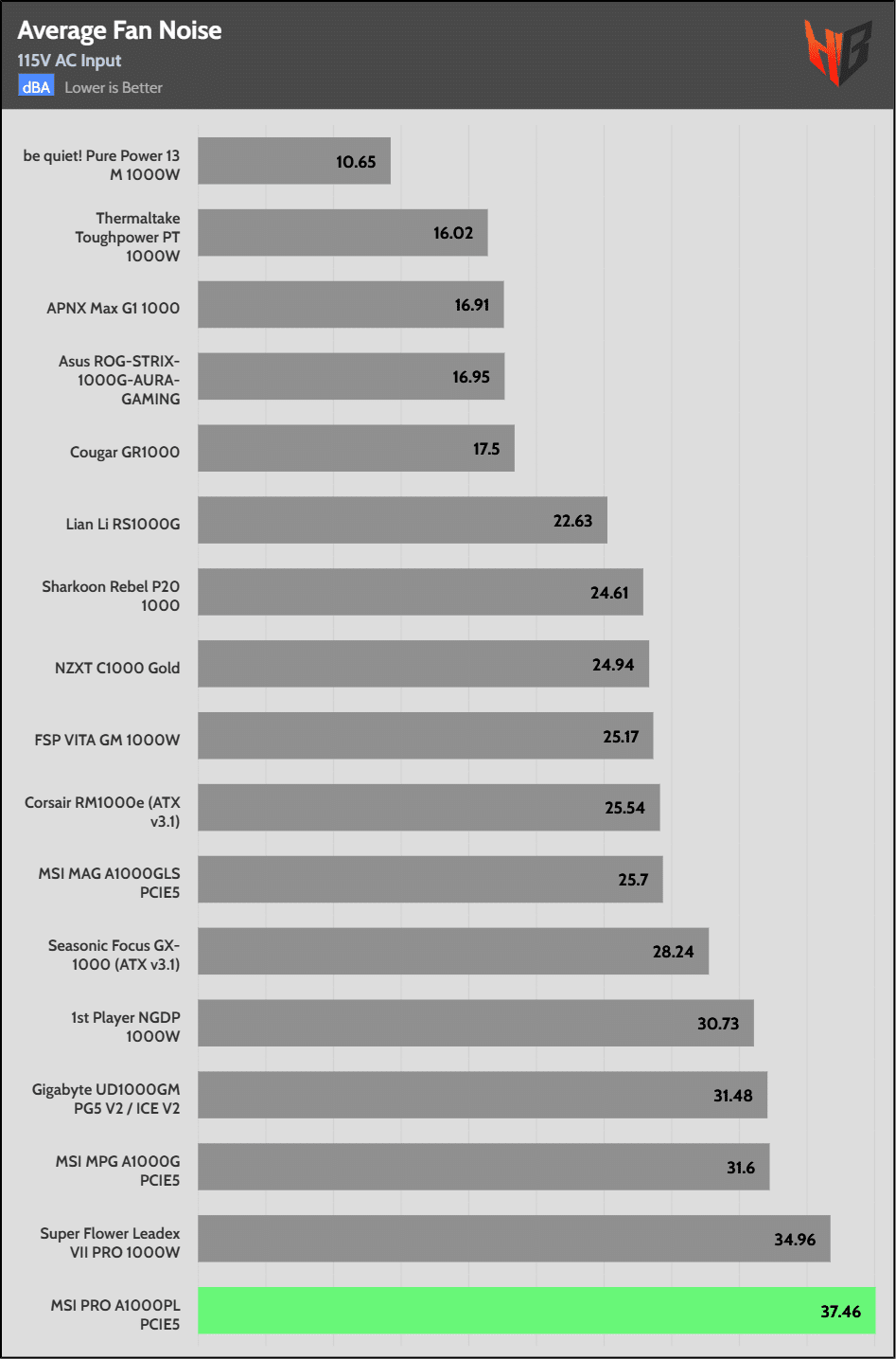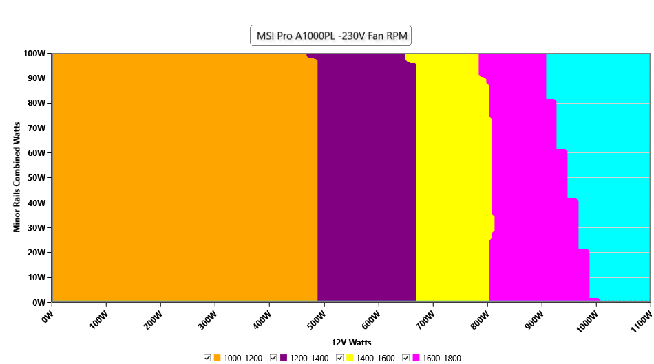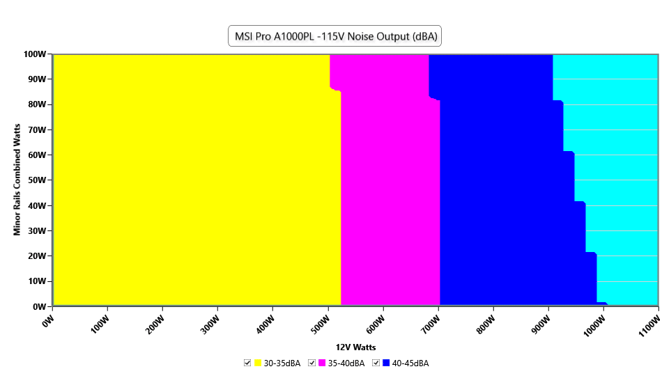 There is no passive operation for the fan, but this is not what you should be worried about. The increased fan speed from the start should alarm future owners of this PSU, since it starts at over 30 dBA. With more than 525W, the fan’s noise goes over 35 dBA, and with 700W and higher loads, you will be treated to more than 40 dBA. Apparently, this PSU is not for the average user who needs a silent PSU.