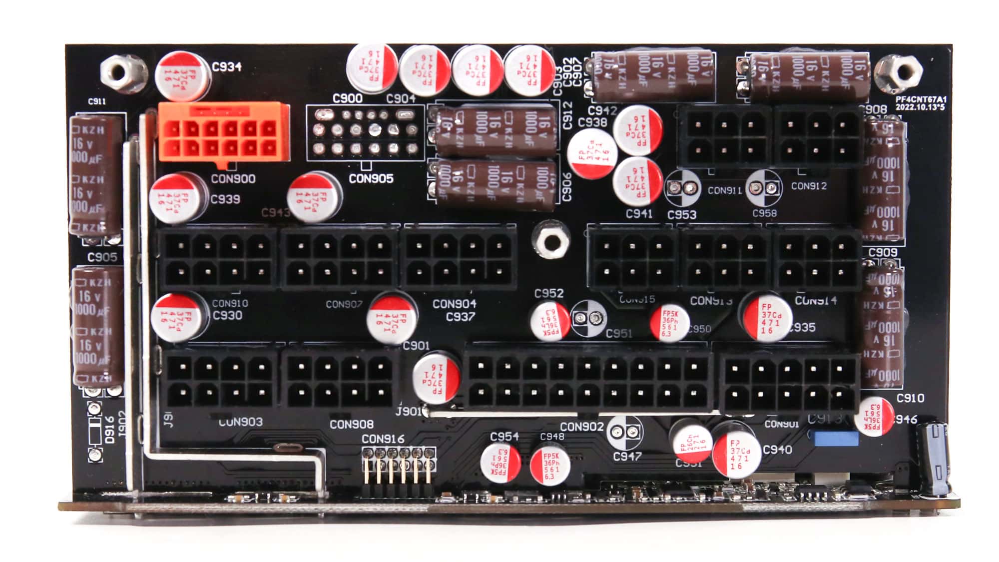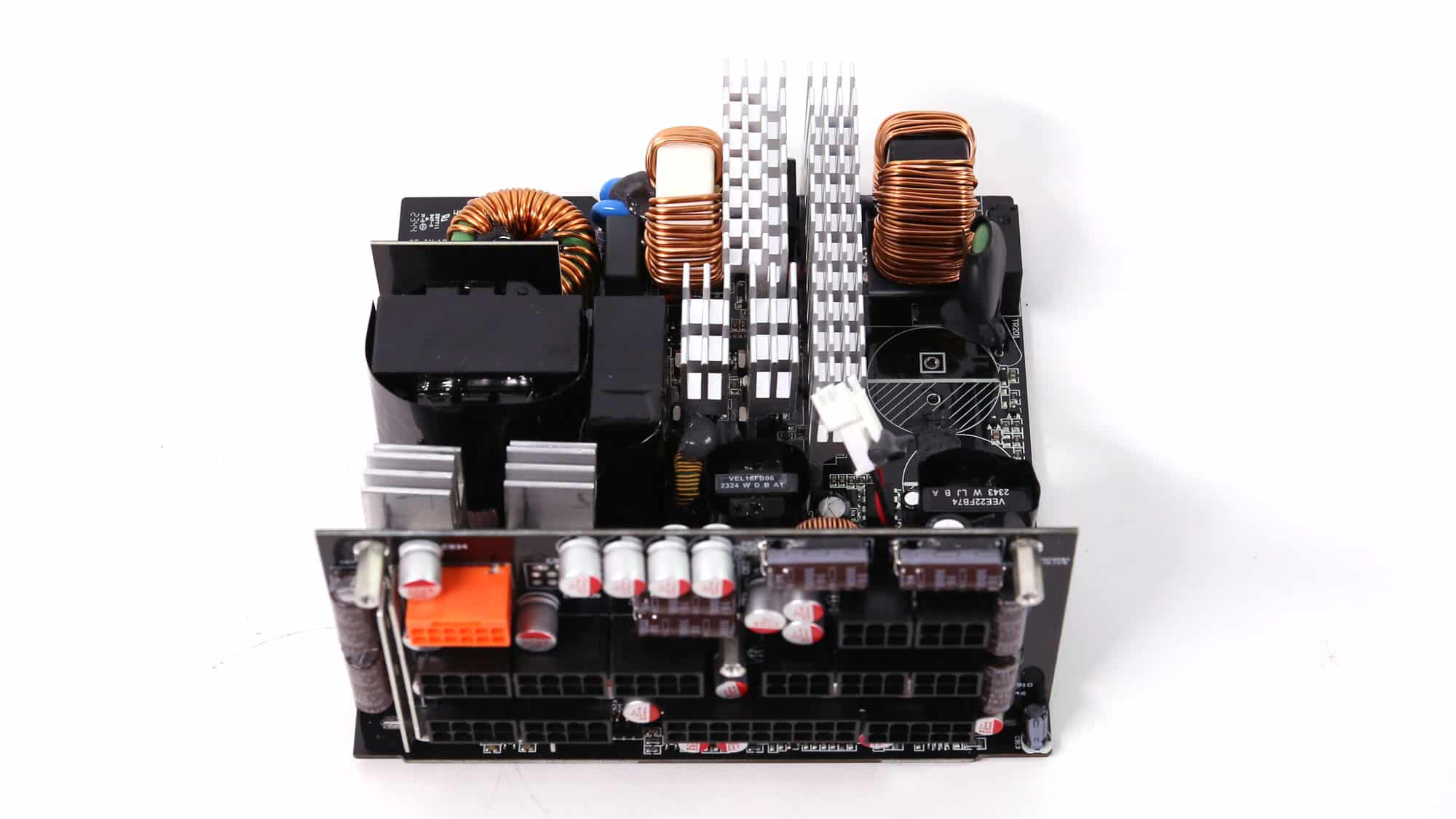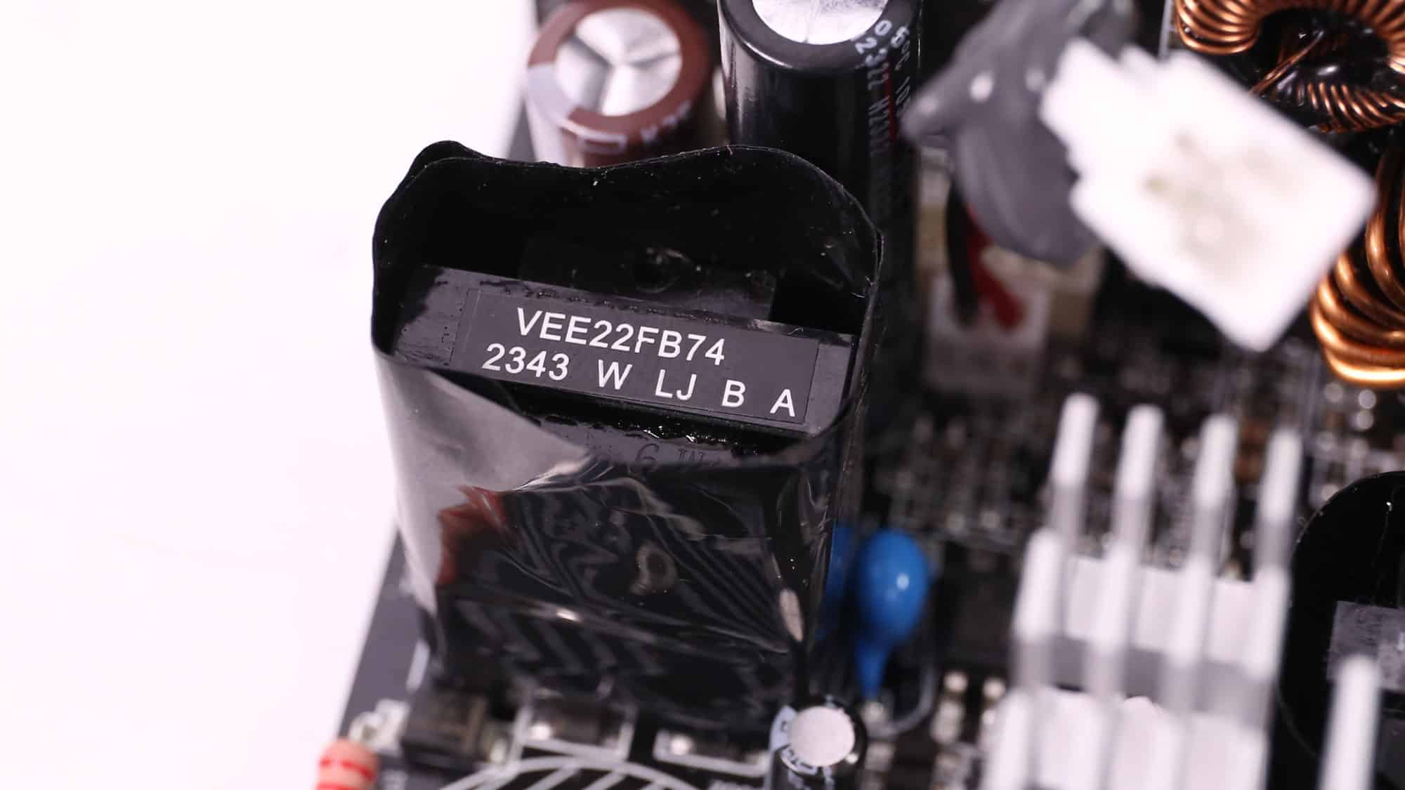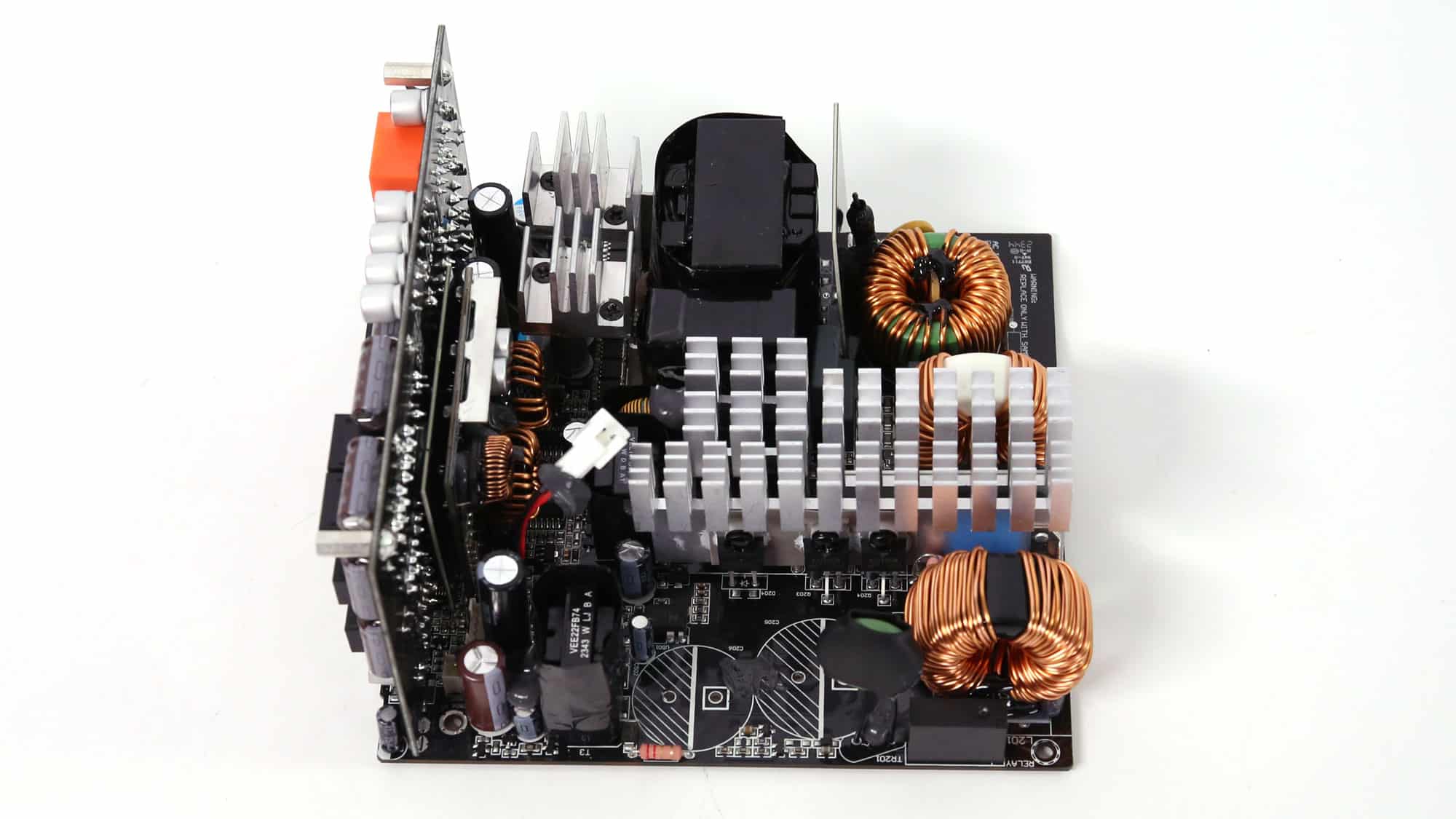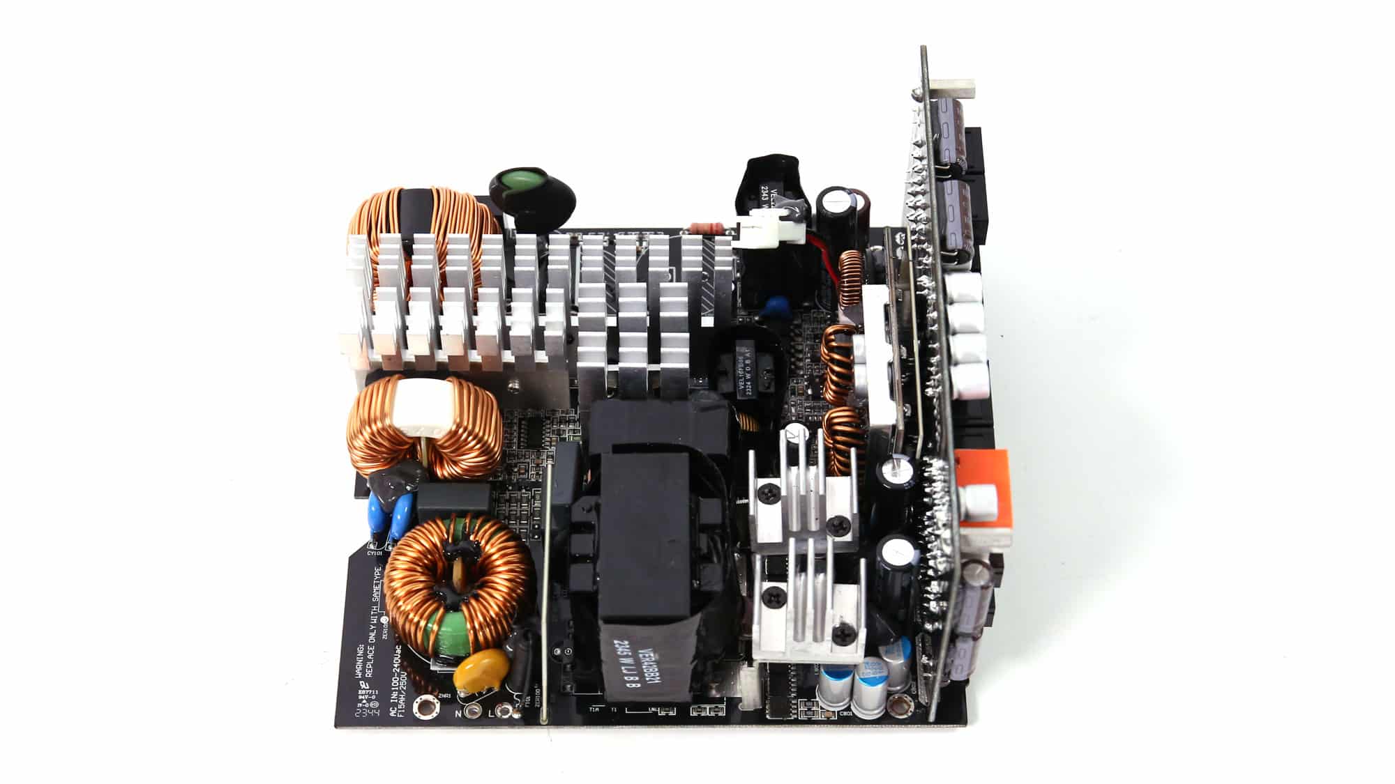 Seasonic provides the platform, featuring a contemporary design with a full-bridge topology on the primary side and an LLC resonant converter for reduced energy losses. There is enough space between parts on the PCB to allow for good airflow. The primary heatsink is large enough; the same goes for the heatsinks handling the 12V FETs on the PCB’s business side. The interesting part of this design is that no components are installed on the PCB’s back side, not even the 12V FETs.