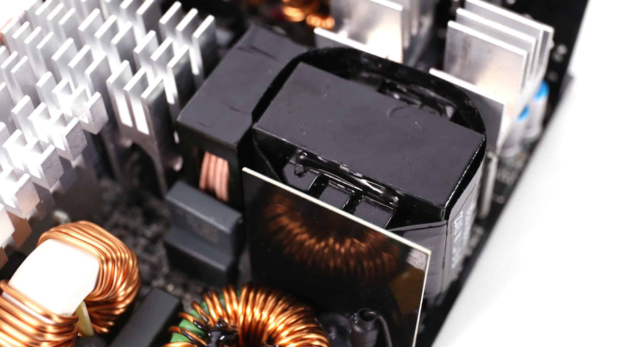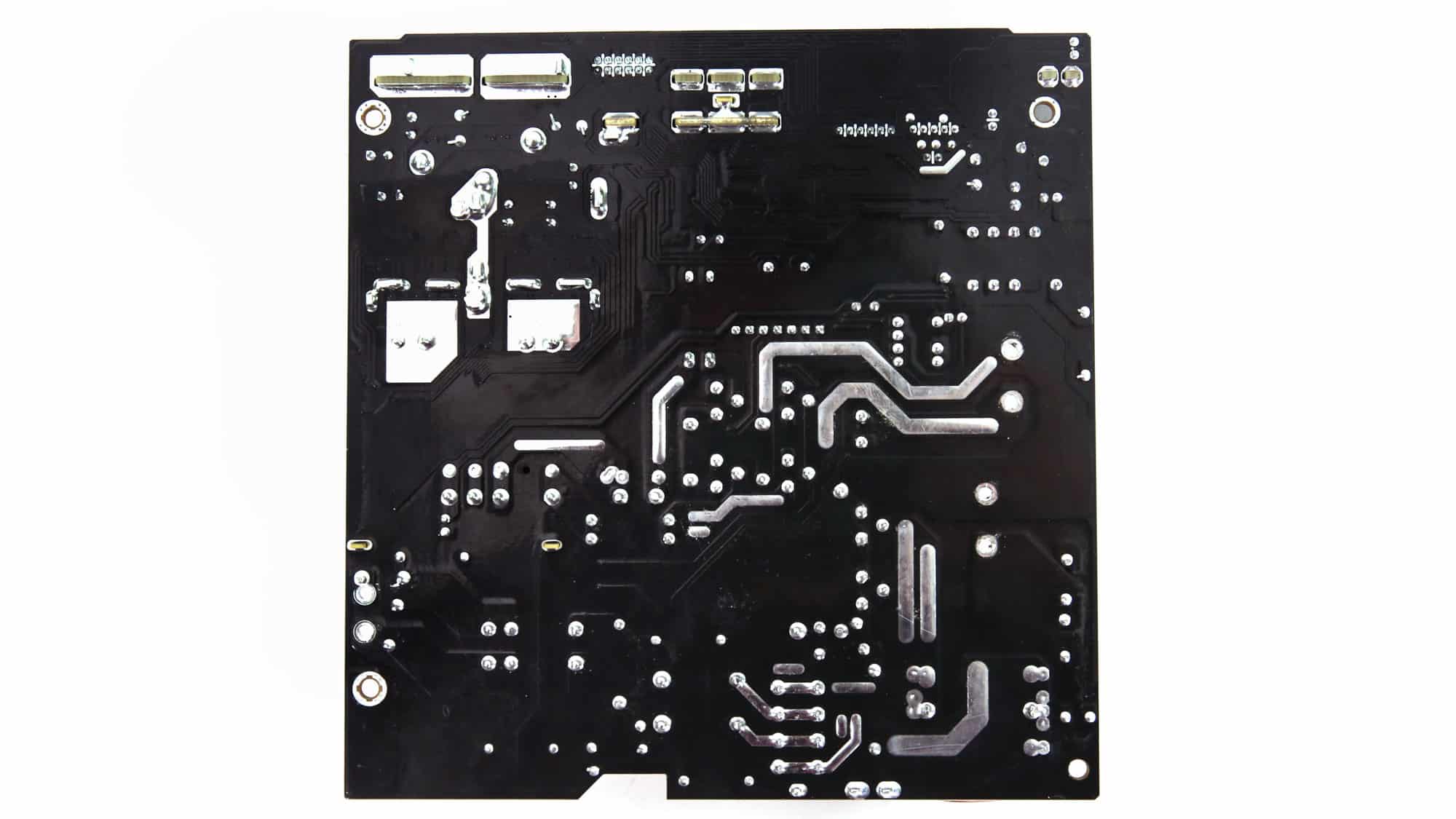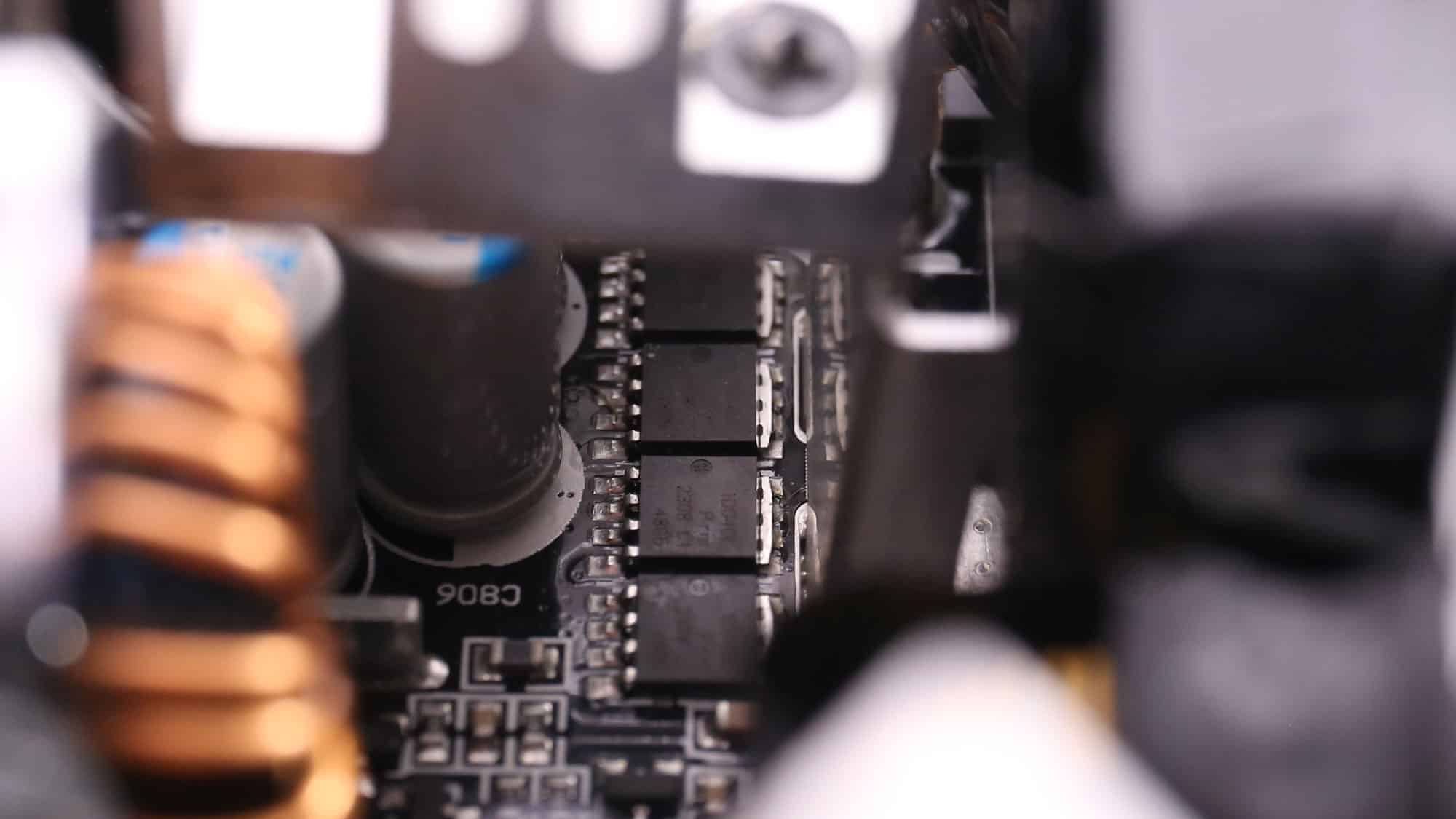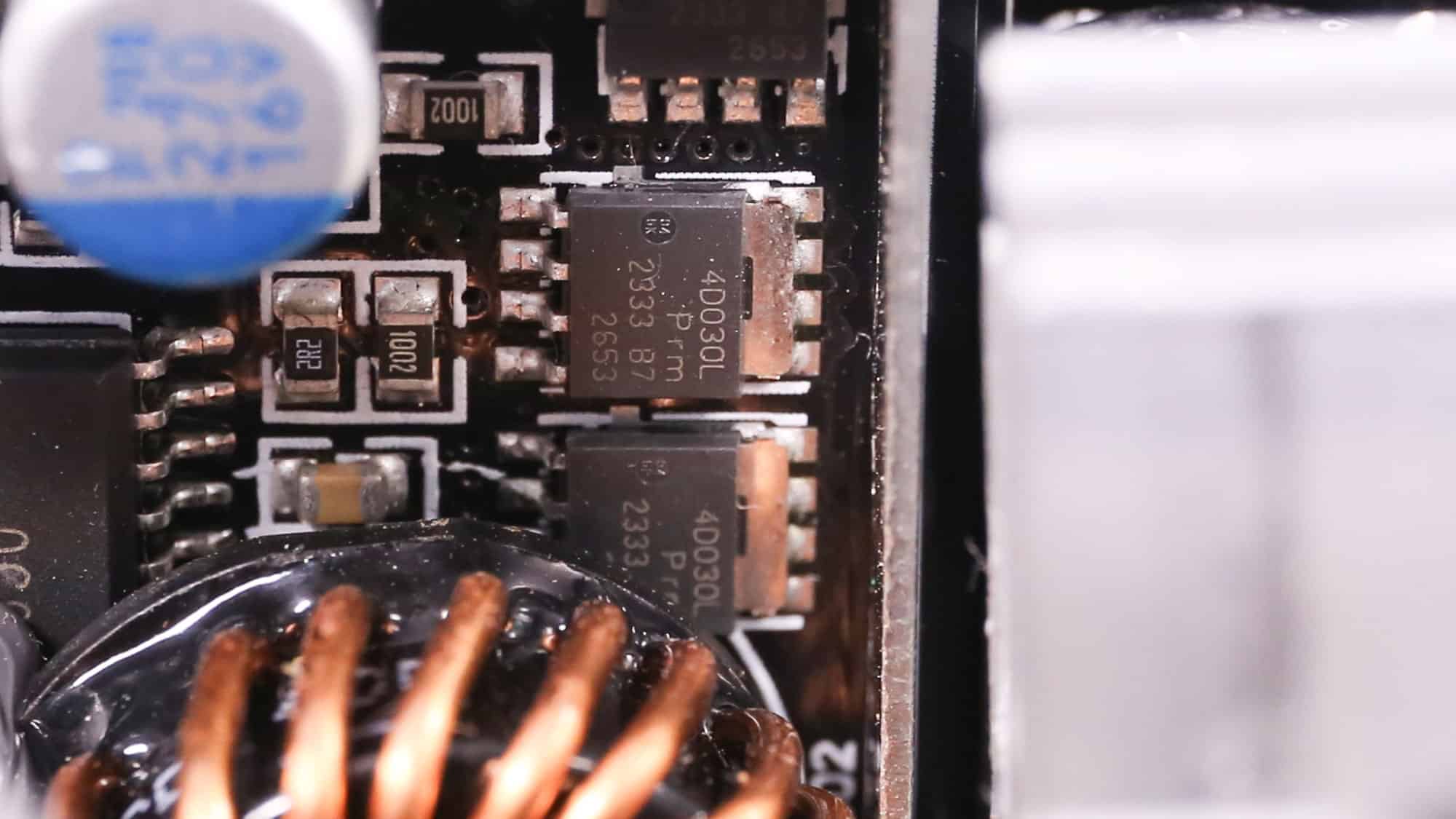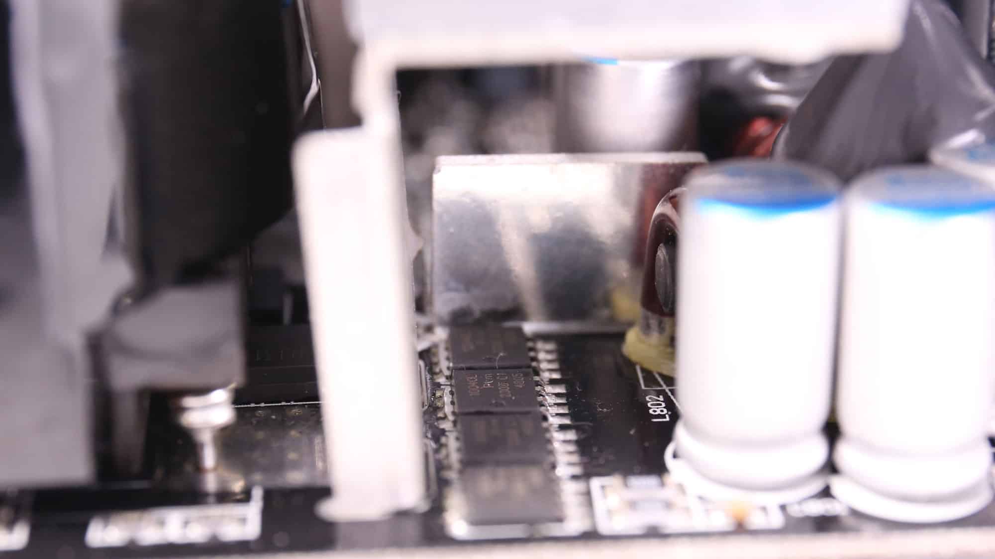 Seasonic provides the platform, featuring a contemporary design with a full-bridge topology on the primary side and an LLC resonant converter for reduced energy losses. There is enough space between parts on the PCB to allow for good airflow. The primary heatsink is large enough; the same goes for the heatsinks handling the 12V FETs on the PCB’s business side. The interesting part of this design is that no components are installed on the PCB’s back side, not even the 12V FETs.