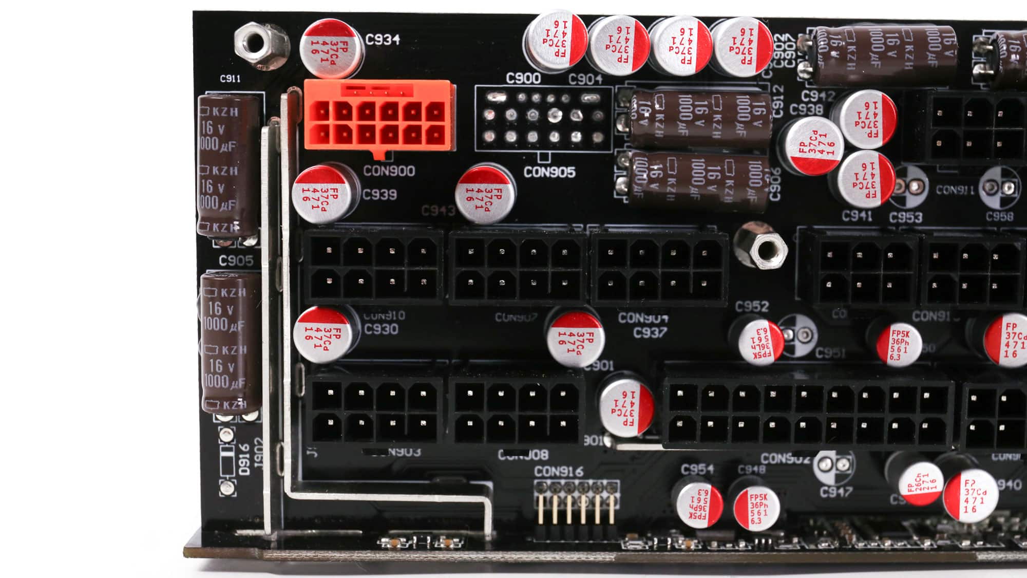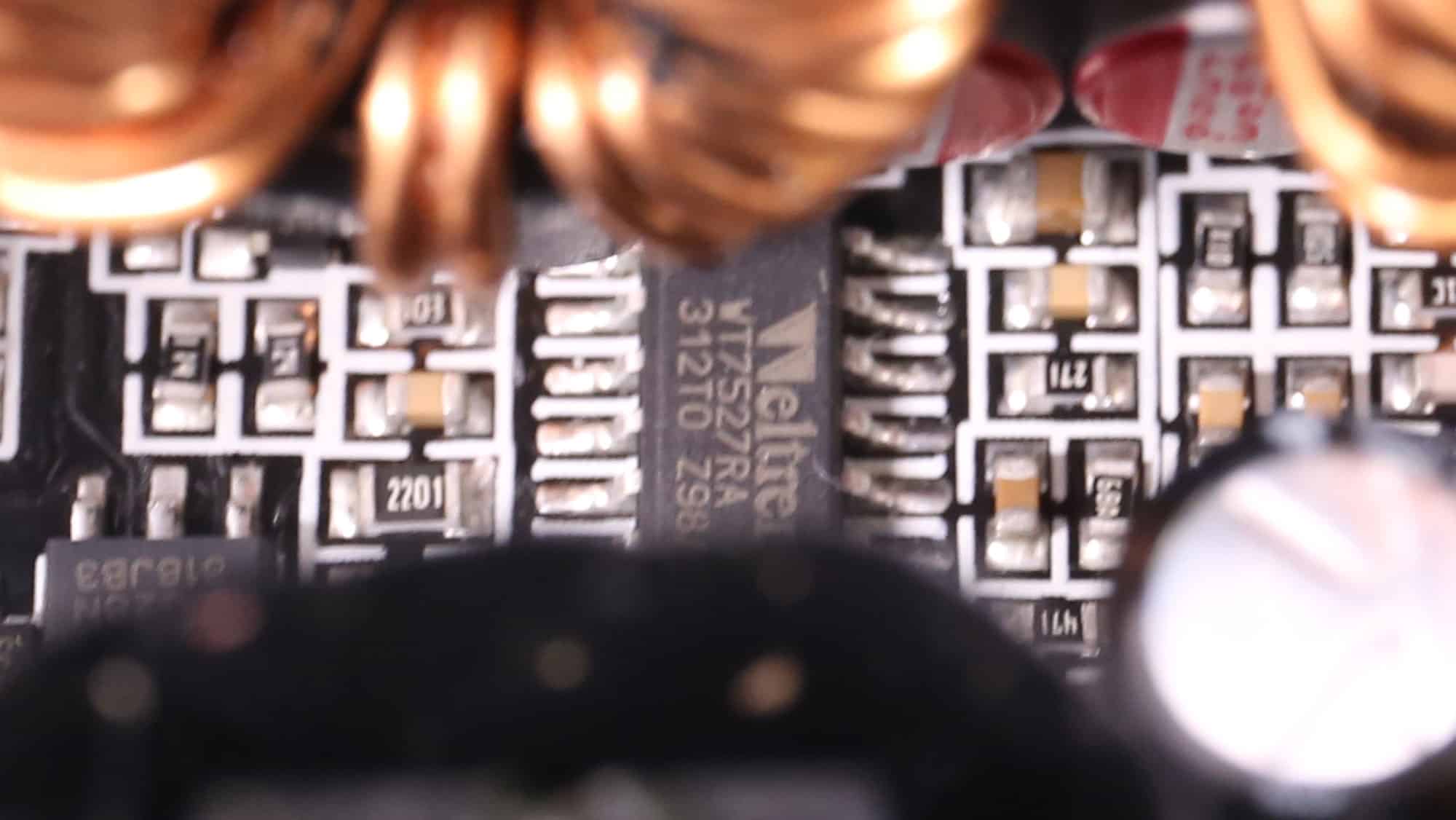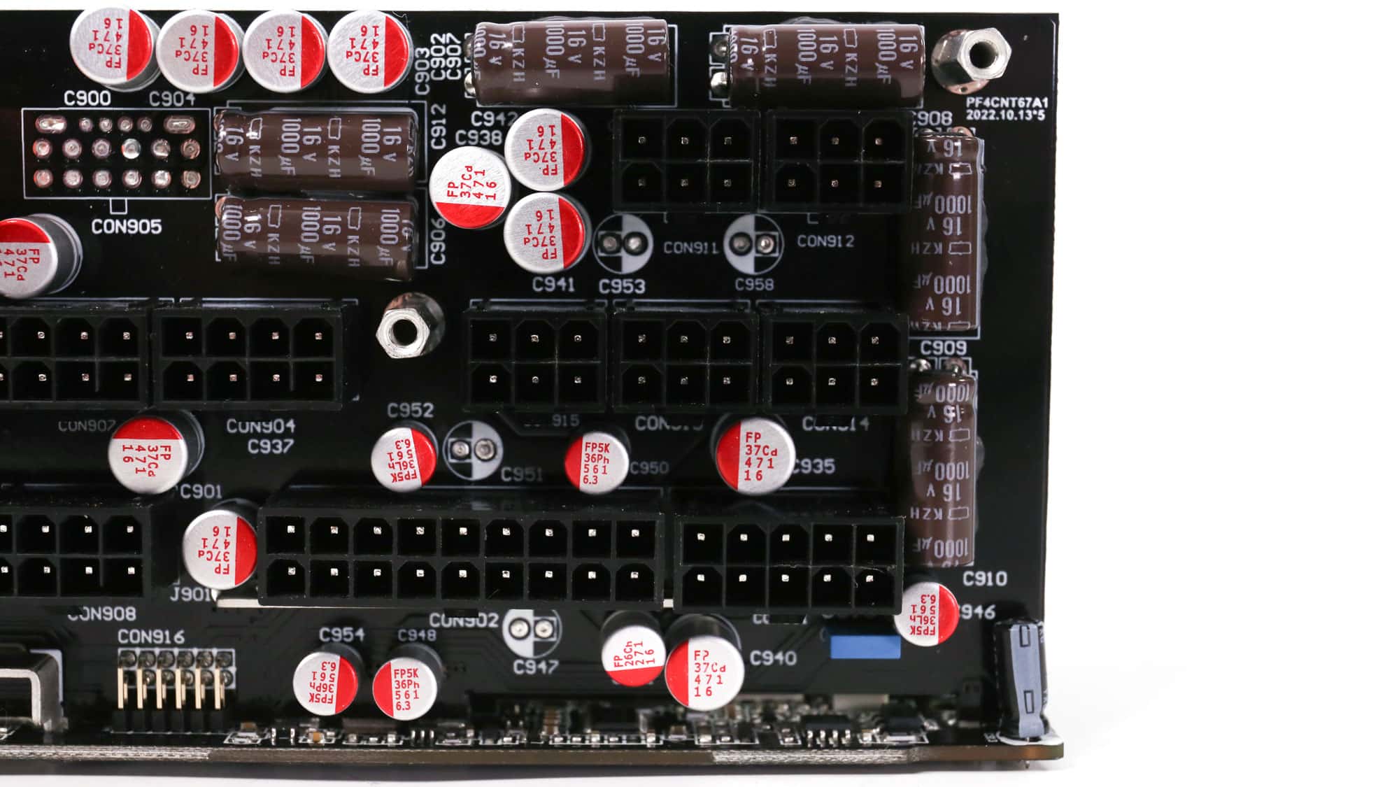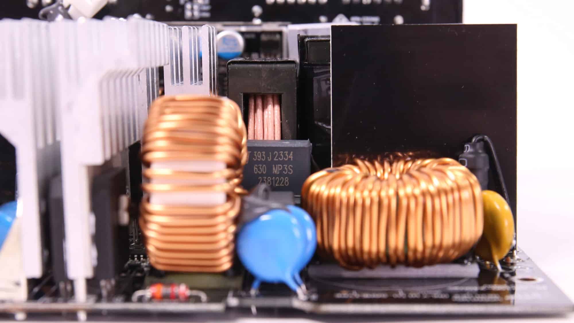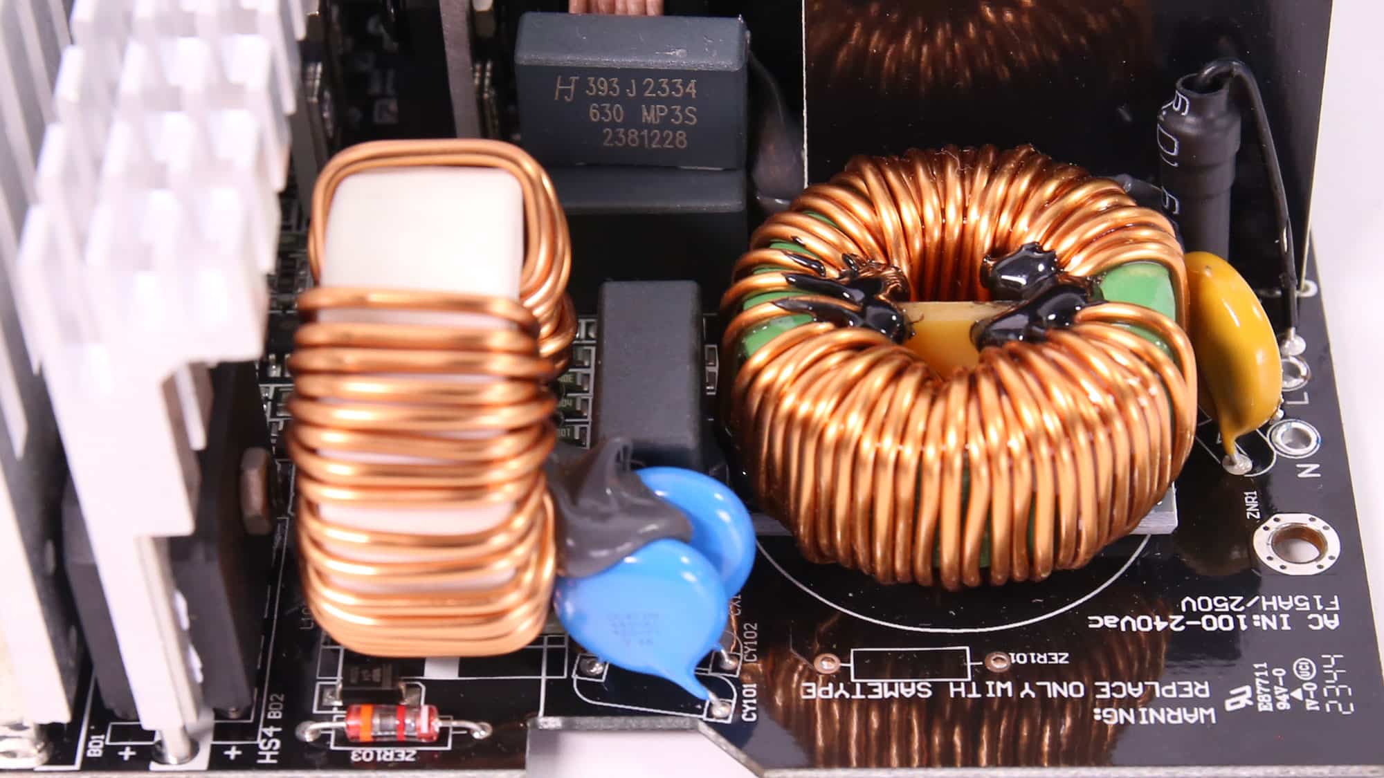 Seasonic provides the platform, featuring a contemporary design with a full-bridge topology on the primary side and an LLC resonant converter for reduced energy losses. There is enough space between parts on the PCB to allow for good airflow. The primary heatsink is large enough; the same goes for the heatsinks handling the 12V FETs on the PCB’s business side. The interesting part of this design is that no components are installed on the PCB’s back side, not even the 12V FETs.