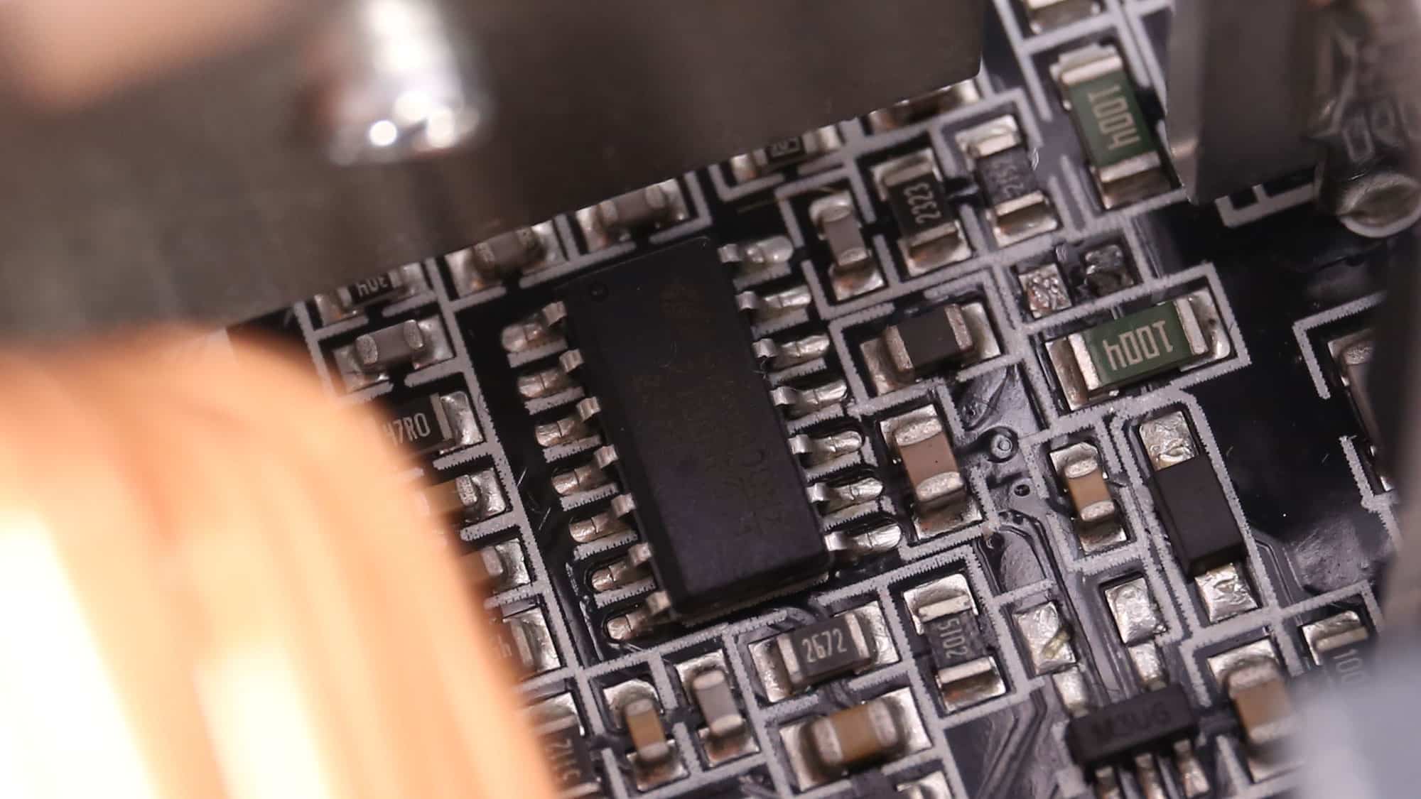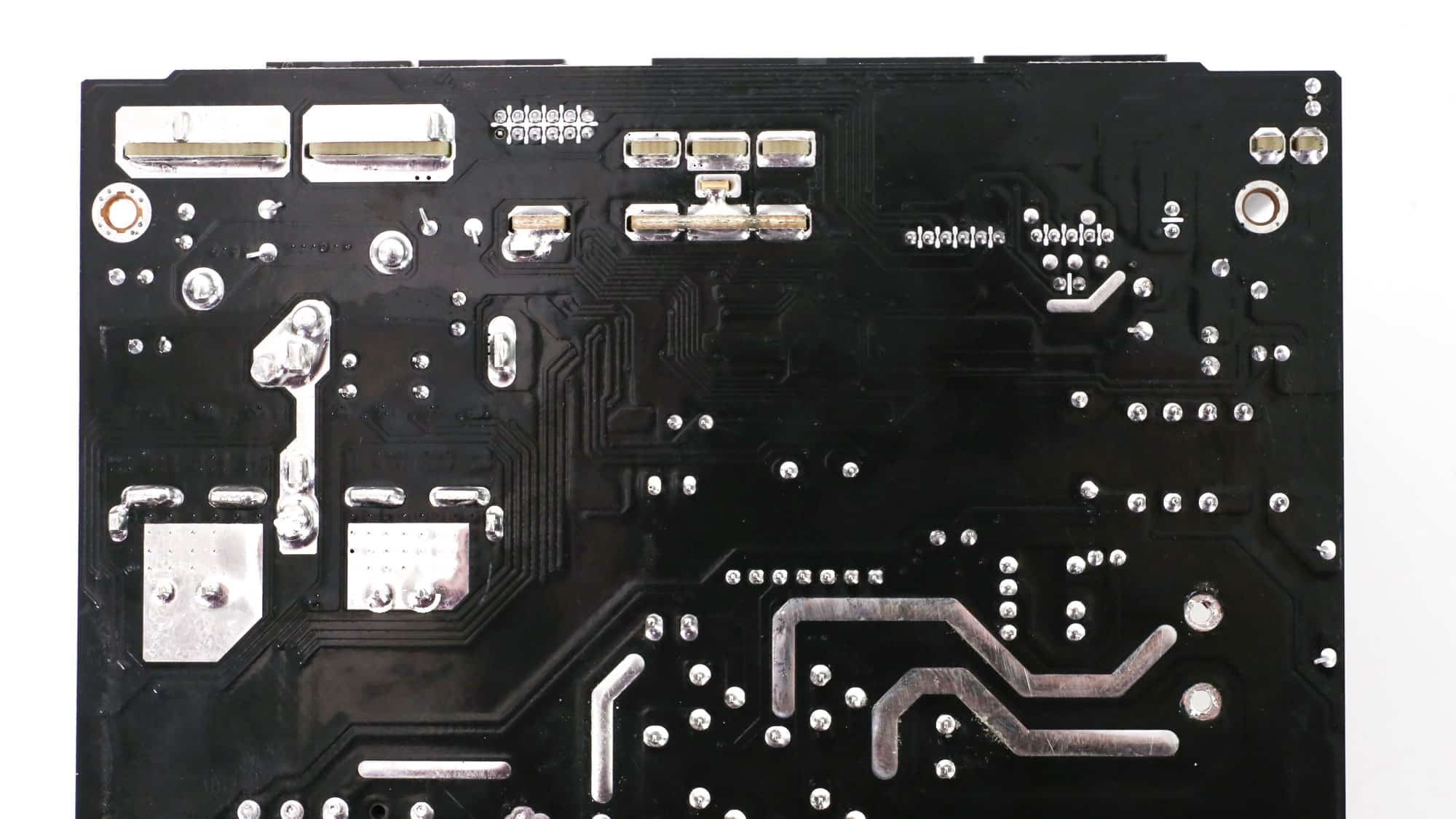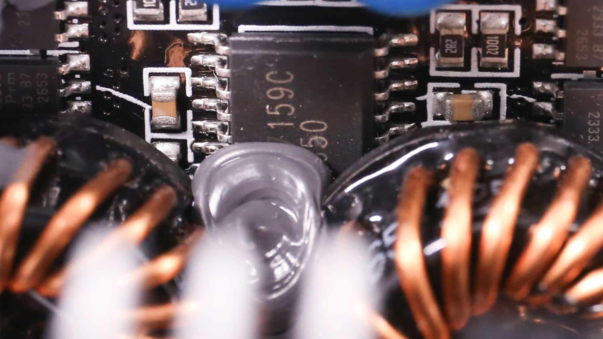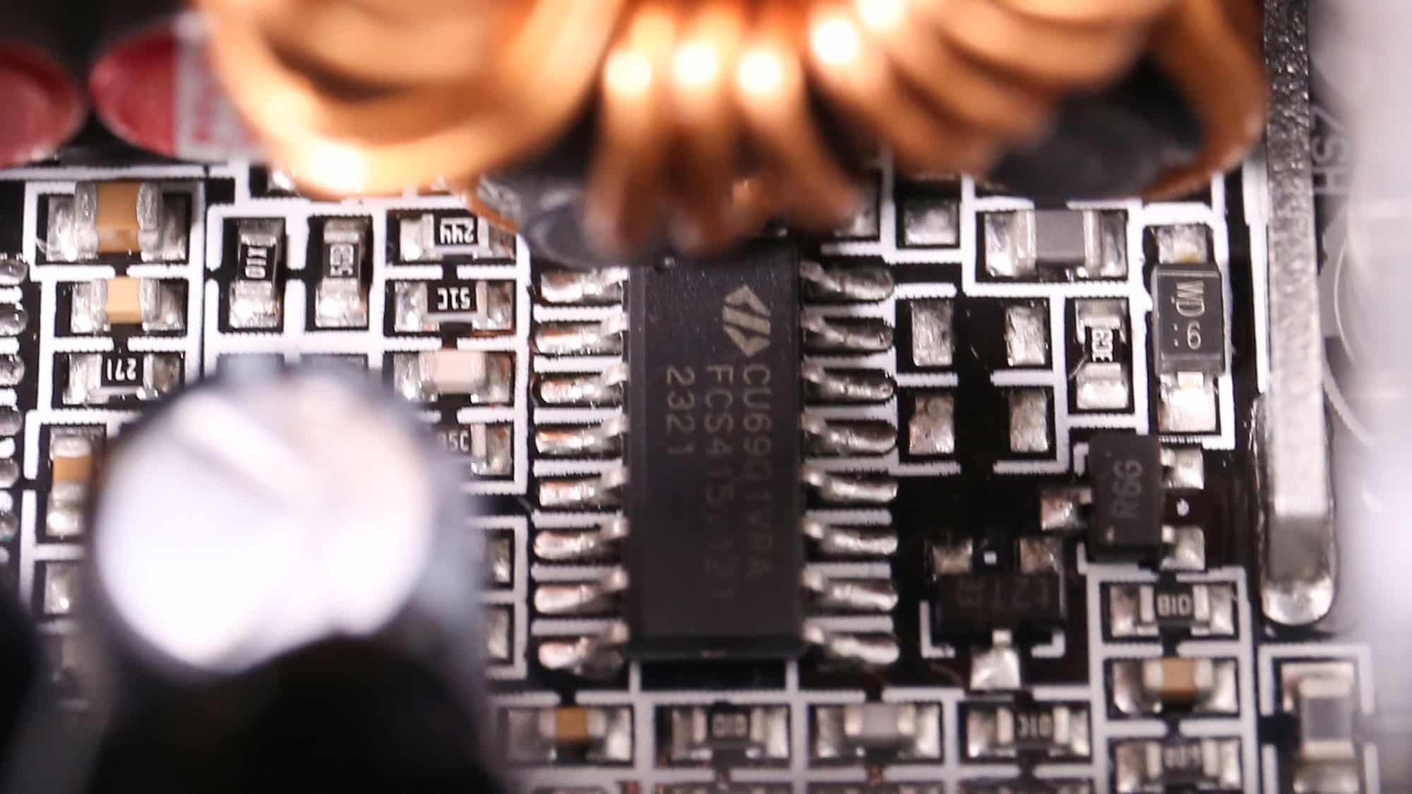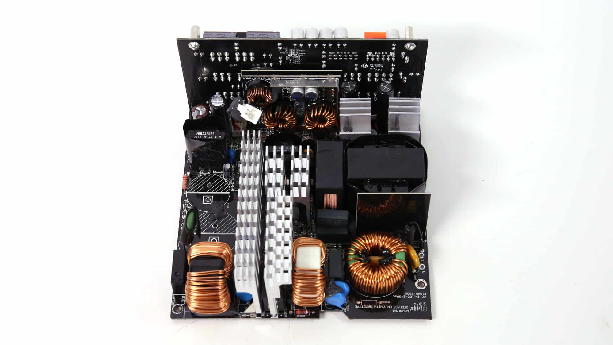 Seasonic provides the platform, featuring a contemporary design with a full-bridge topology on the primary side and an LLC resonant converter for reduced energy losses. There is enough space between parts on the PCB to allow for good airflow. The primary heatsink is large enough; the same goes for the heatsinks handling the 12V FETs on the PCB’s business side. The interesting part of this design is that no components are installed on the PCB’s back side, not even the 12V FETs.