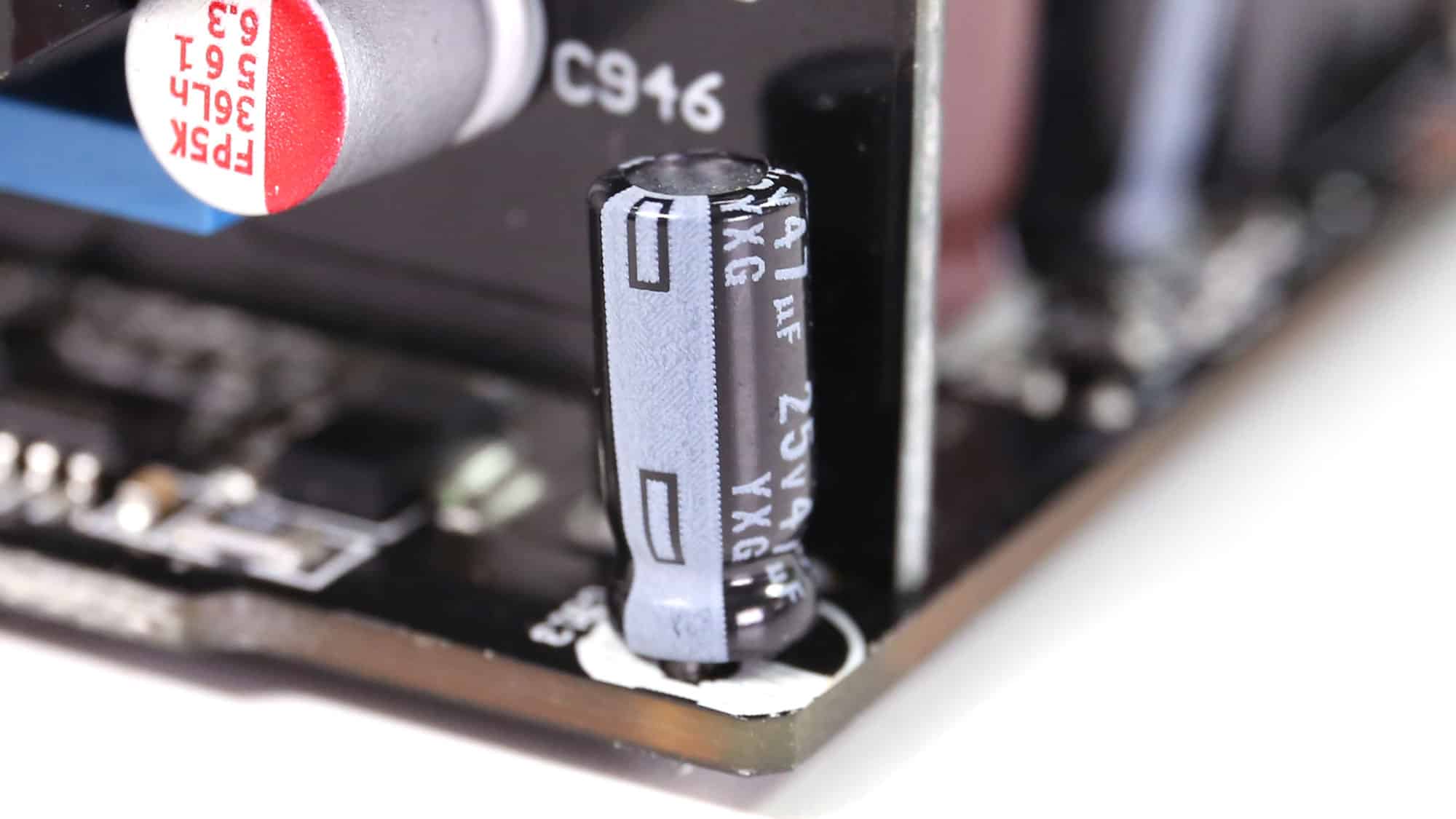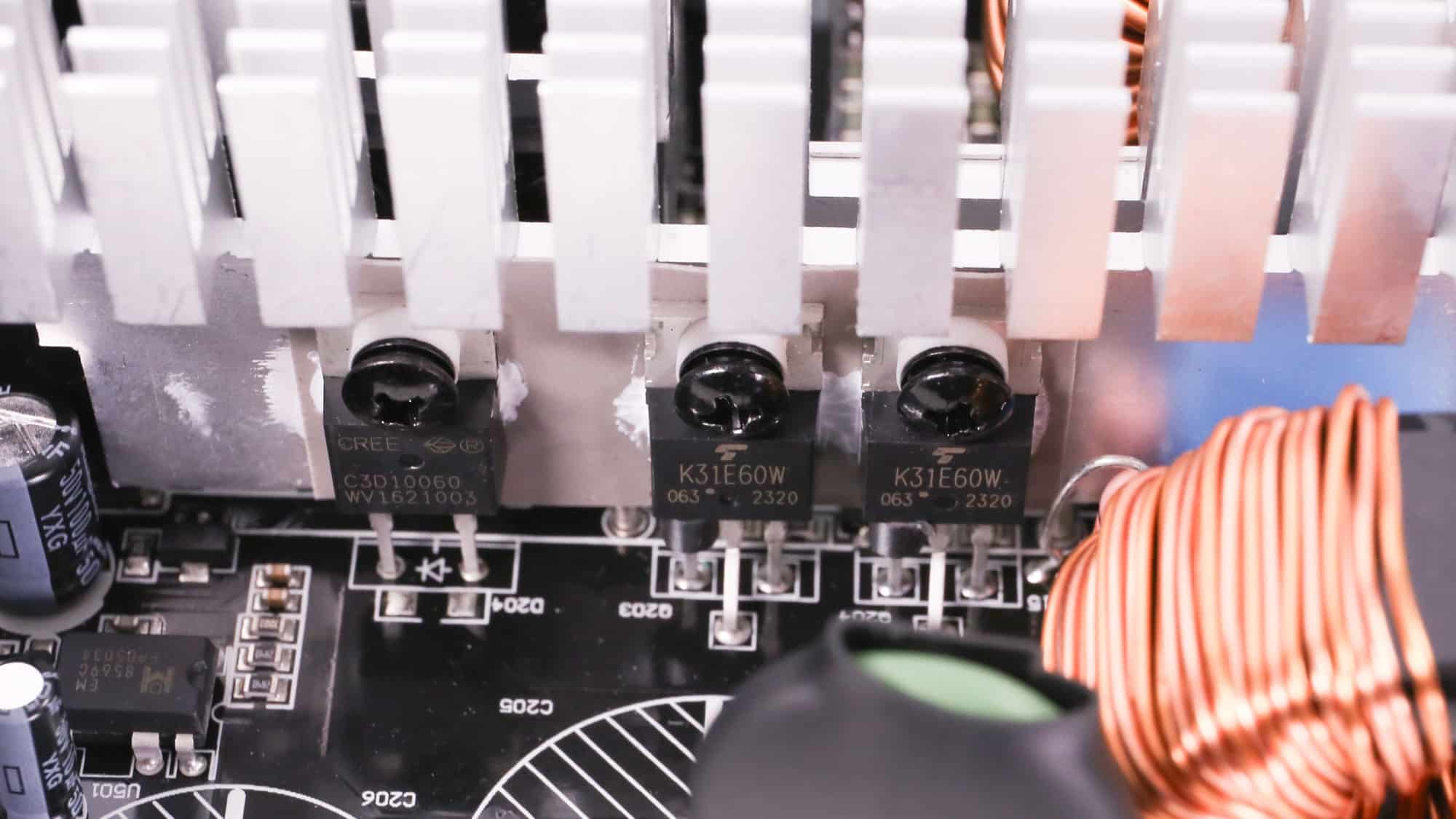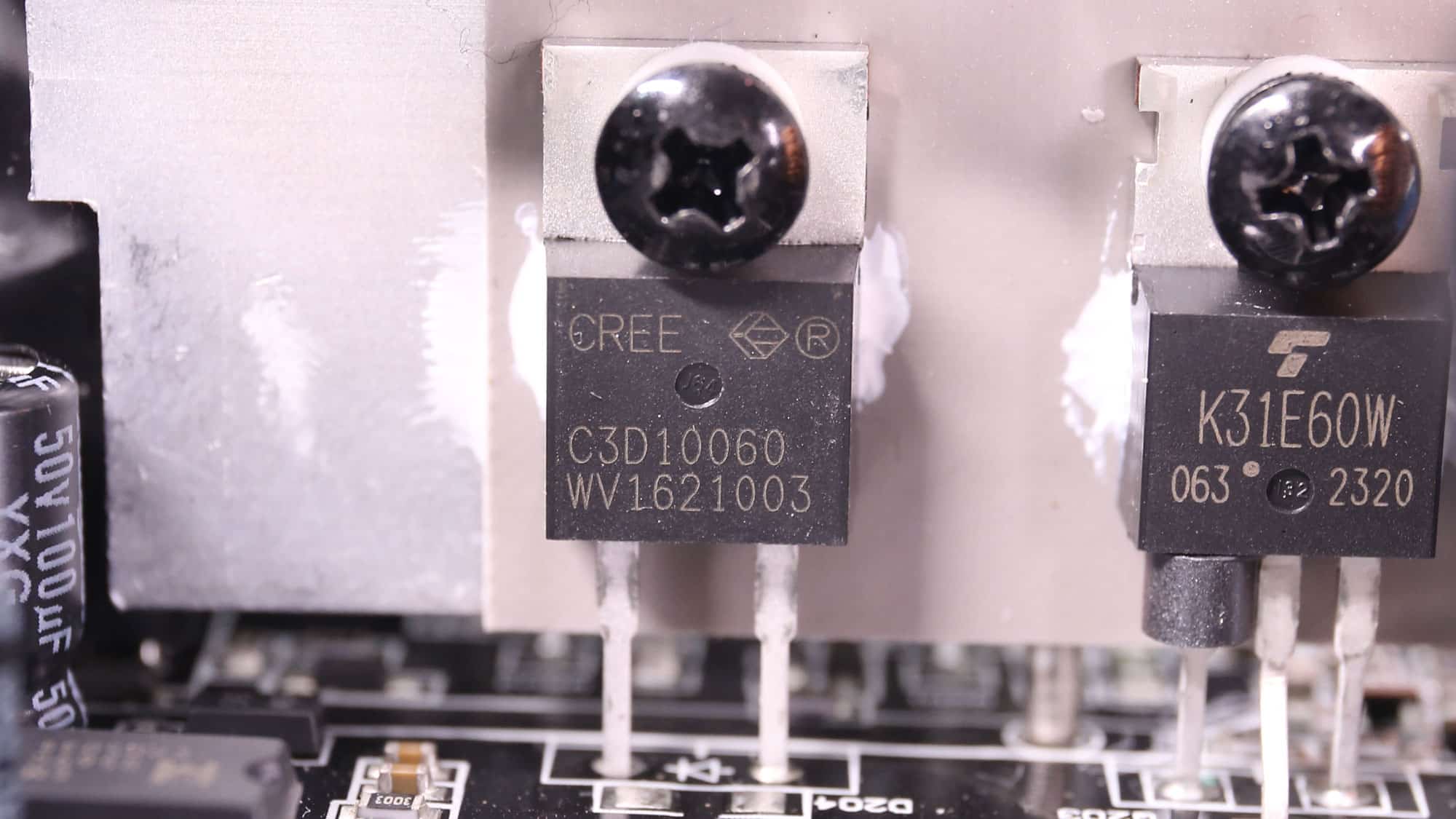 The APFC converter uses two Toshiba TK31E60W FETs and one CREE C3D10060A boost diode. Nippon Chemi-Con manufactures the bulk capacitors. Their combined capacity is 1150 μF, and both are rated for 2,000 hours at 105 °C. The voltage rating is 420V, which is higher than the APFC’s DC bus voltage (approximately 380-400V DC).