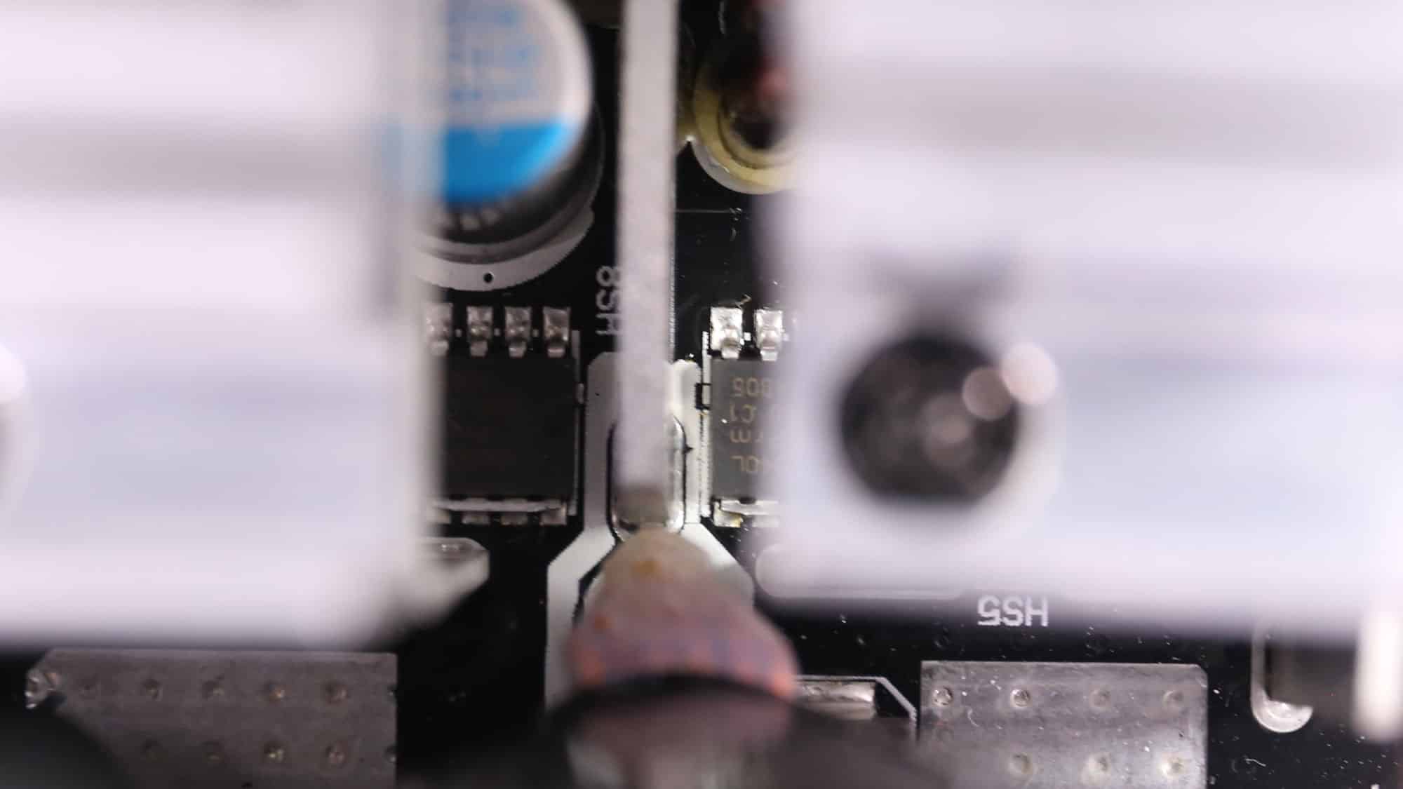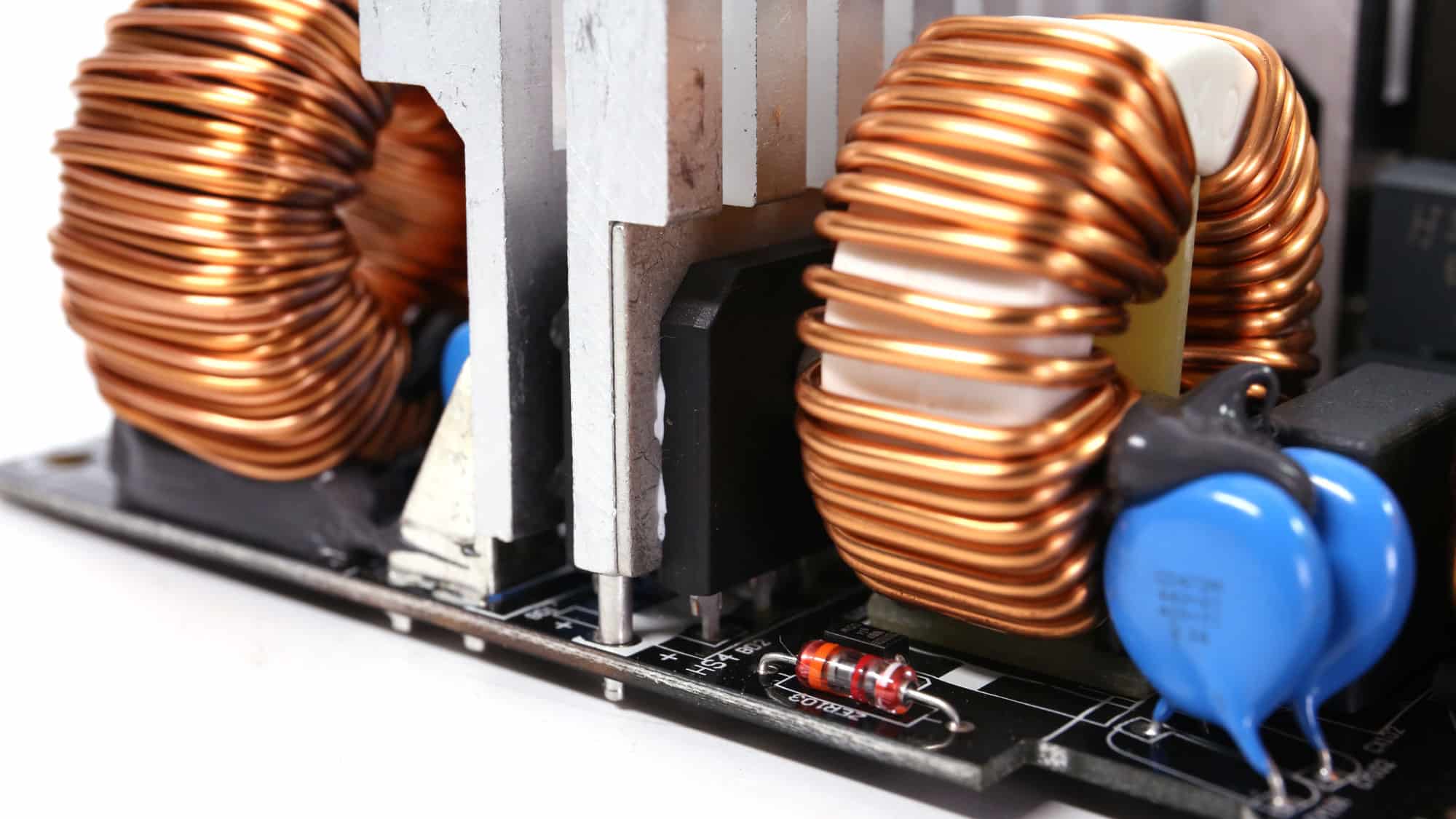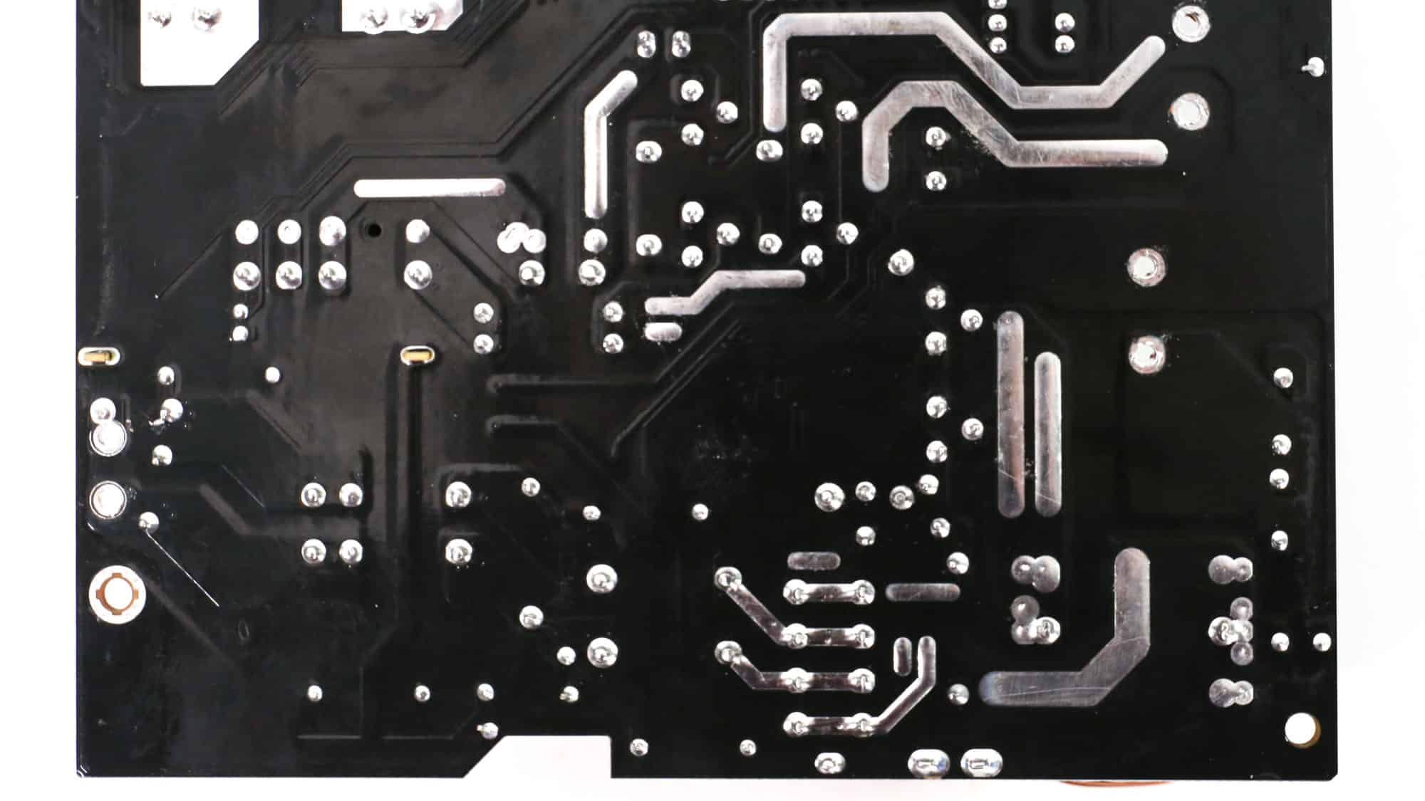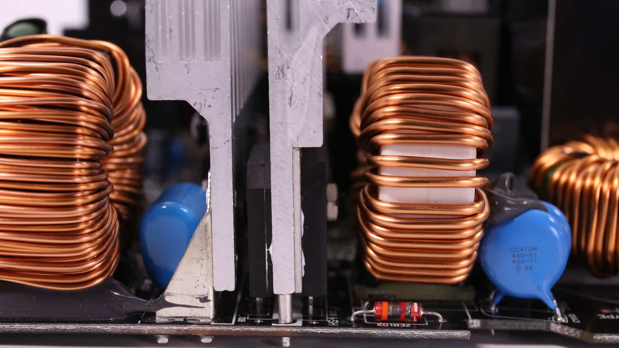 The APFC converter uses two Toshiba TK31E60W FETs and one CREE C3D10060A boost diode. Nippon Chemi-Con manufactures the bulk capacitors. Their combined capacity is 1150 μF, and both are rated for 2,000 hours at 105 °C. The voltage rating is 420V, which is higher than the APFC’s DC bus voltage (approximately 380-400V DC).