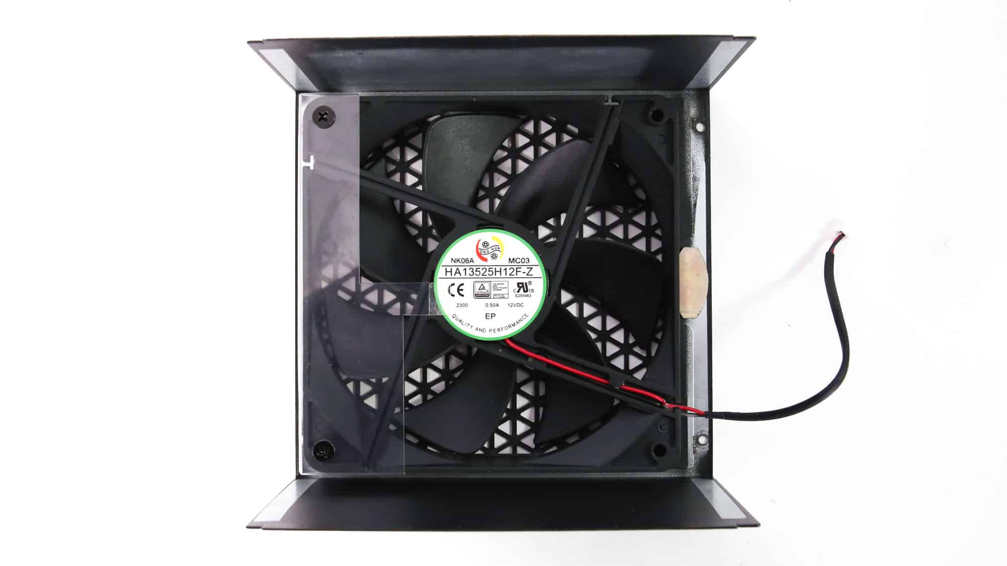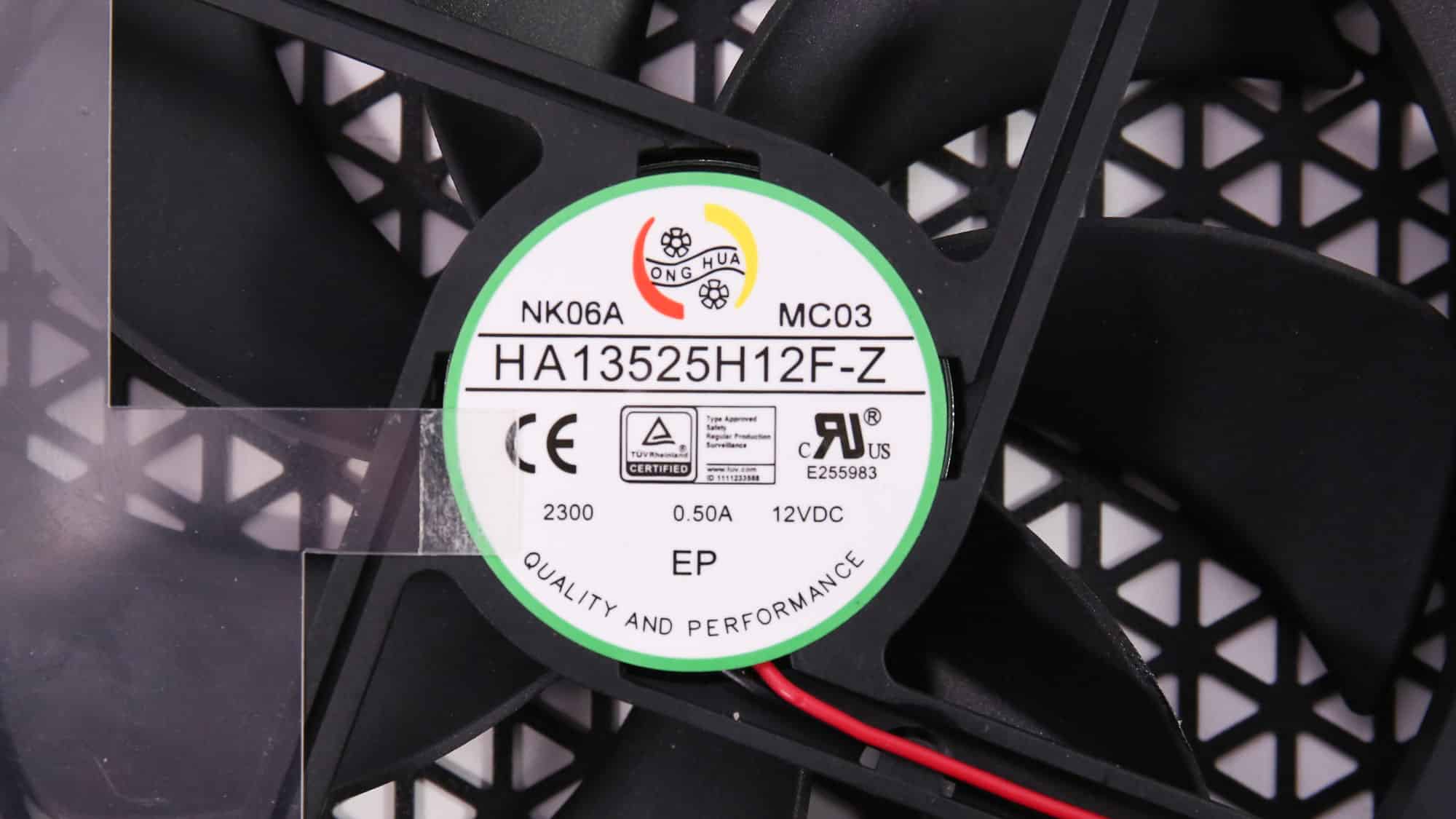The cooling fan is a Hong Hua HA13525H12F-Z, utilizing a fluid dynamic bearing.