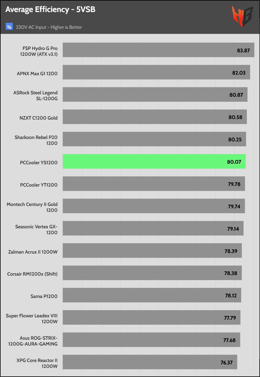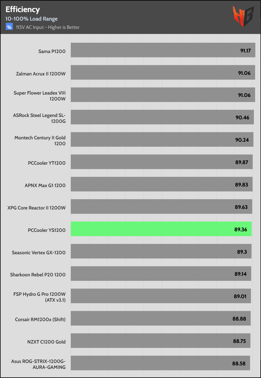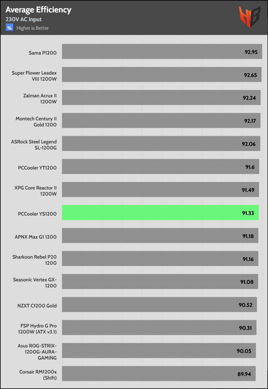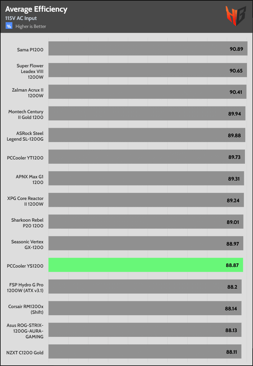 The average efficiency meets the Cybenetics Gold criteria at 115V and cleares the Platinum requirements at 230V.
