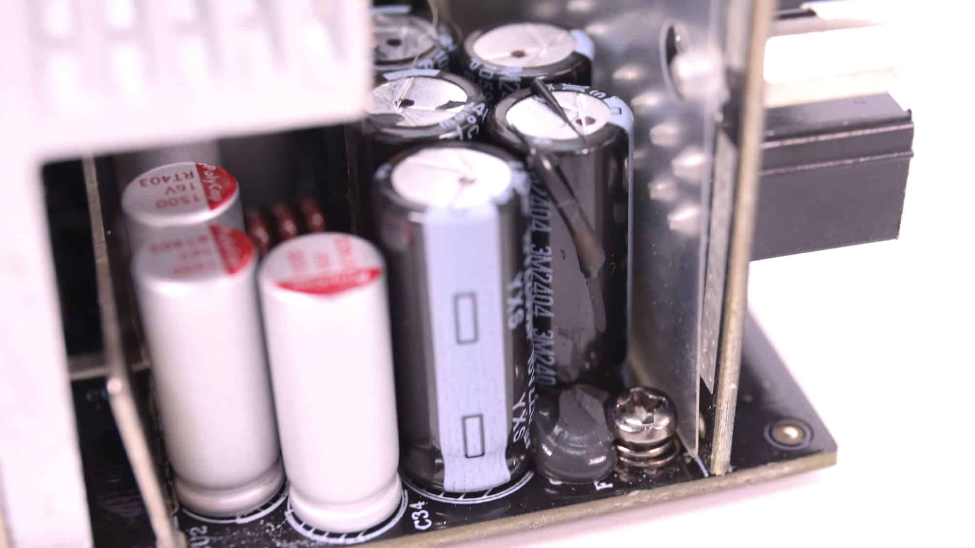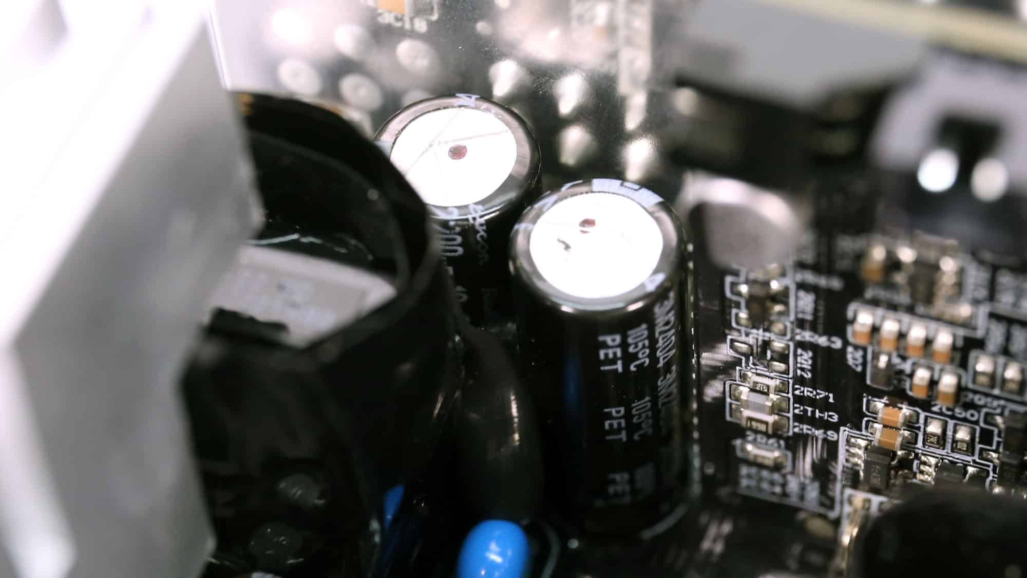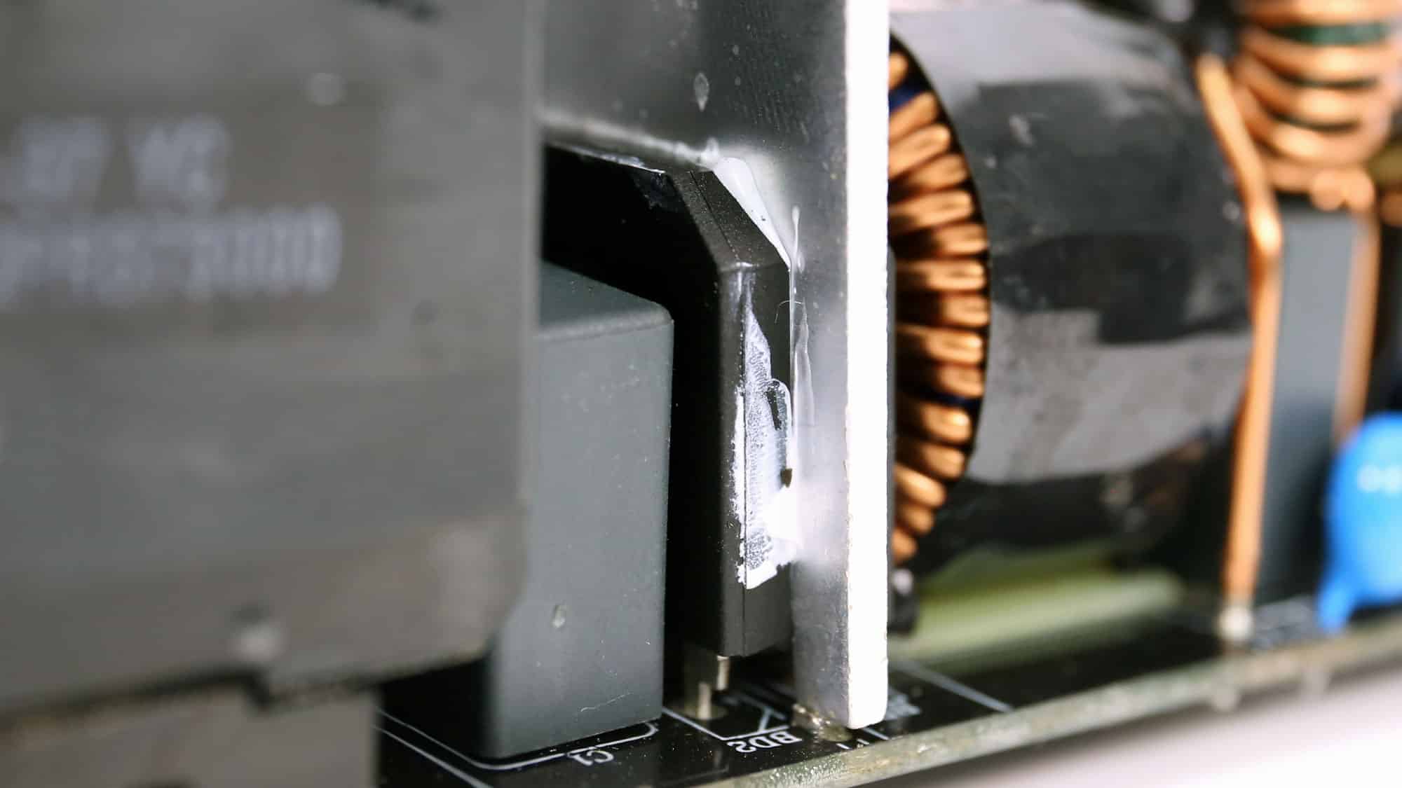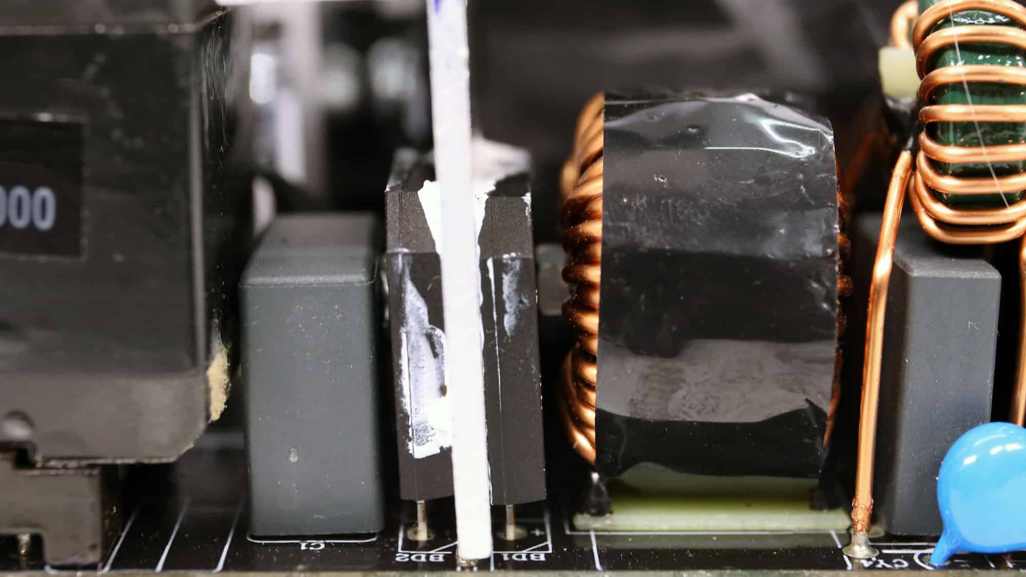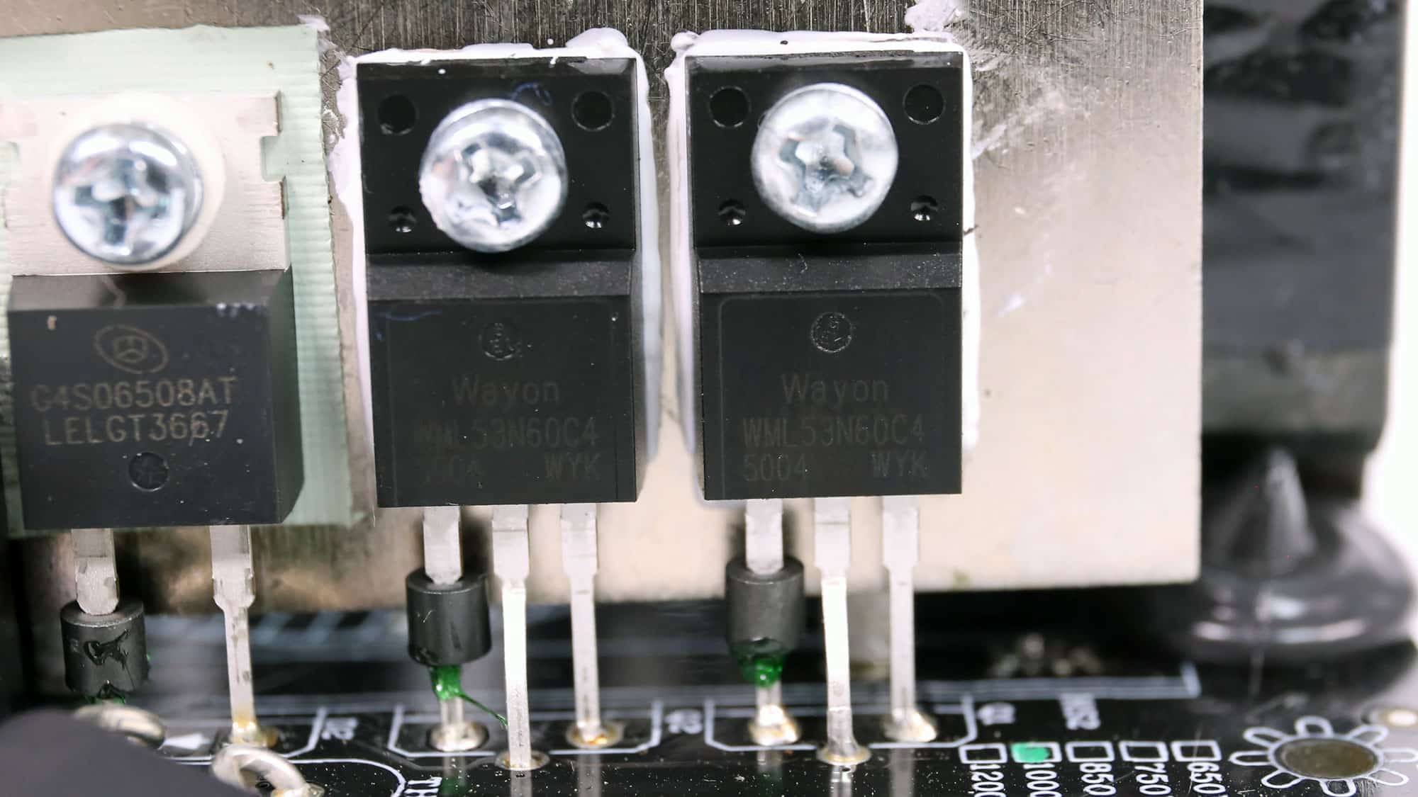The APFC converter uses two Way-on WML53N60C4 FETs and one Global Power Technology G4S06508AT boost diode. Nippon Chemi-Con manufactures the bulk capacitors. Their combined capacity is 940 μF, and both are rated for 2,000 hours at 105 °C. The voltage rating is 420V, which is higher than the APFC’s DC bus voltage (approximately 380-400V DC).