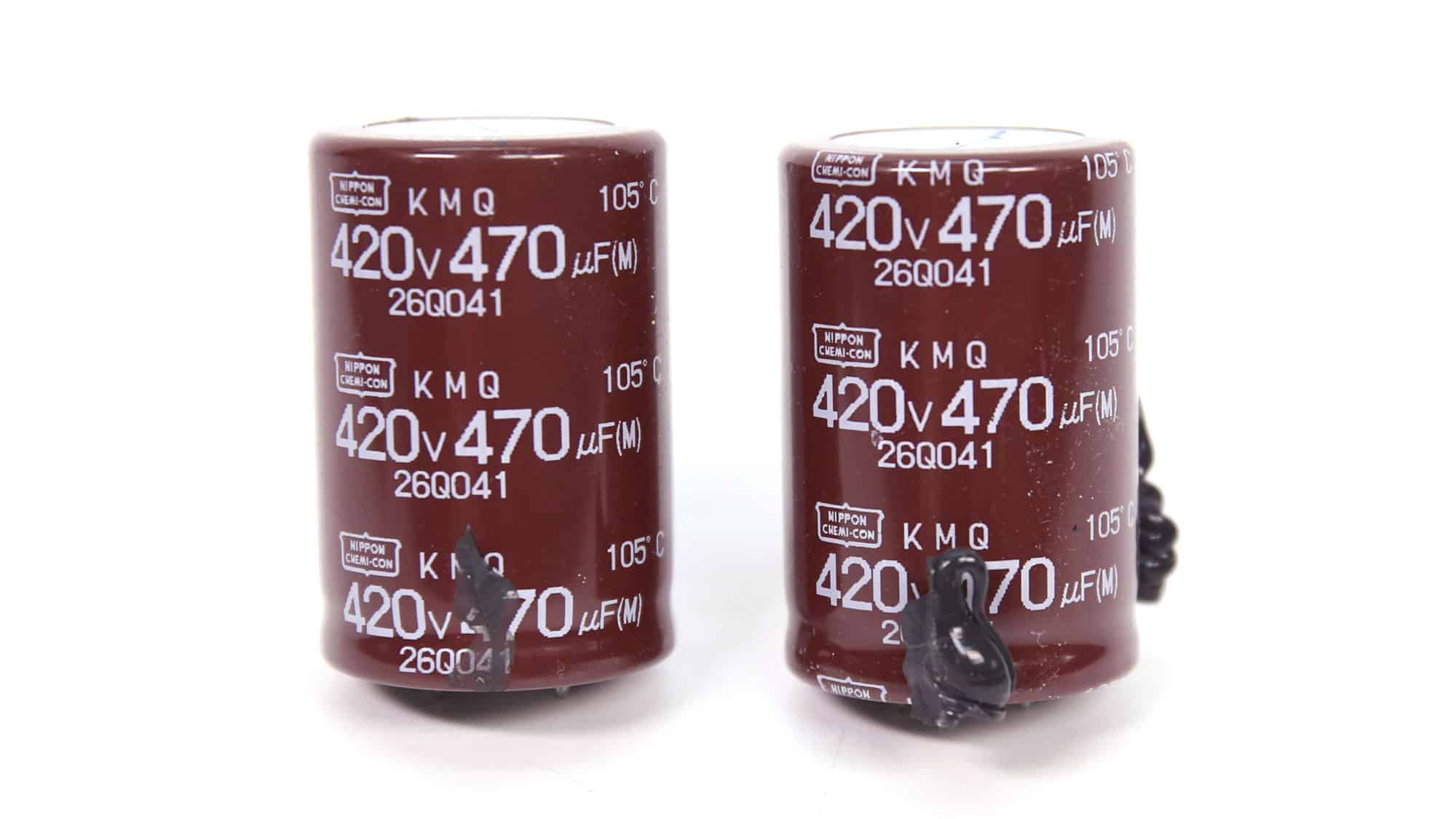 2x Nippon Chemi-Con (420V, 470uF each or 940uF combined, 2000h @ 105°C, KMQ)