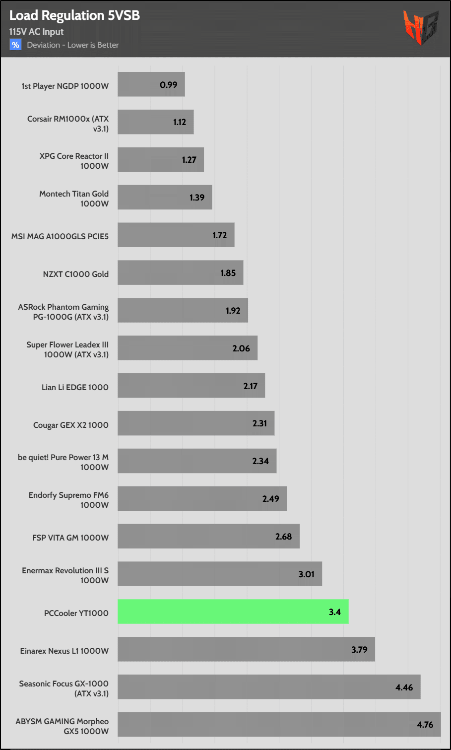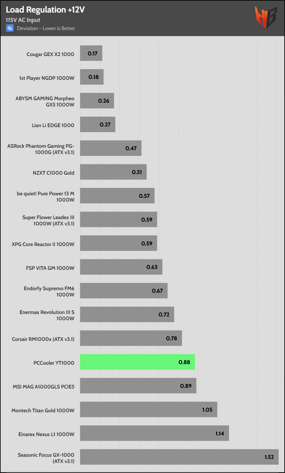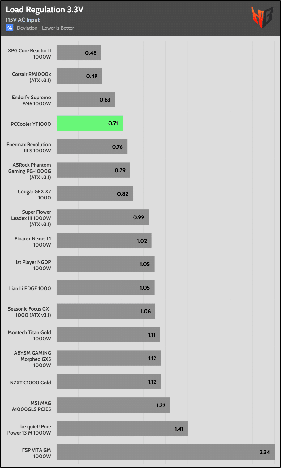 Test | 12V | 5V | 3.3V | 5VSB | DC/AC (Watts) | Efficiency | Fan Speed (RPM) | PSU Noise (dB[A]) | Temps (In/Out) | PF/AC Volts |