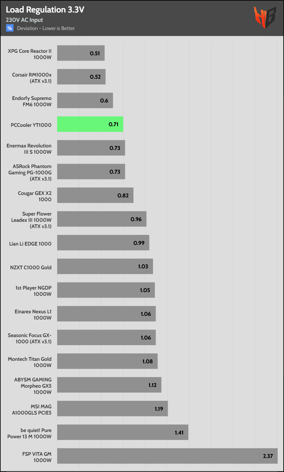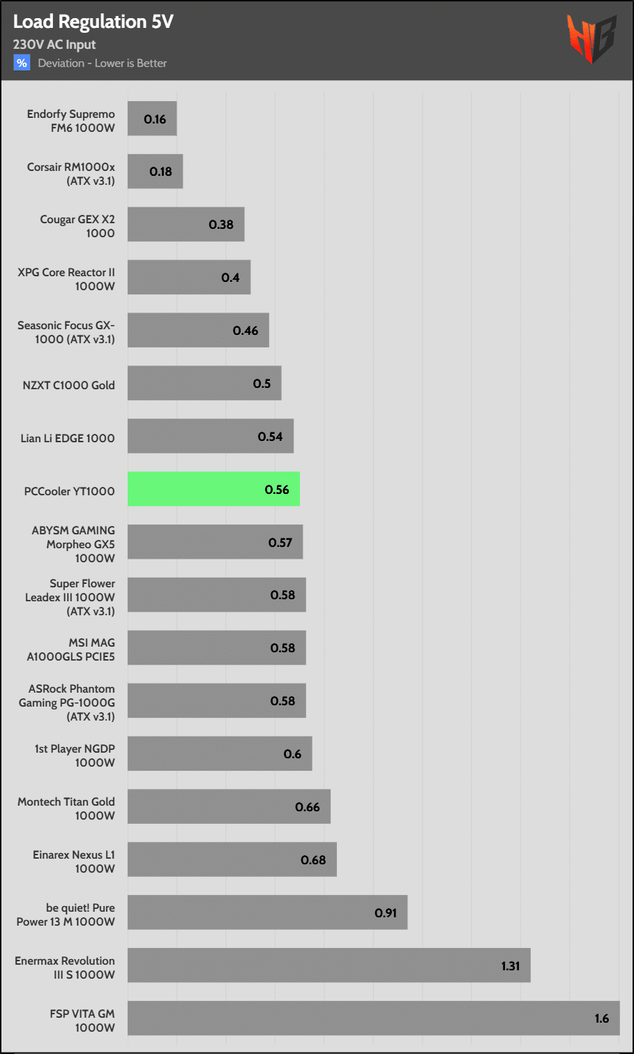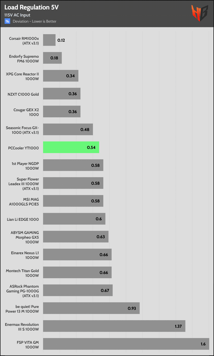 Test | 12V | 5V | 3.3V | 5VSB | DC/AC (Watts) | Efficiency | Fan Speed (RPM) | PSU Noise (dB[A]) | Temps (In/Out) | PF/AC Volts |