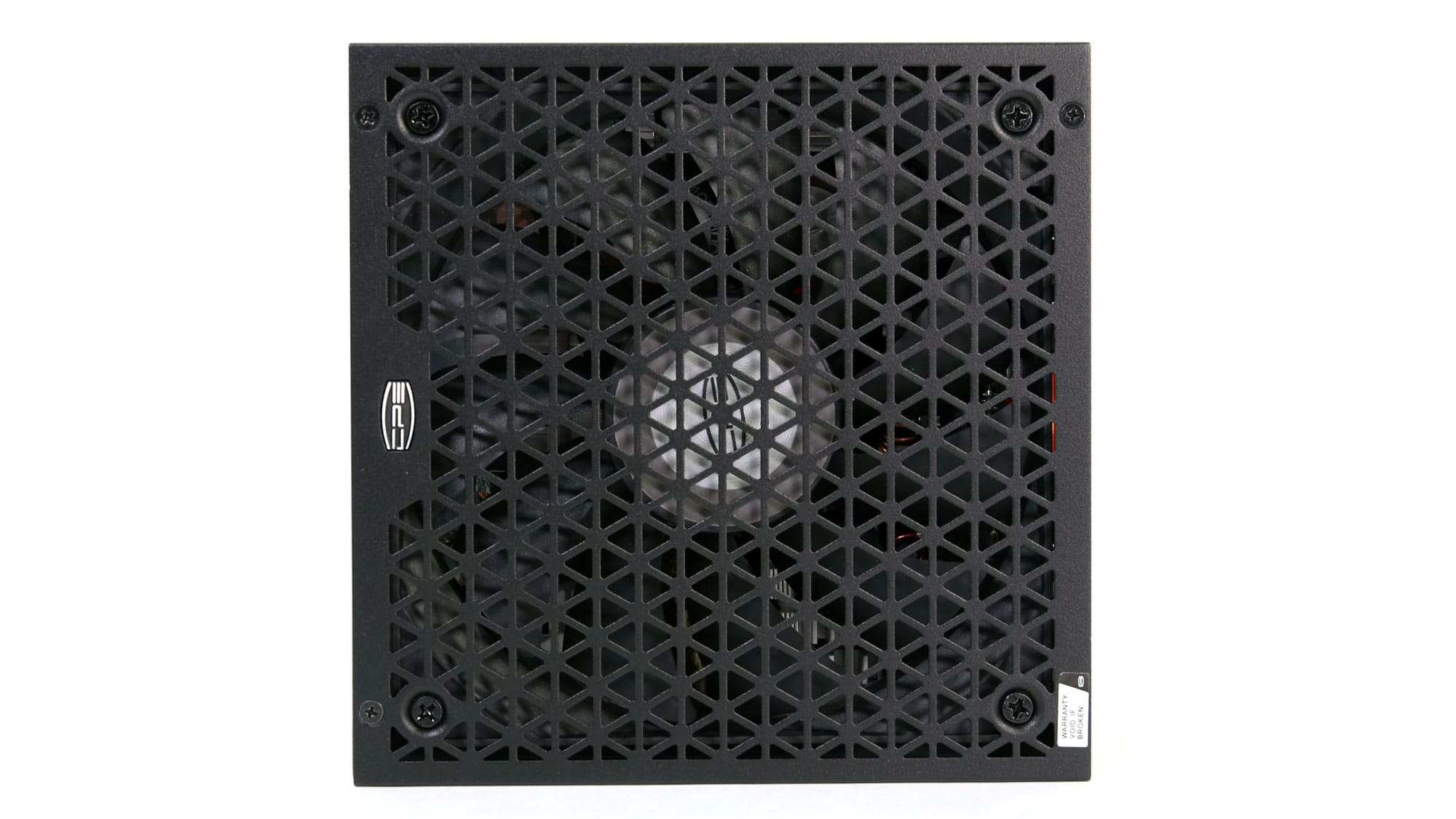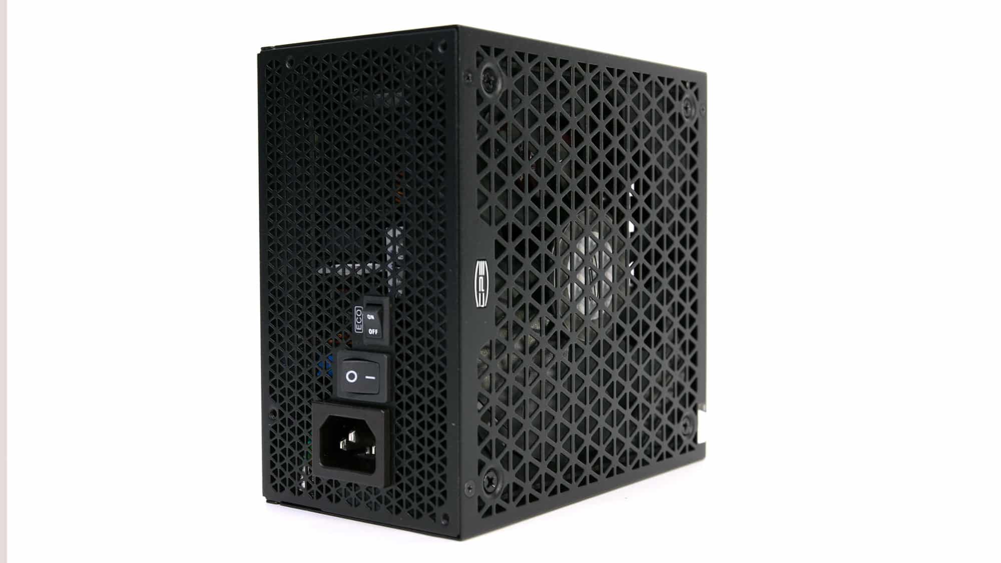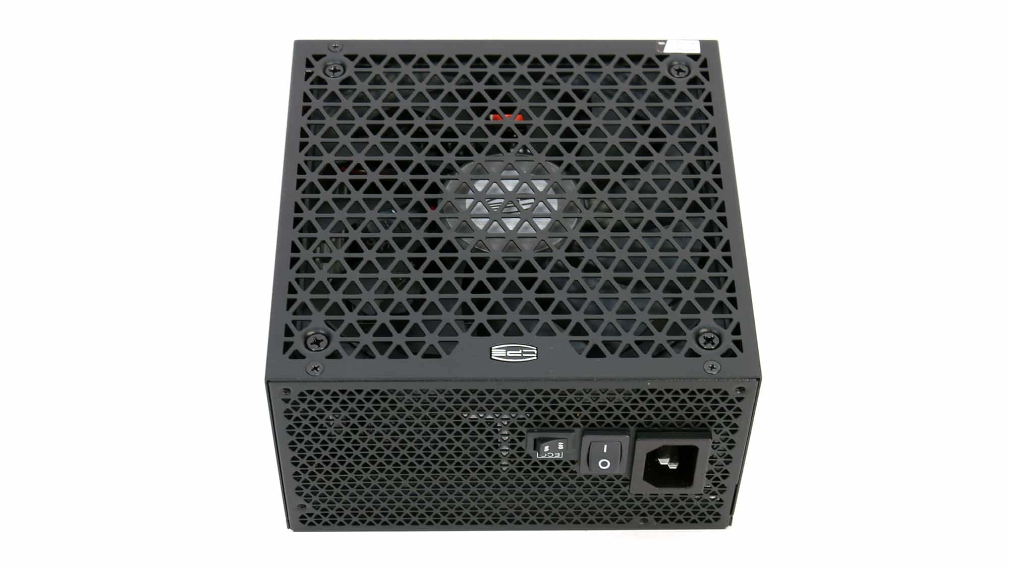 The exterior design stands out from the crowd due to the triangle perforations of the fan’s grille. On the front side, for the PSU’s exhaust, the same triangle-style perforations are used. On the same side, besides the AC receptacle and the power switch, you will also find a smaller switch for toggling the fan’s passive operation on or off.