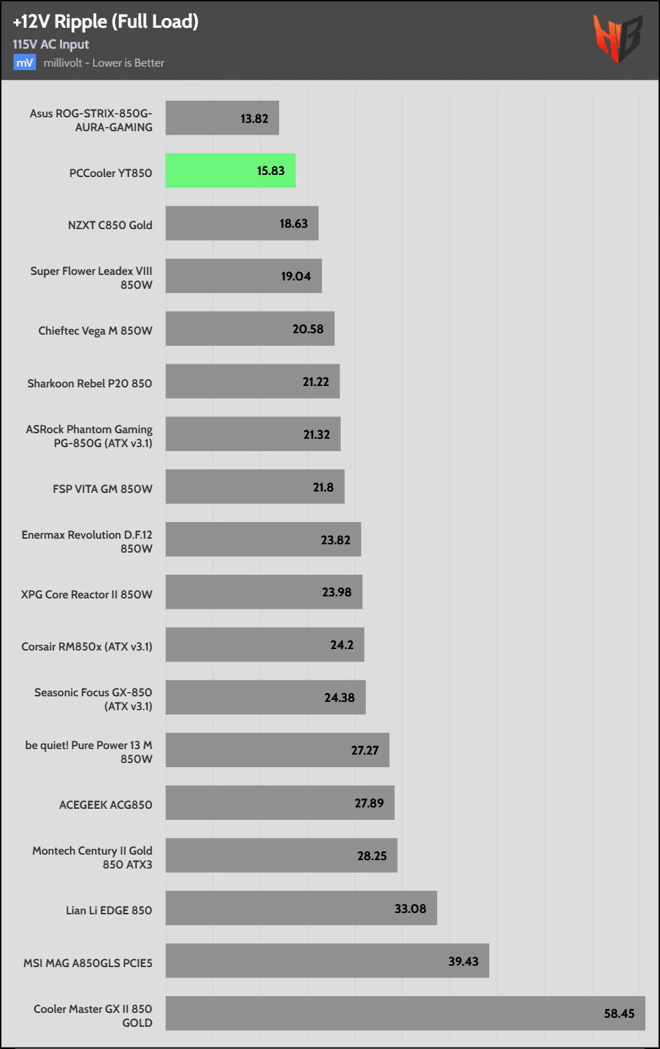 Test | 12V | 5V | 3.3V | 5VSB | DC/AC (Watts) | Efficiency | Fan Speed (RPM) | PSU Noise (dB[A]) | Temps (In/Out) | PF/AC Volts |