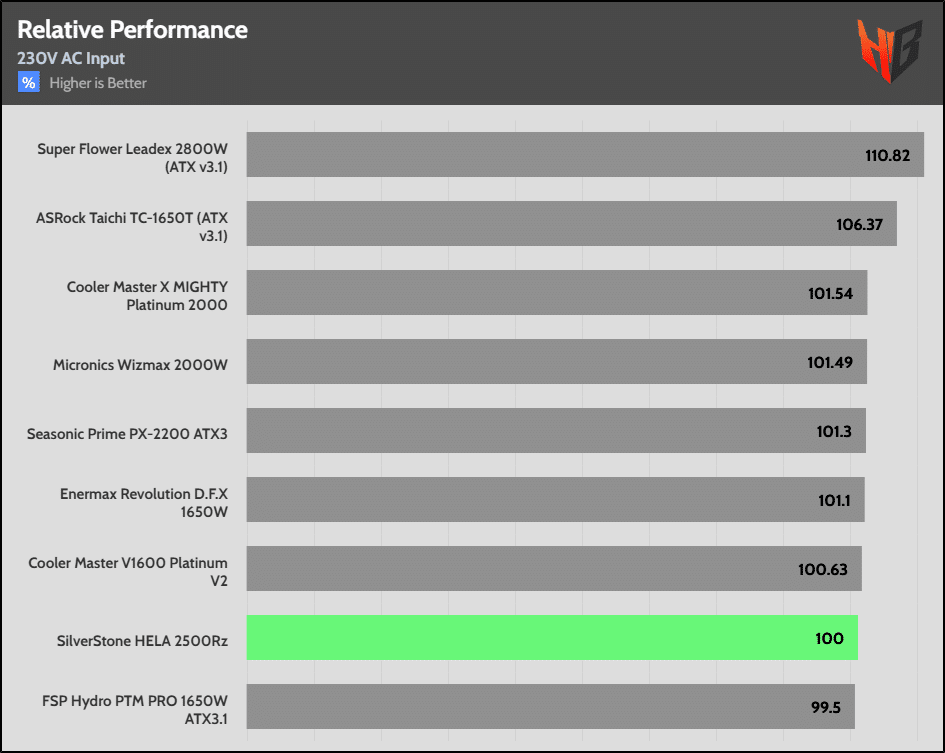 The PSU’s overall performance is comparable to most competing offerings, except for the Leadex 2800W, which is the only PSU more powerful than the Hela 2500Rz.
