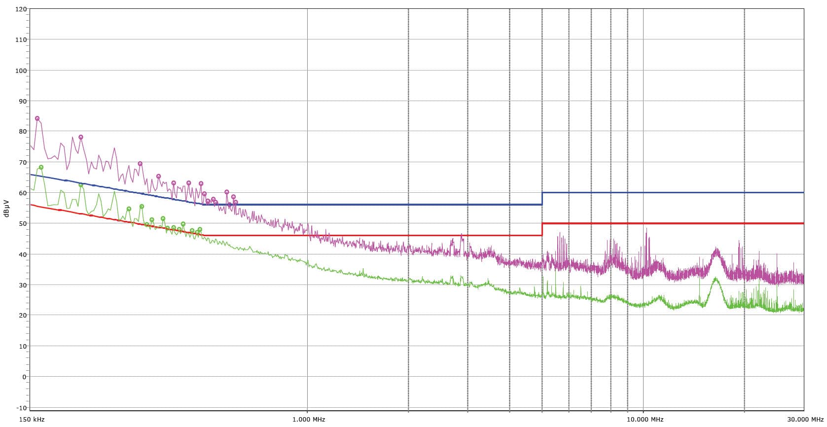 The PSU’s conducted emissions are too high under low frequencies under both average and peak EMI detectors.