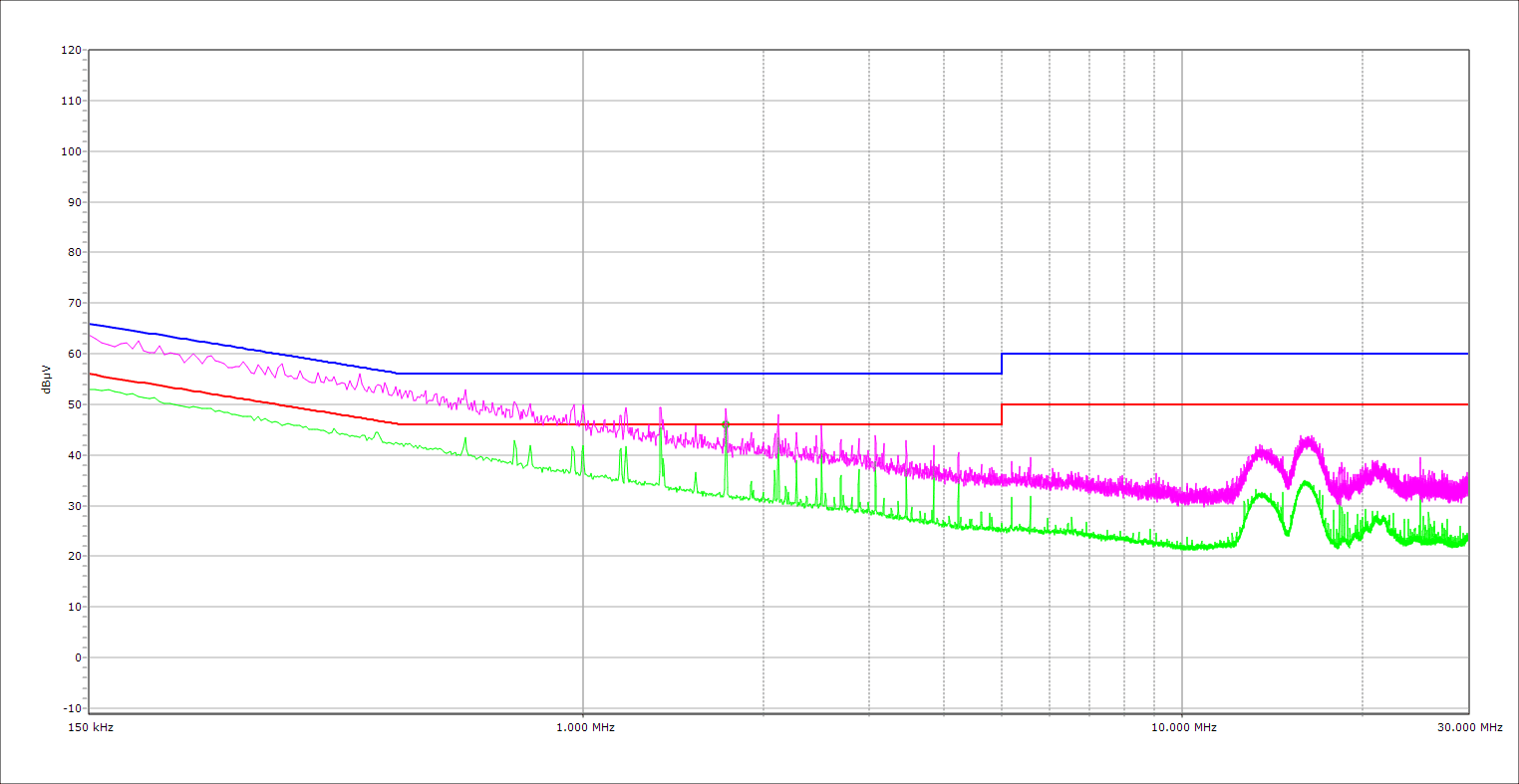 The PSU’s conducted emissions are below the respective limits at both the average and peak EMI detectors.