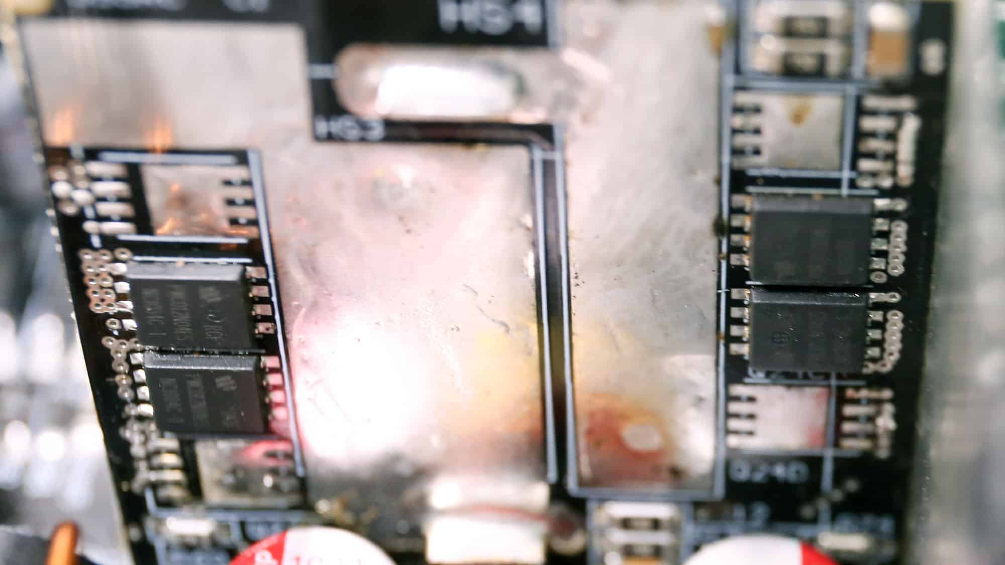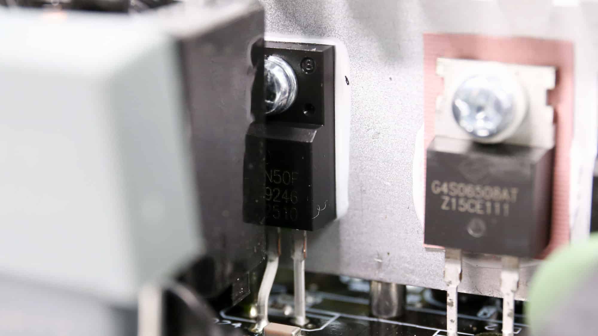 The APFC converter uses two PingWei PWE180N65SFMF FETs and one Global Power G4S06508AT boost diode. Chemi-Con manufactures the bulk capacitor, with a capacity of 470uF. It is rated for 2,000 hours at 105 °C. Its voltage rating is borderline at 400V, given that the APFC’s DC bus voltage is approximately 380V DC.