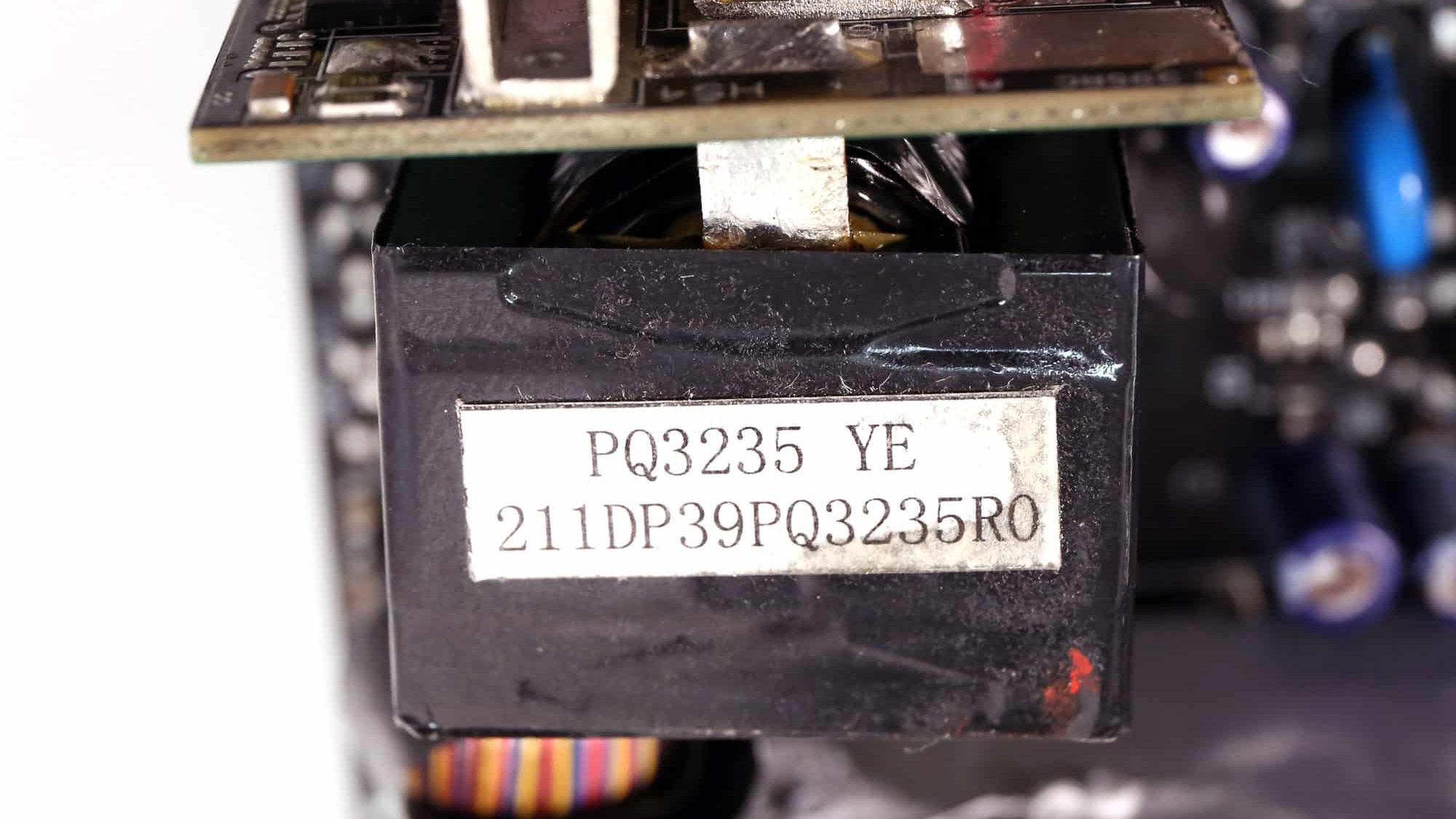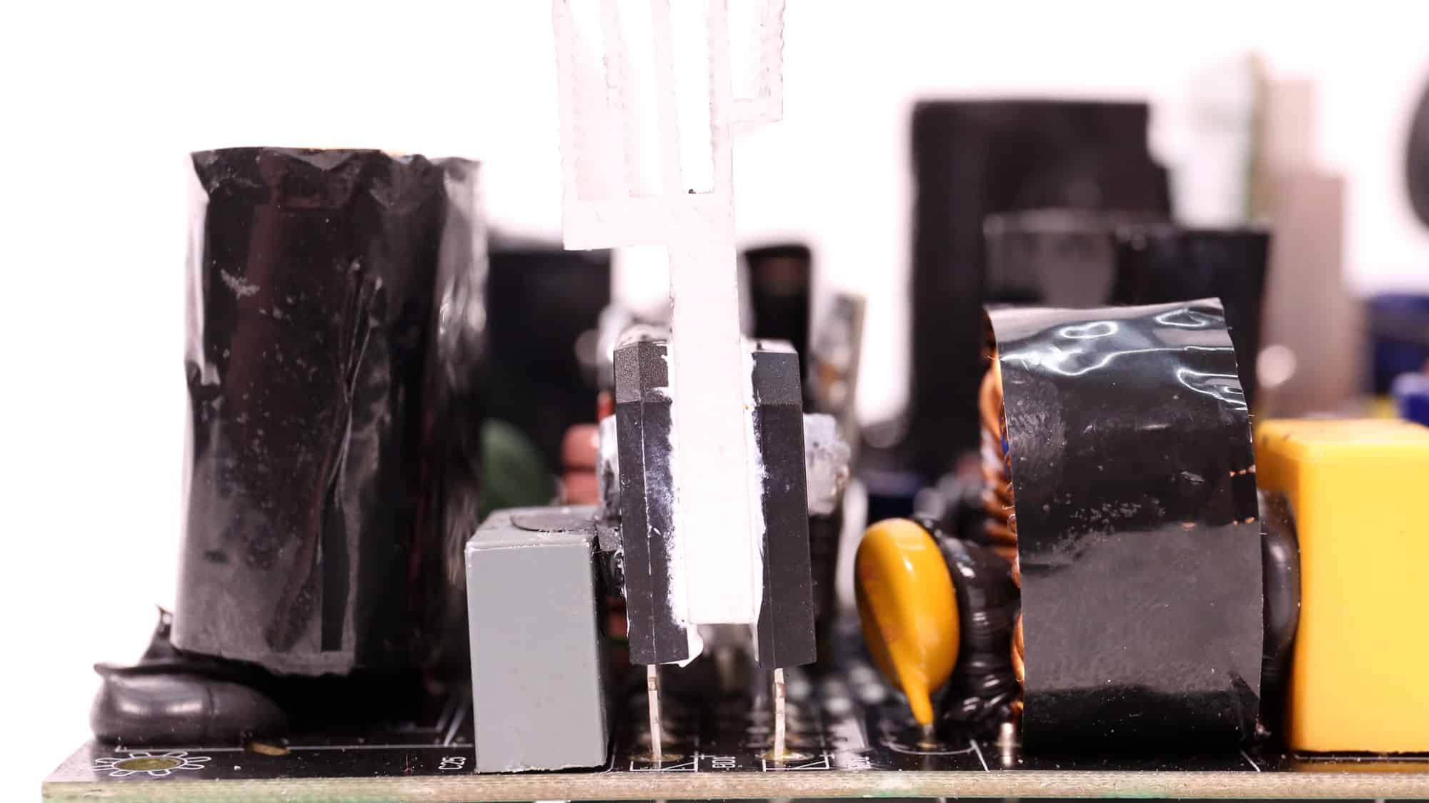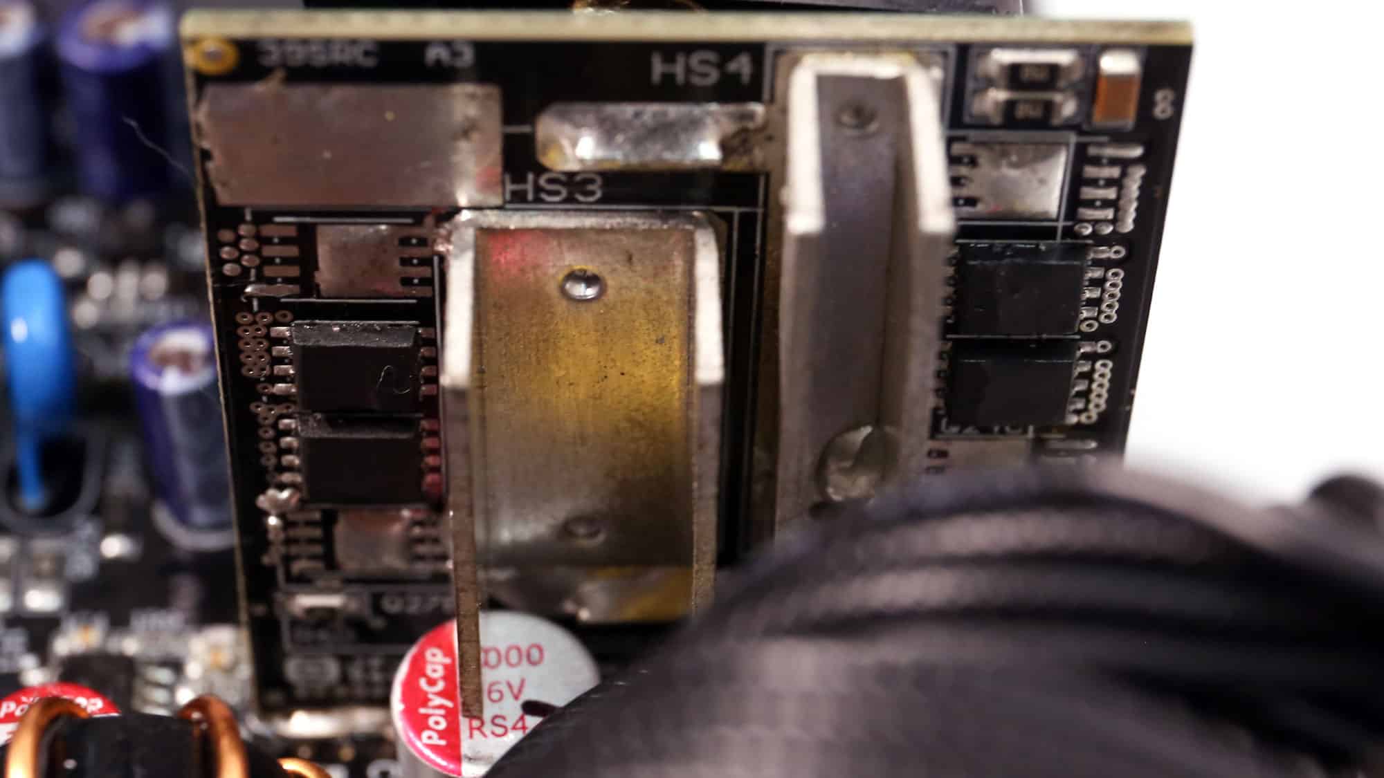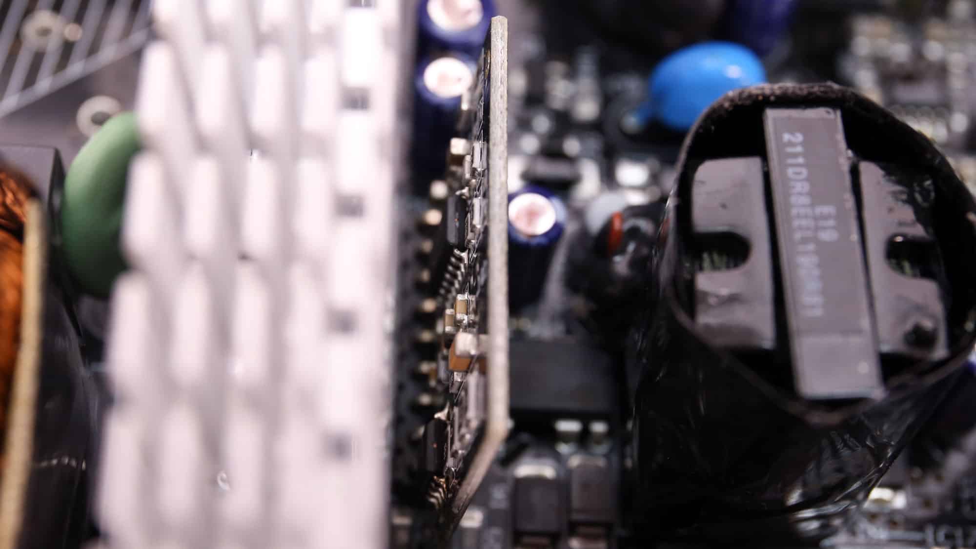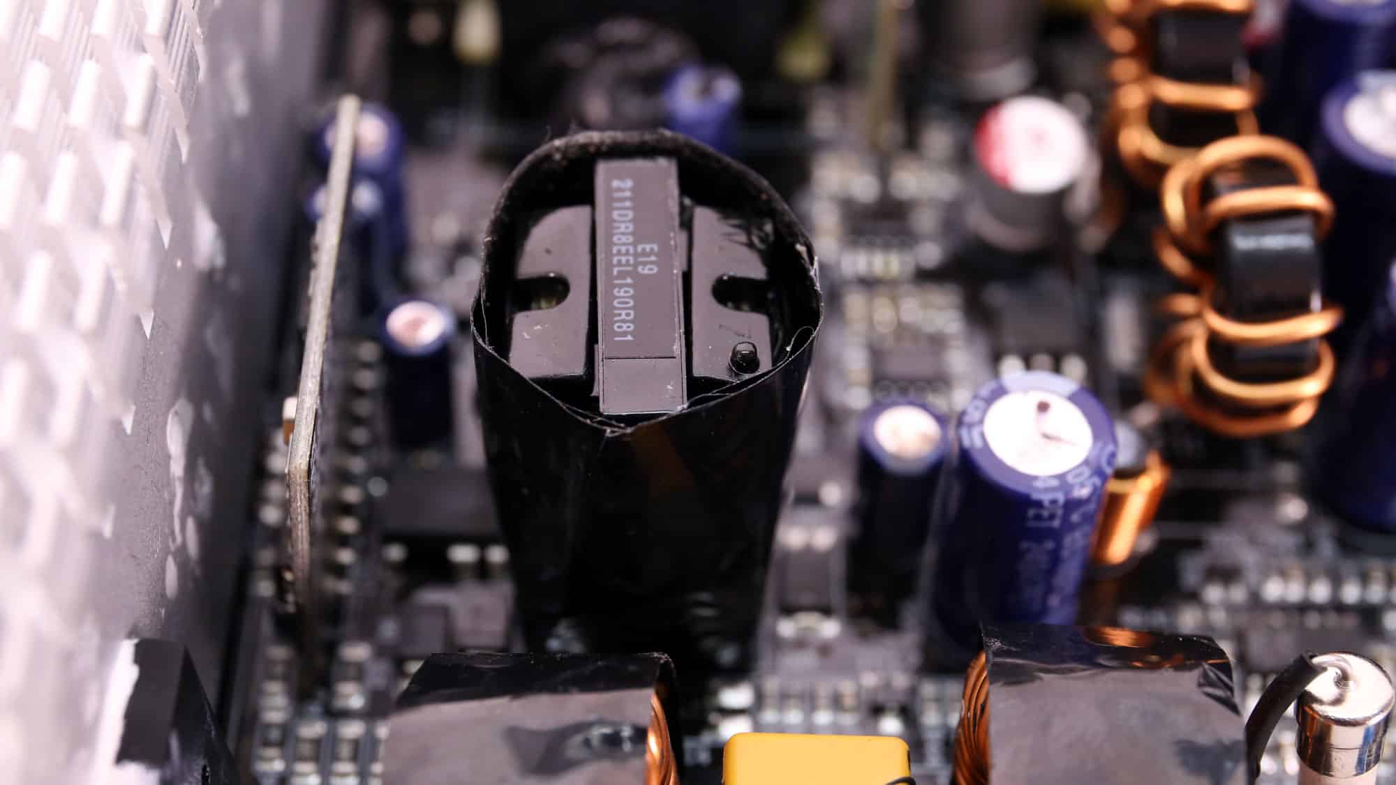The PSU’s main transformer. It comes into direct contact with the PCB holding the 12V FETs, resulting in decreased power losses.