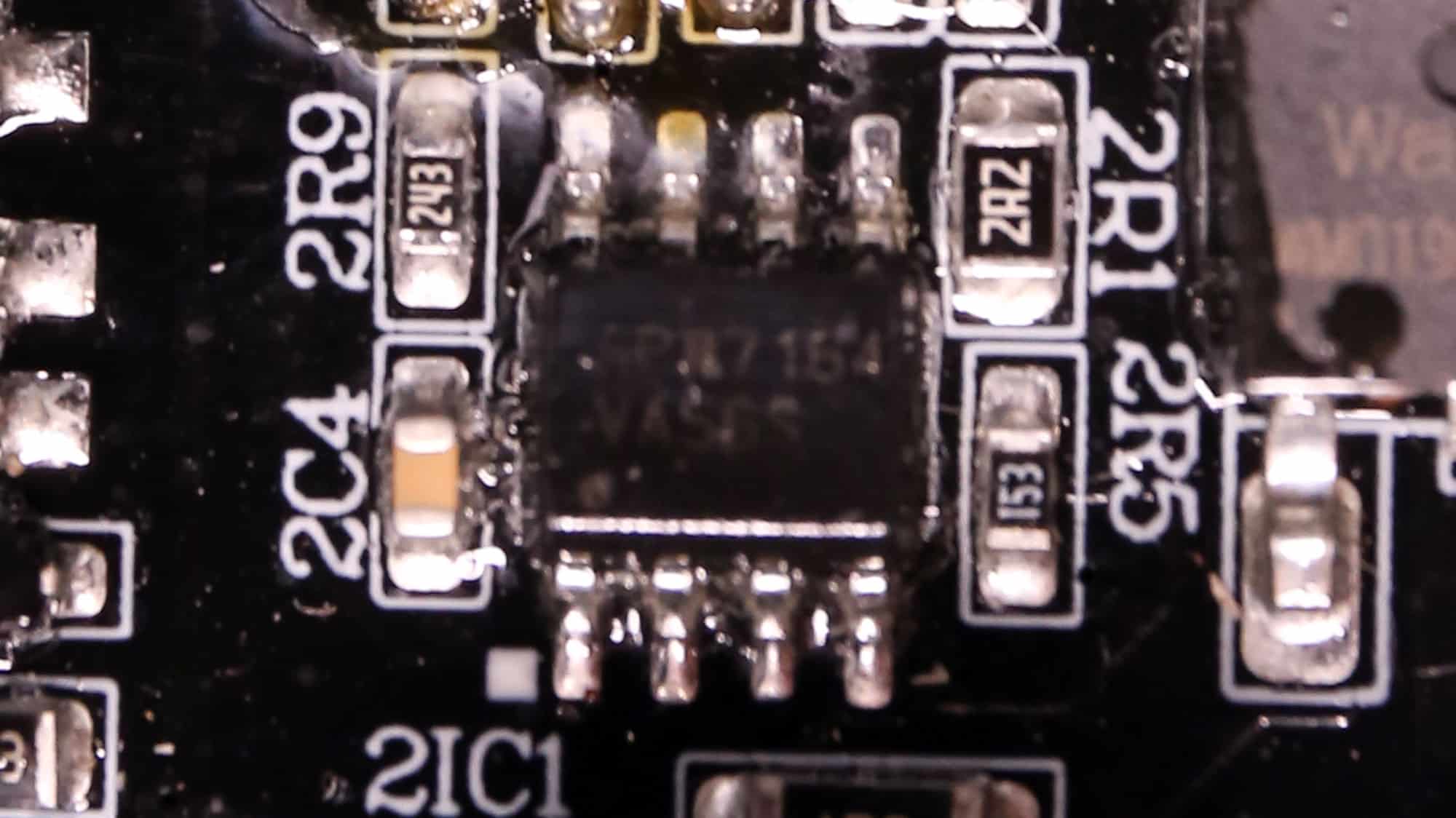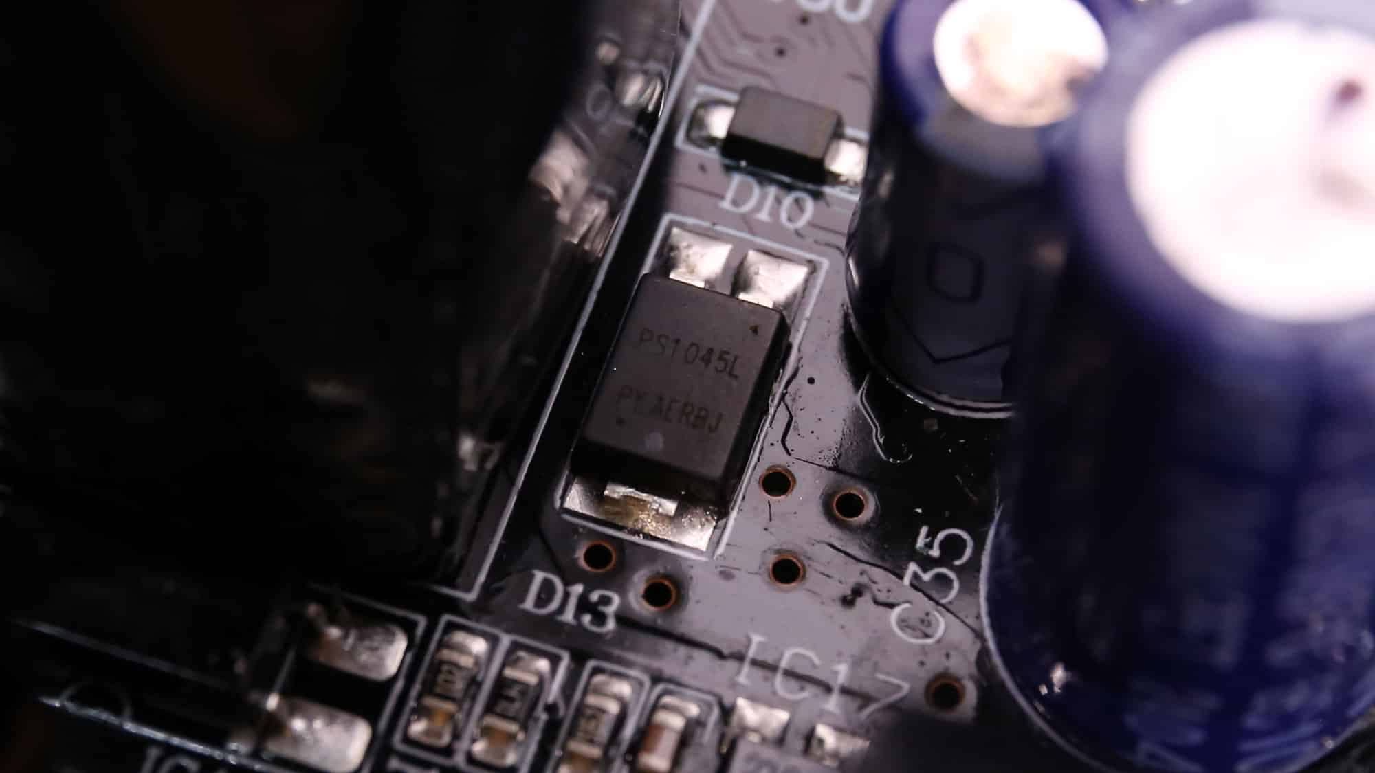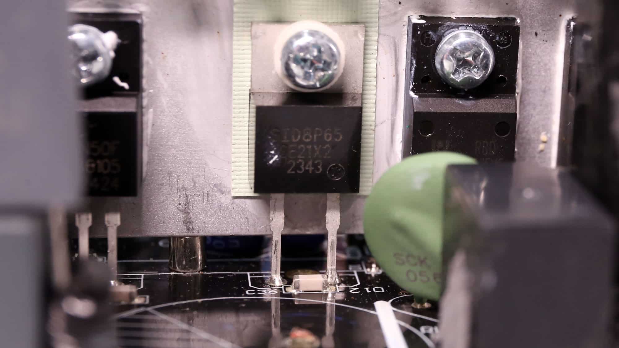 The APFC converter uses two Perfect PWE180N65MFS FETs and one SID8P65 boost diode. Hitachi manufactures the bulk capacitor. Its capacity is 470 μF, and it is rated for 4,000 h at 105 °C. It would be nice if its voltage rating were at 420V since 400V is too close to the APFC’s DC bus voltage (approximately 380V DC).