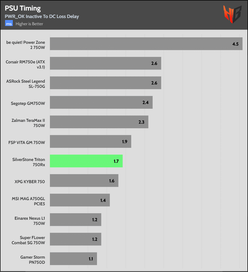 The hold-up time is notably lower than 17ms. Still, it exceeds the 12ms limit set by the ATX v3.1 specification. Moreover, the power ok signal is accurate.