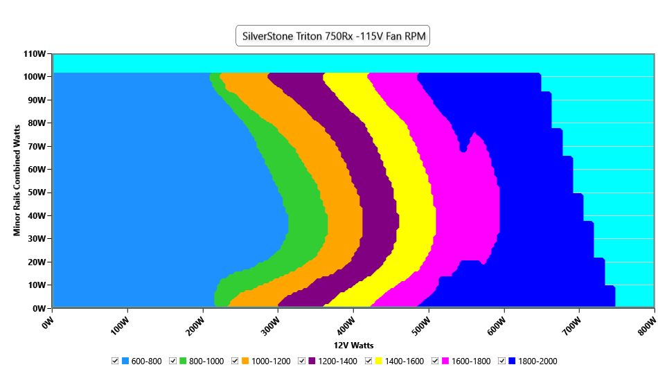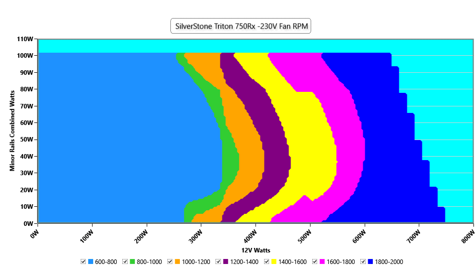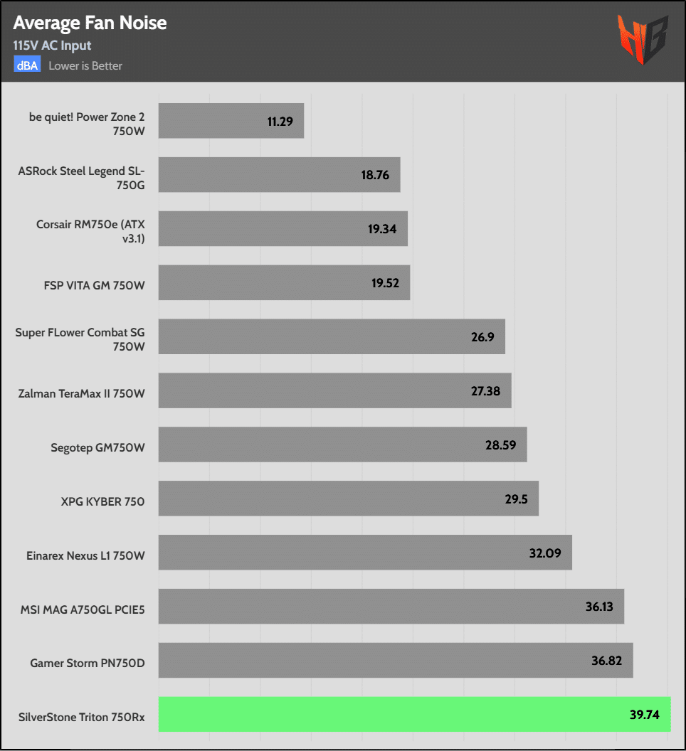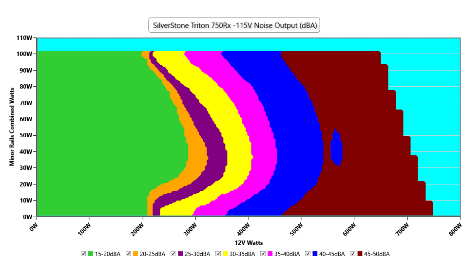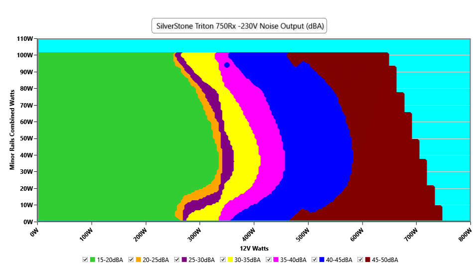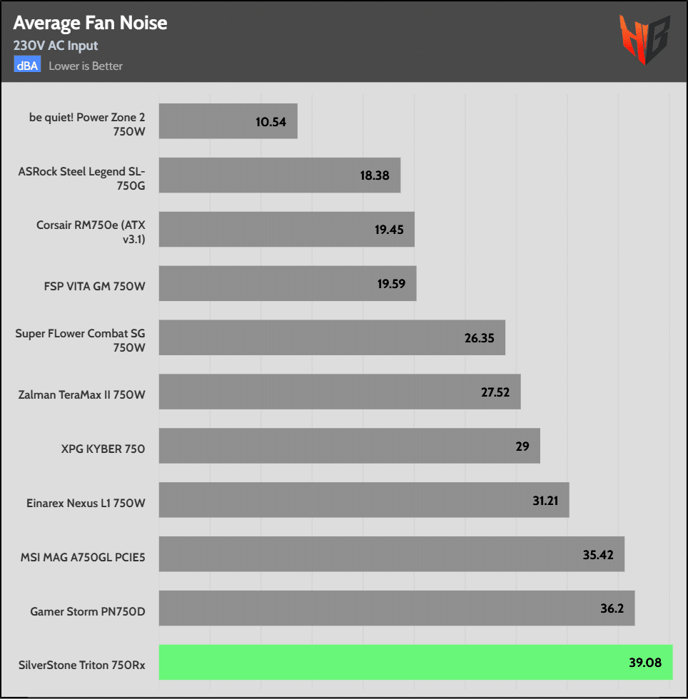 The fan speed profile is aggressive. Unlike the 850W model, the average noise at 230V is lower than the average noise at 115V.